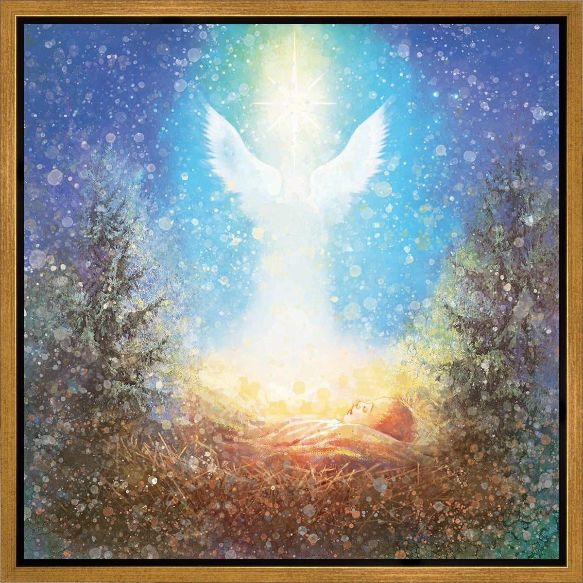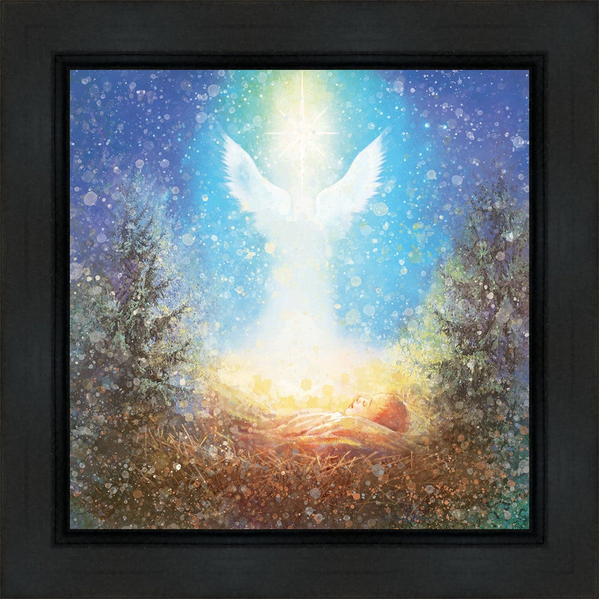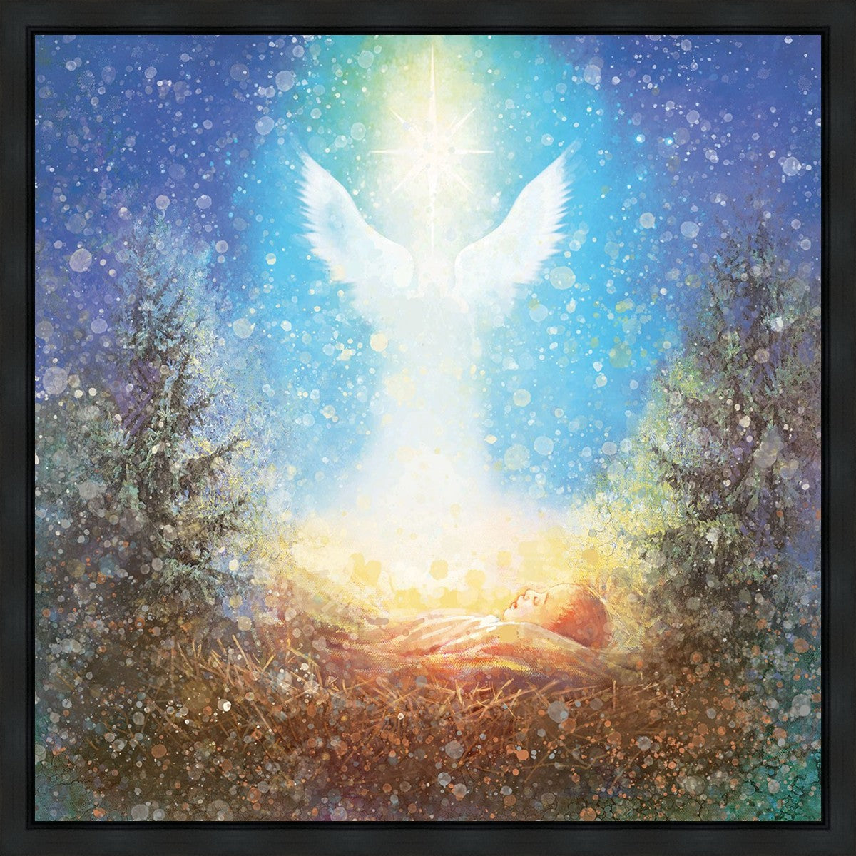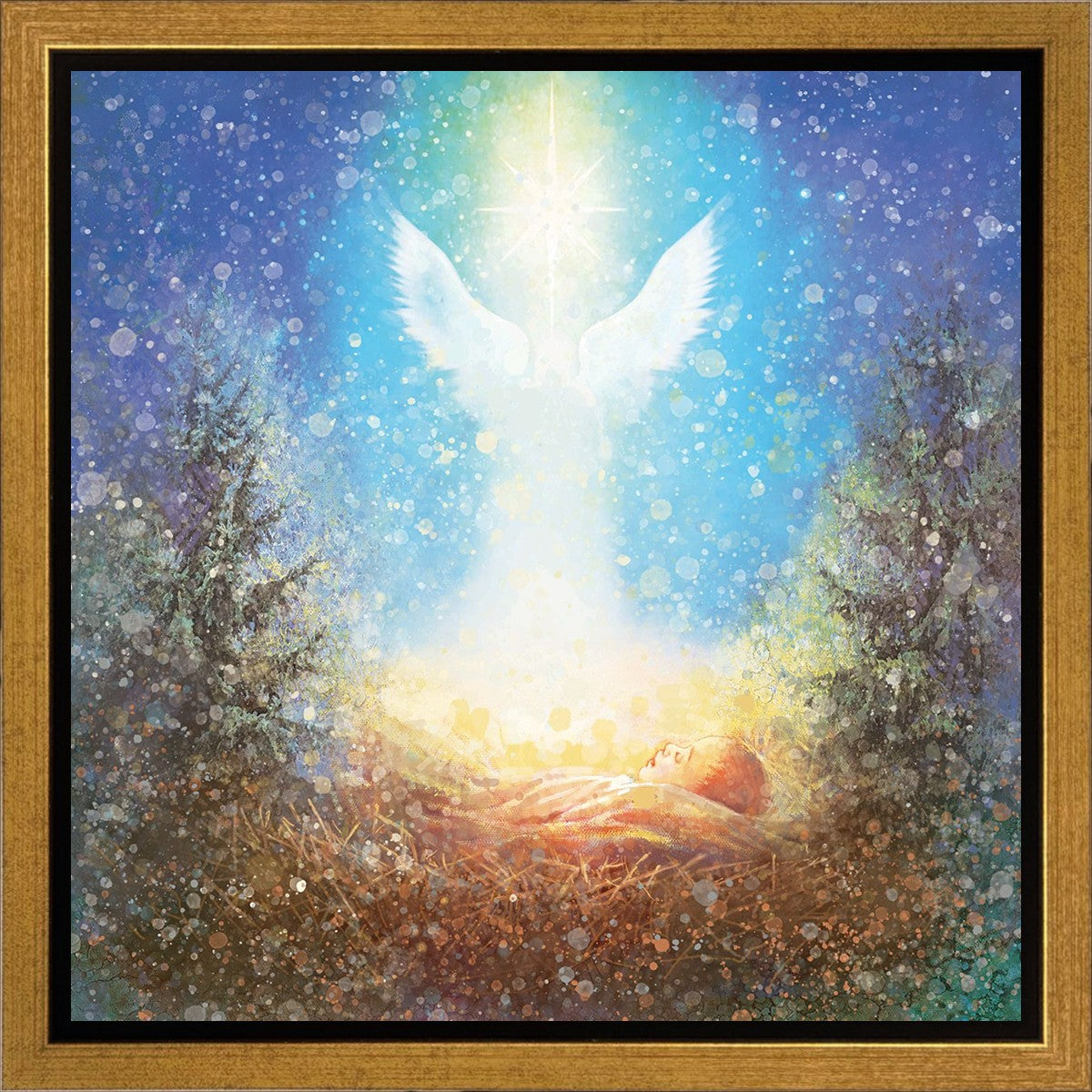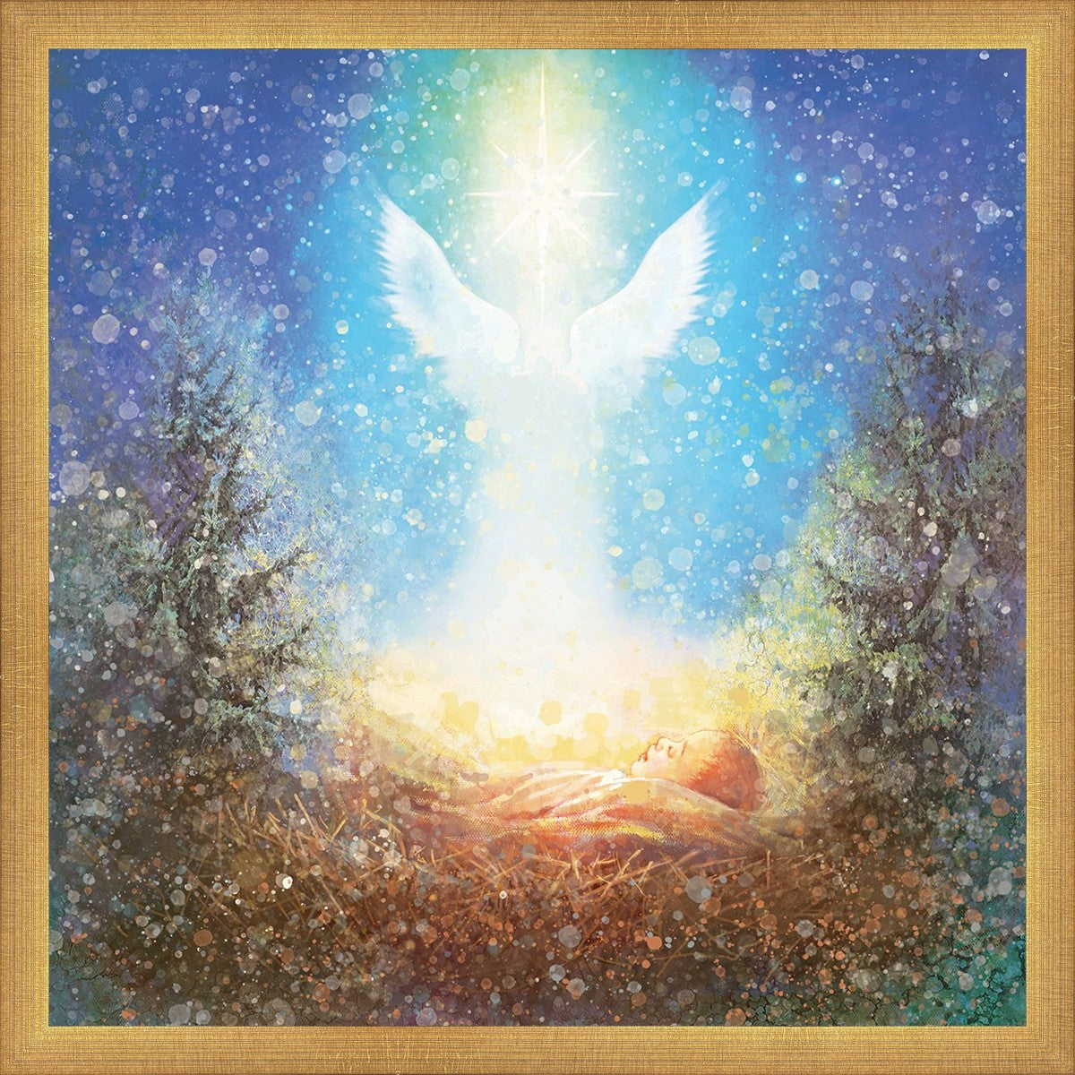 I Bring You Good News by Yongsung Kim features a nativiy with the angel Gabriel appearing above the newborn baby jesus against a colorful, jubuliant background