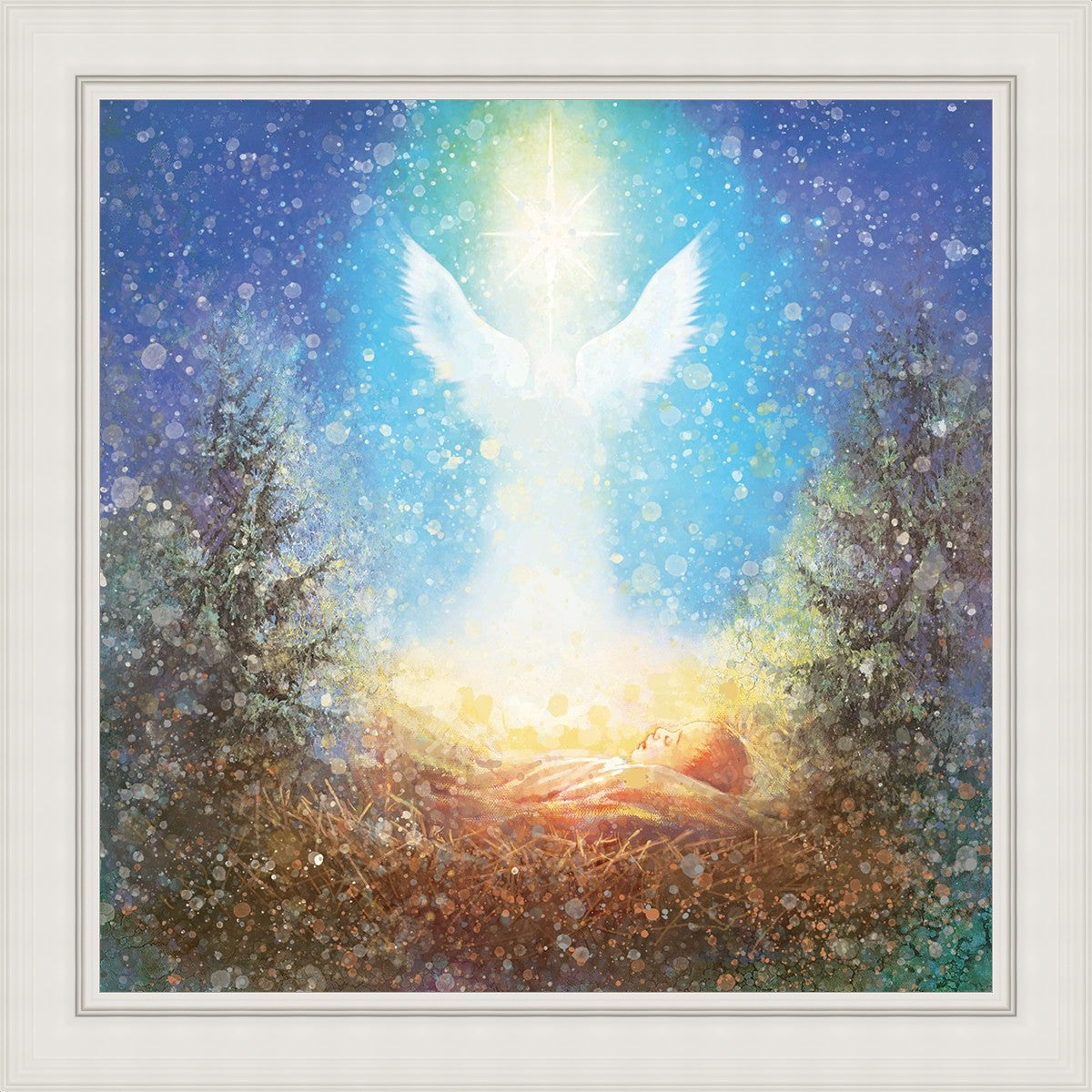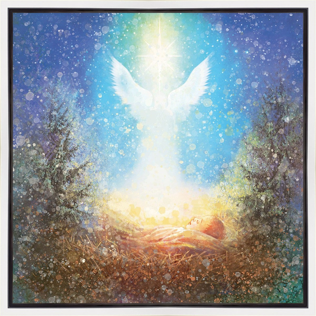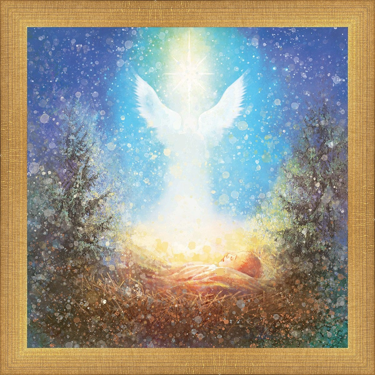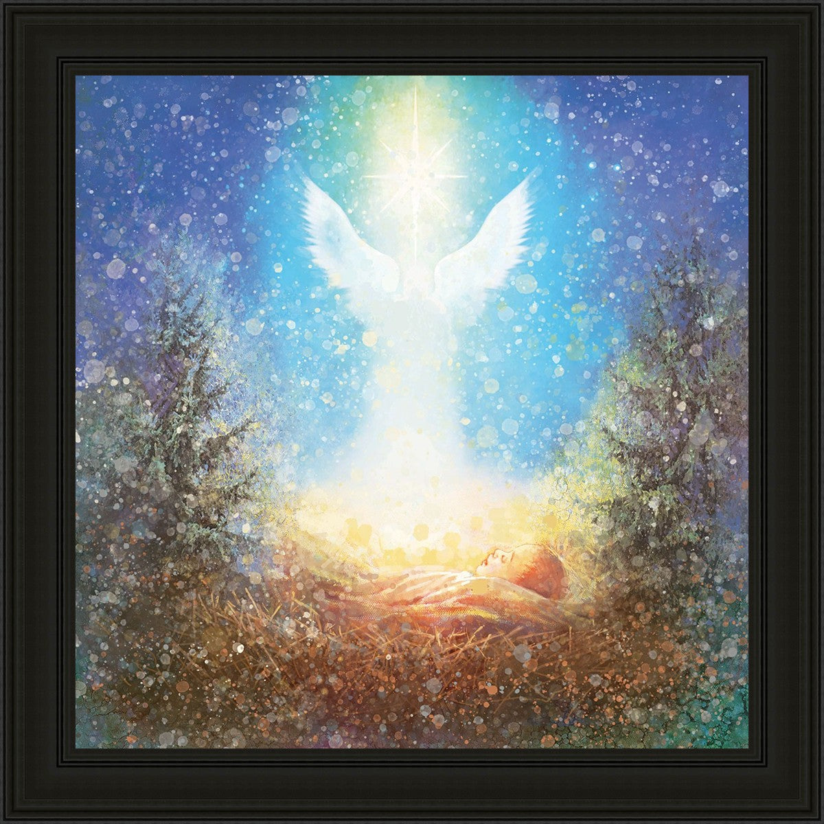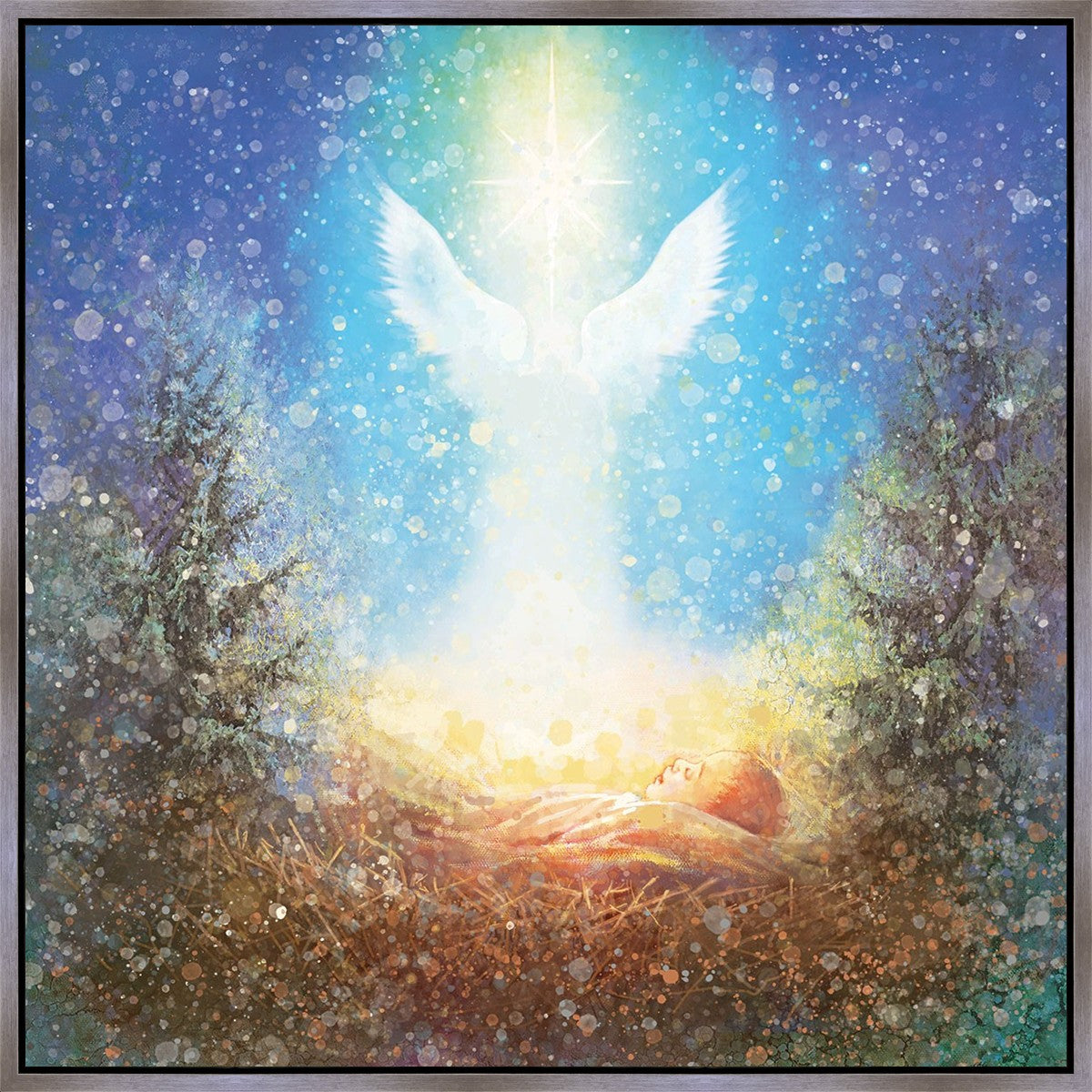 I Bring You Good News by Yongsung Kim features a nativiy with the angel Gabriel appearing above the newborn baby jesus against a colorful, jubuliant background