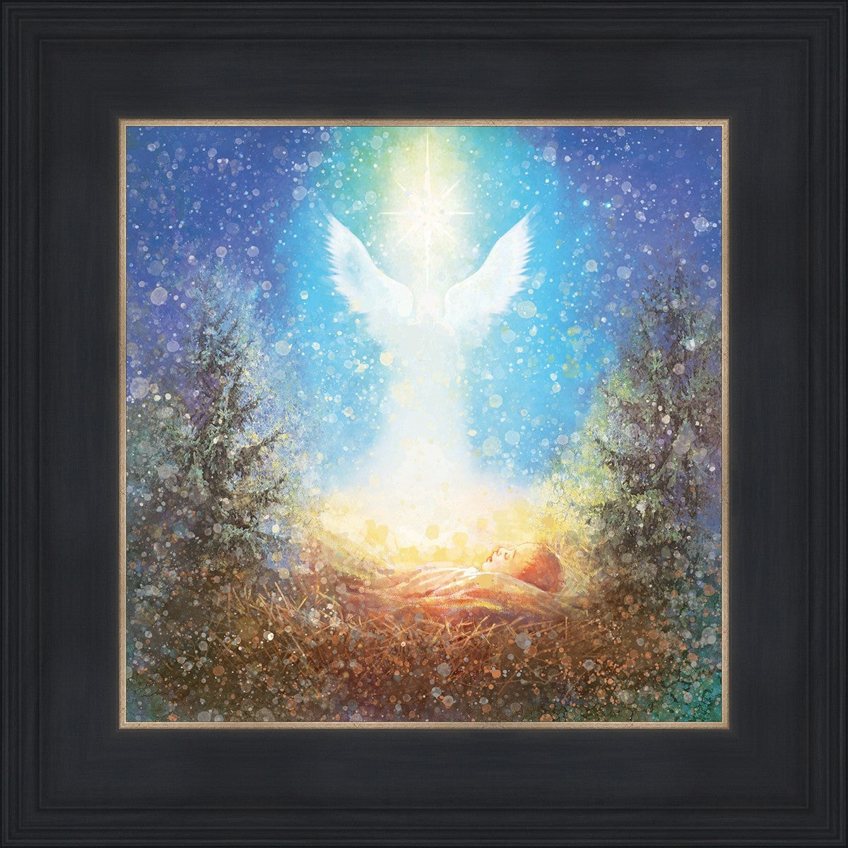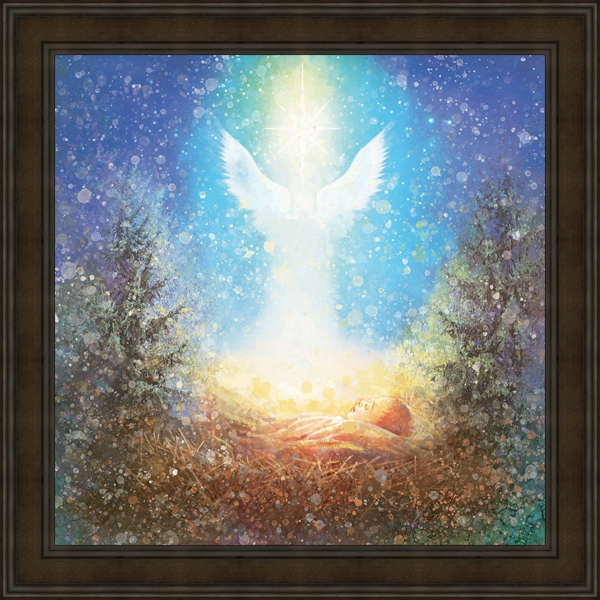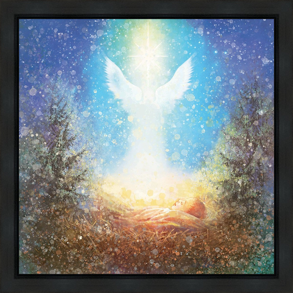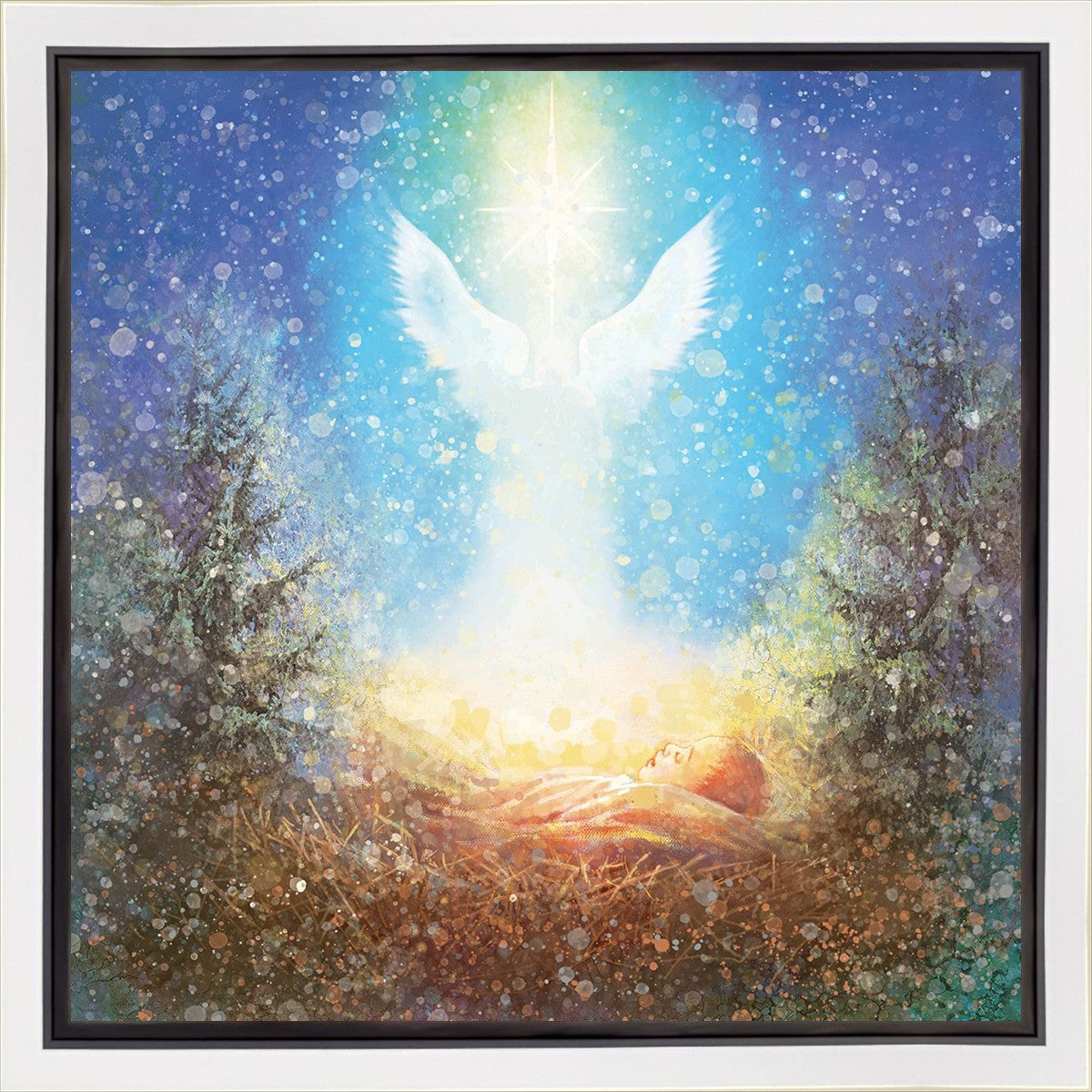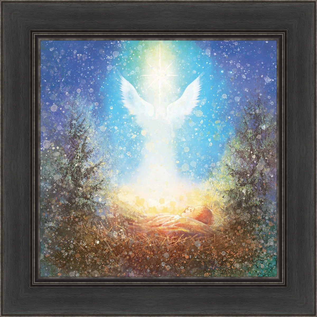 I Bring You Good News by Yongsung Kim features a nativiy with the angel Gabriel appearing above the newborn baby jesus against a colorful, jubuliant background