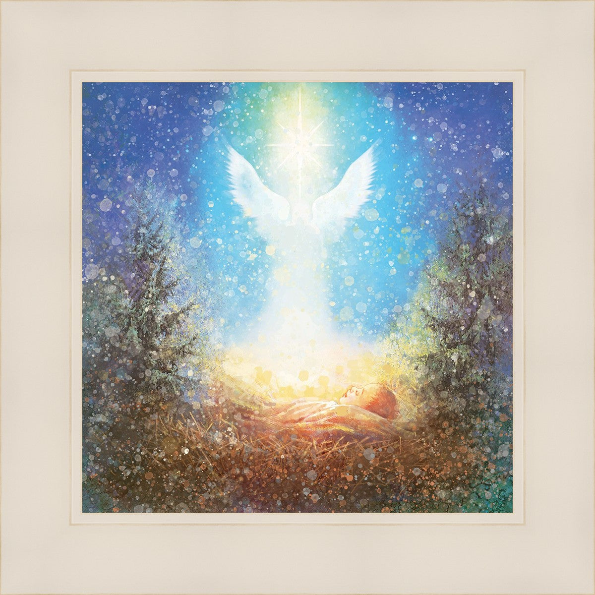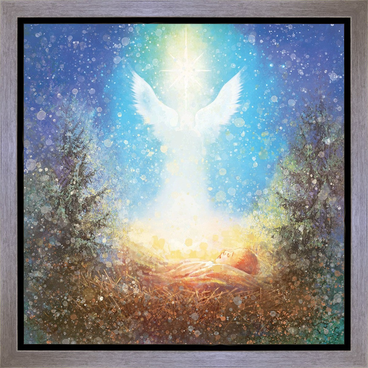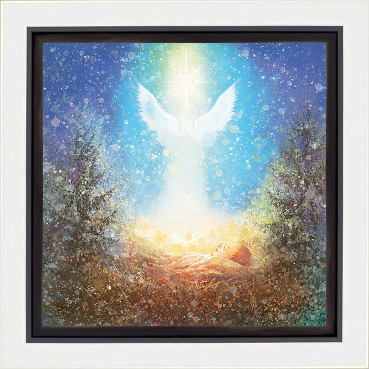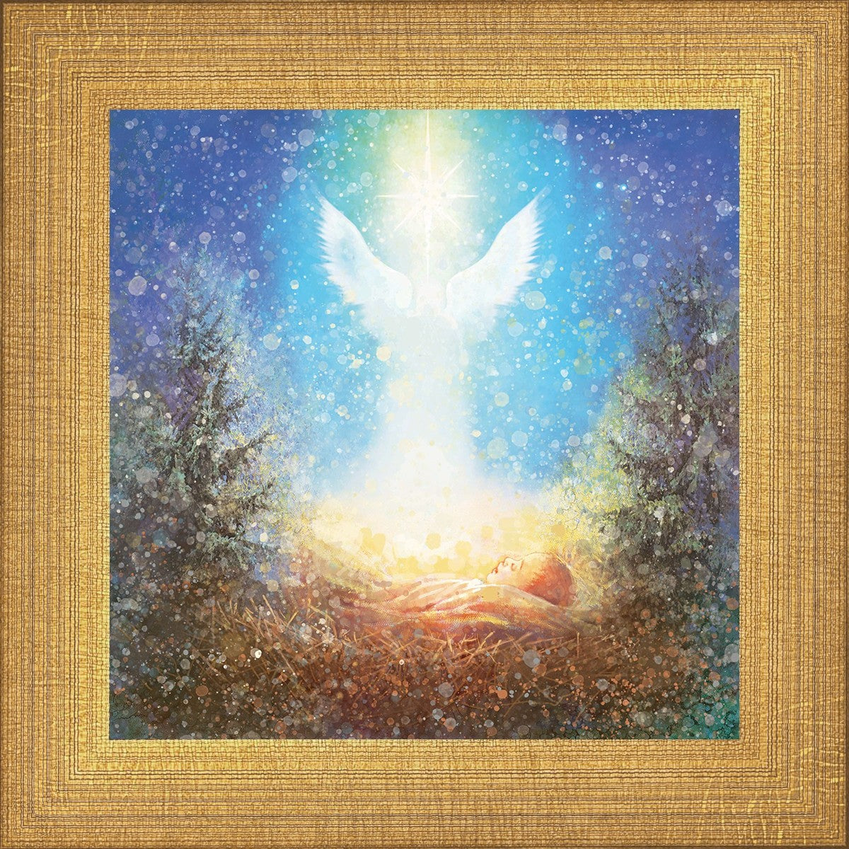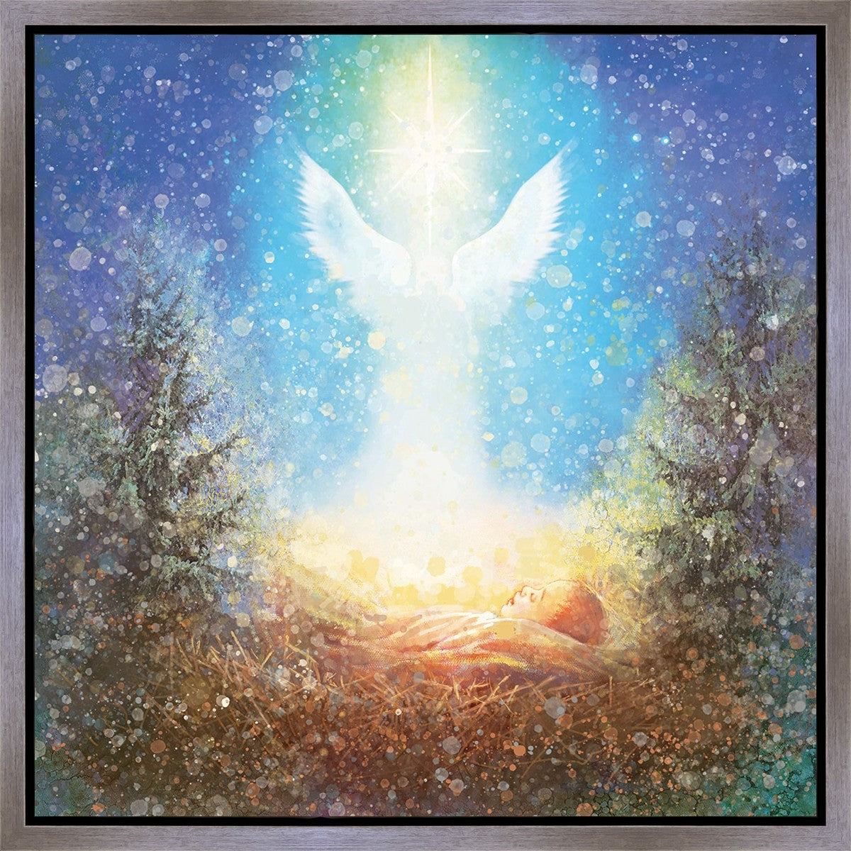 I Bring You Good News by Yongsung Kim features a nativiy with the angel Gabriel appearing above the newborn baby jesus against a colorful, jubuliant background