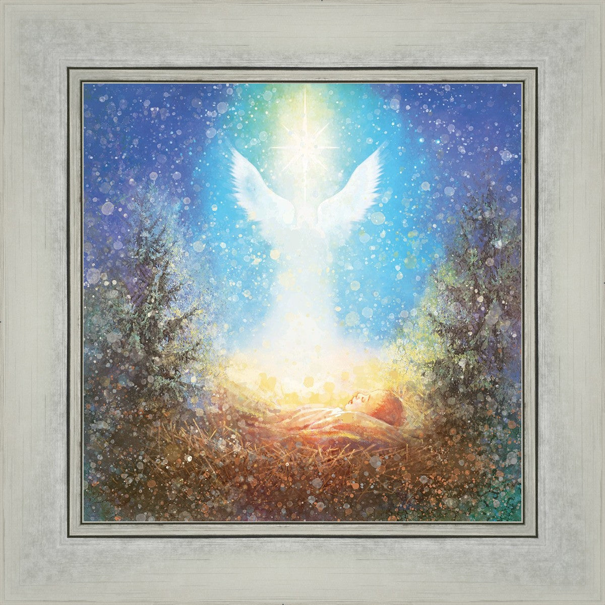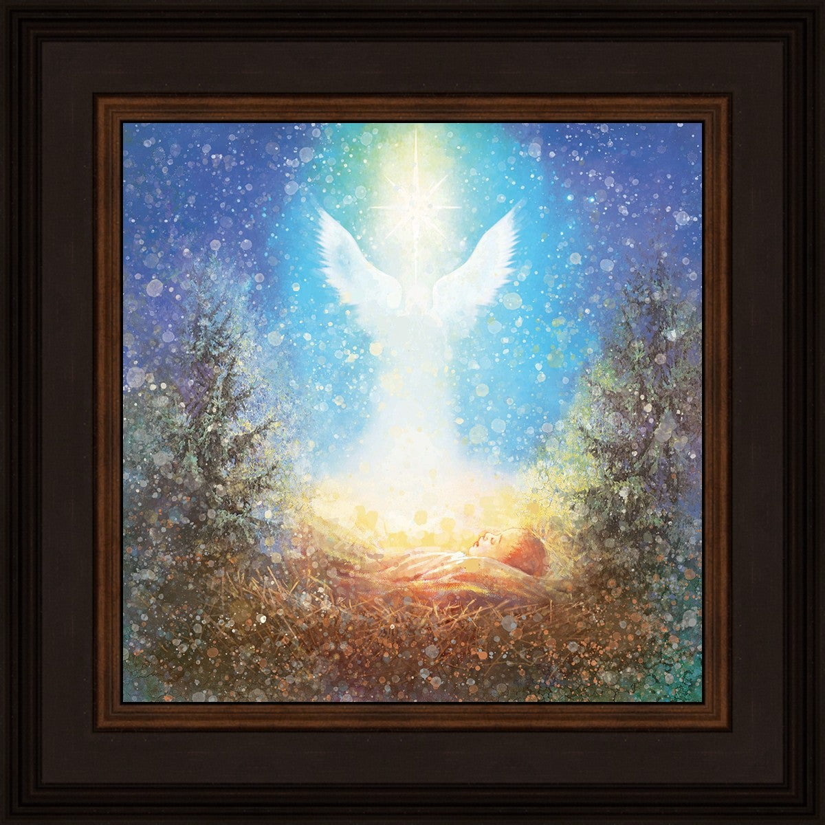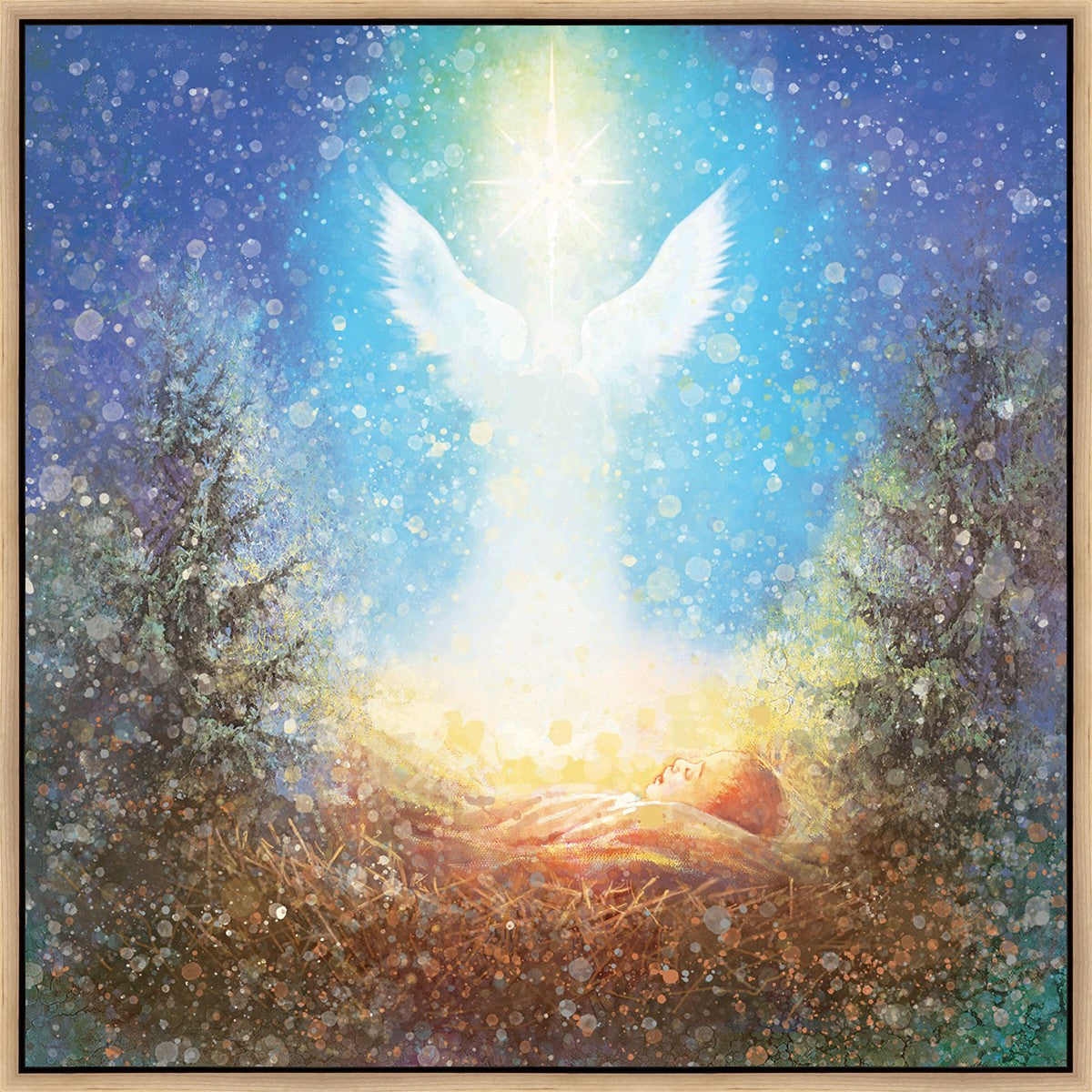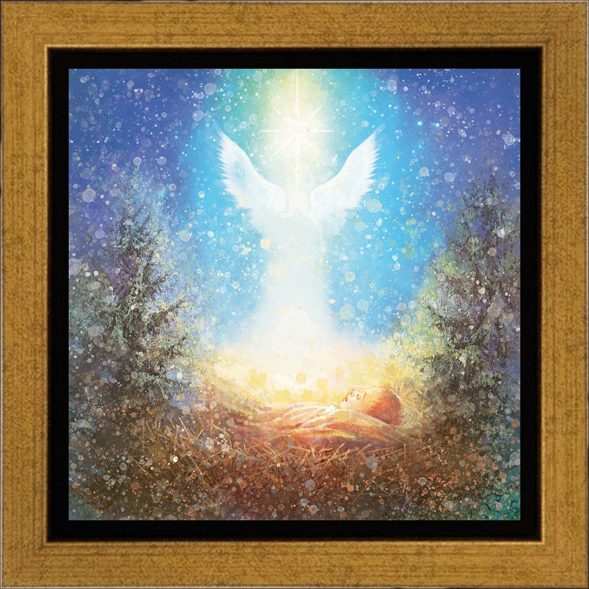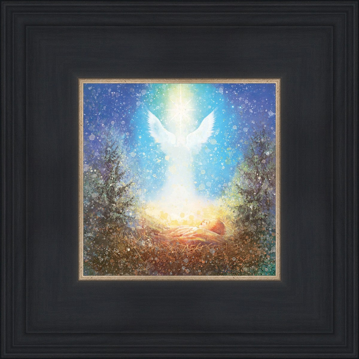 I Bring You Good News by Yongsung Kim features a nativiy with the angel Gabriel appearing above the newborn baby jesus against a colorful, jubuliant background
