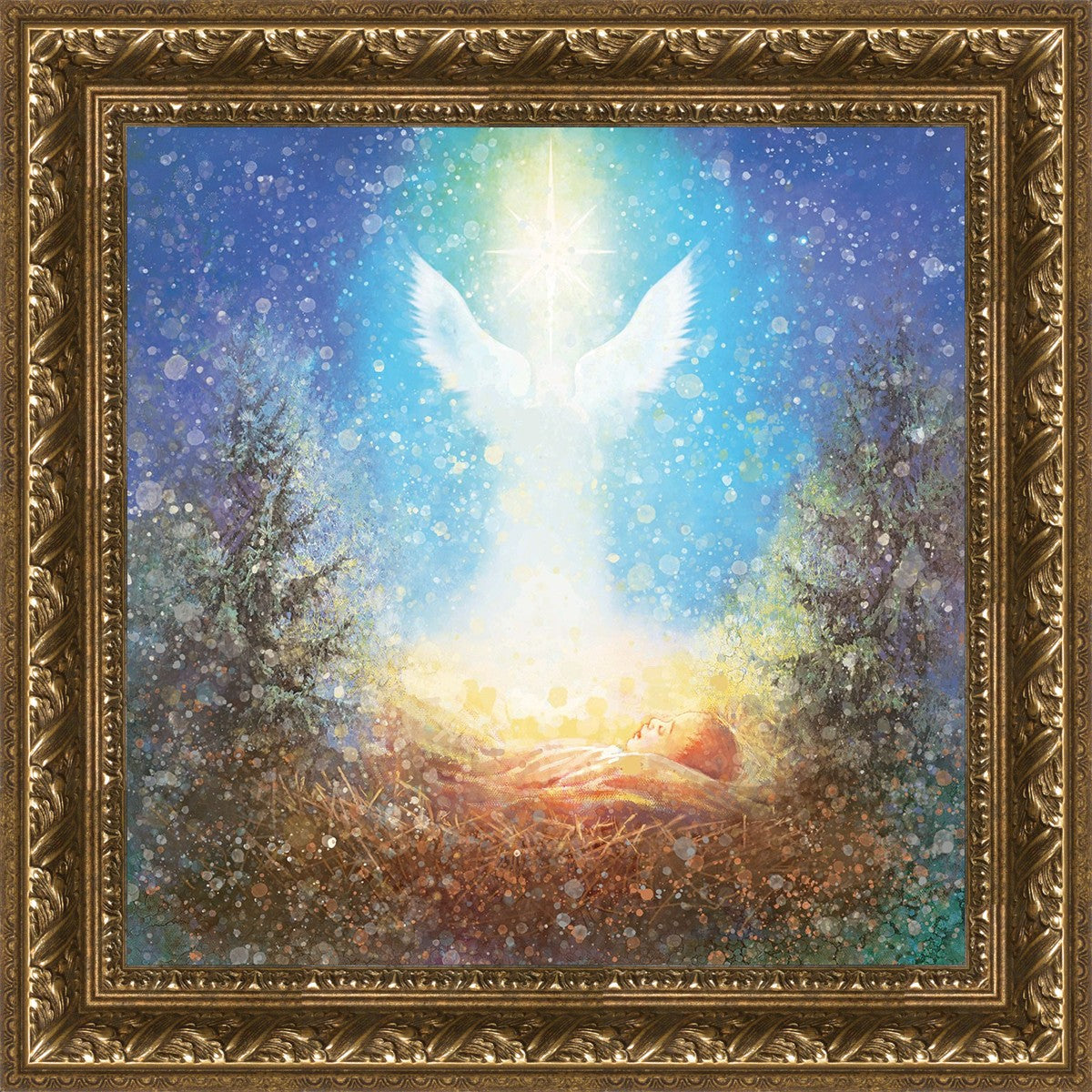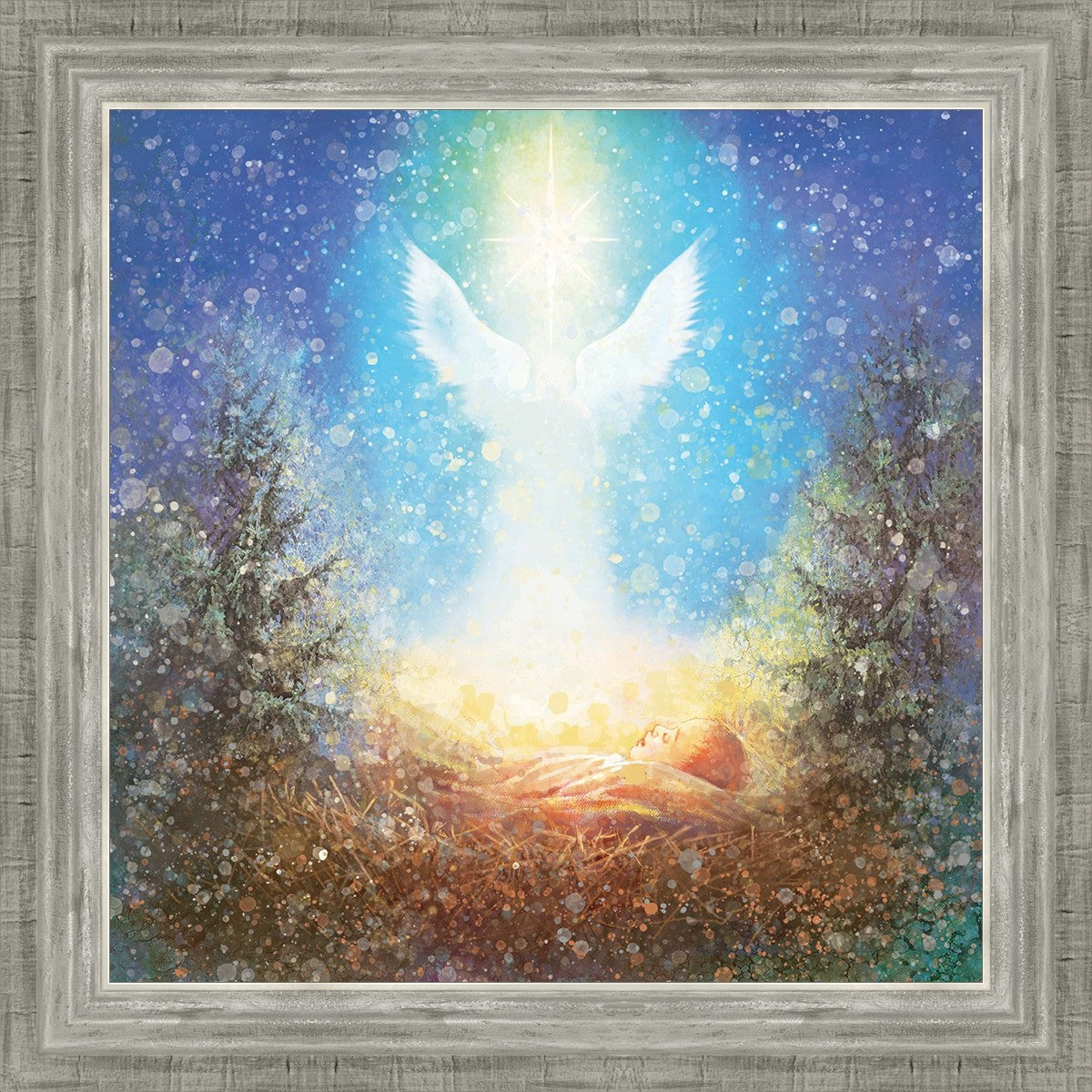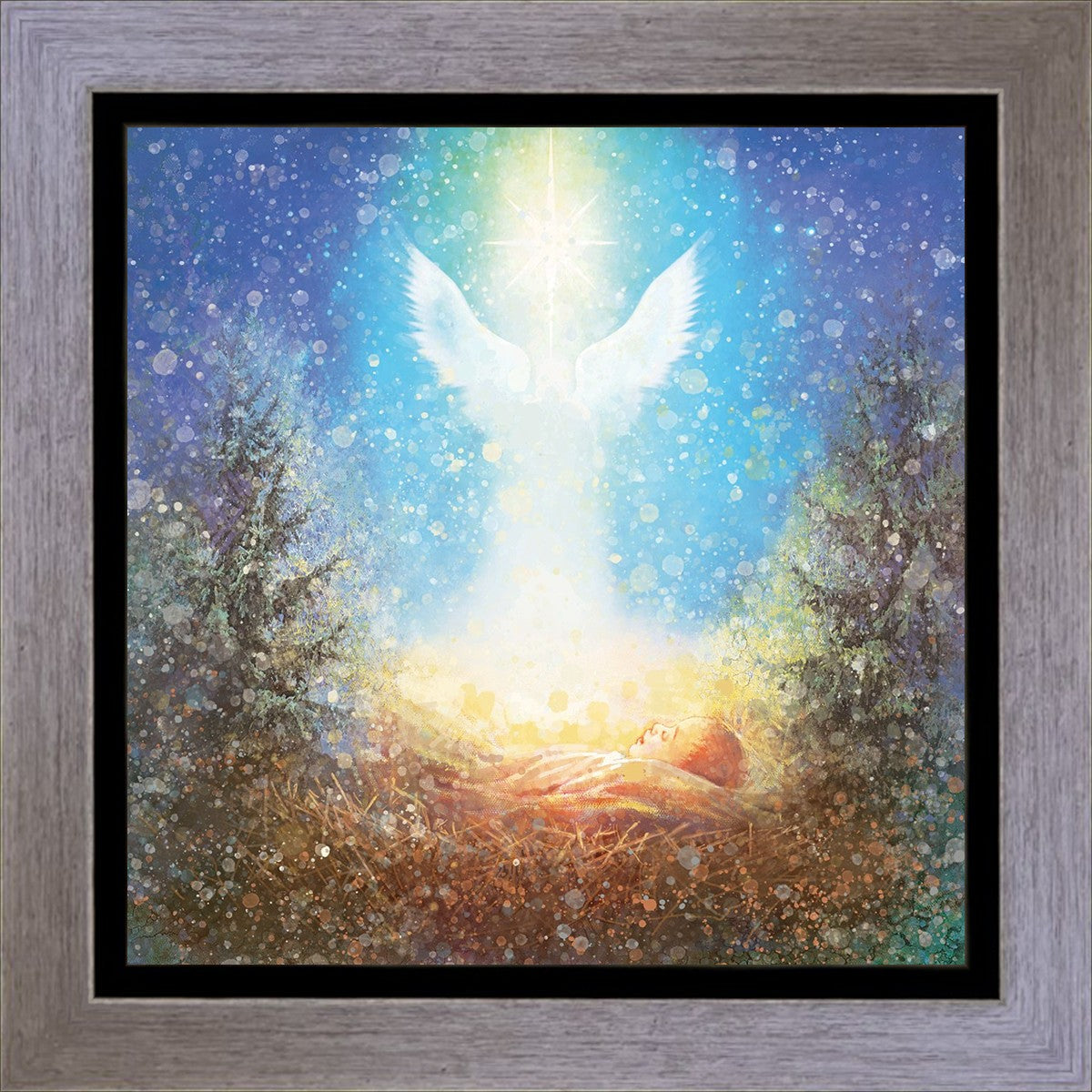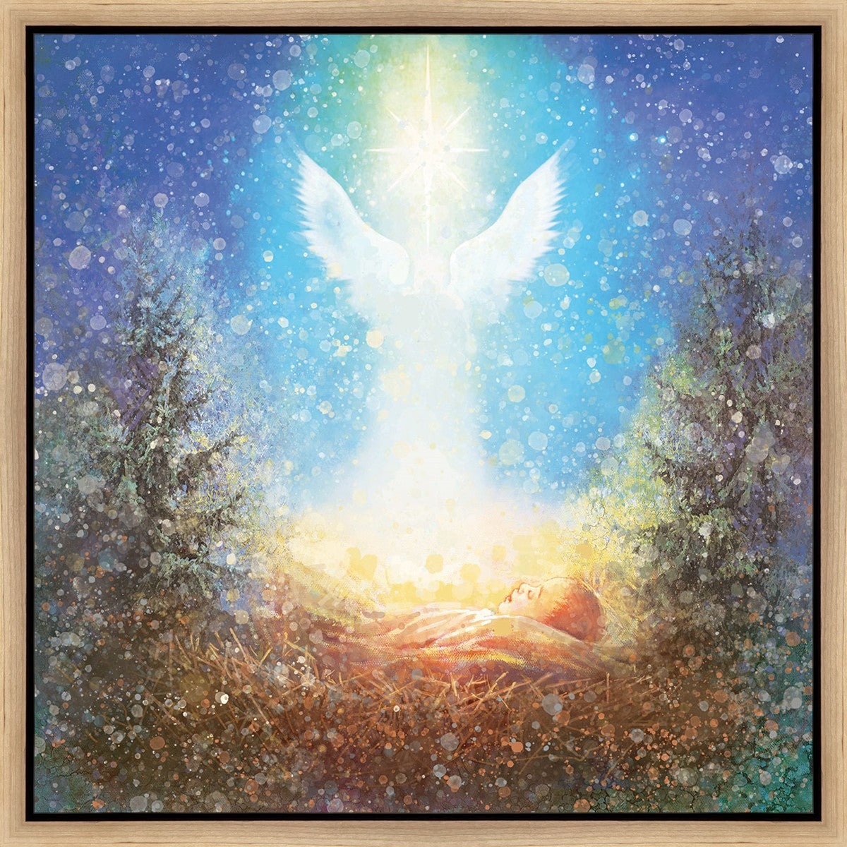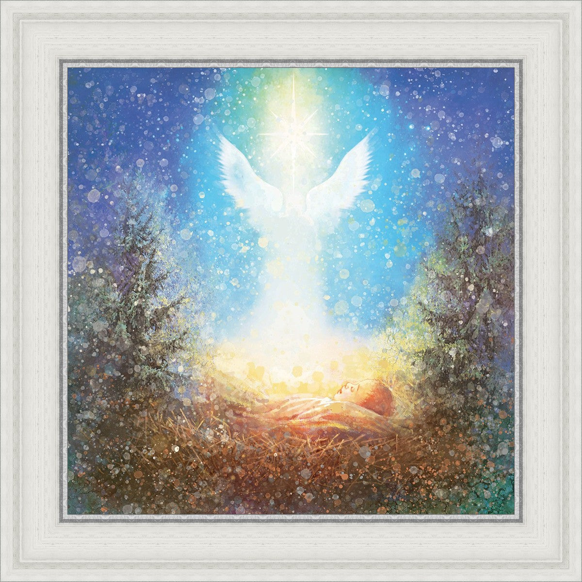 I Bring You Good News by Yongsung Kim features a nativiy with the angel Gabriel appearing above the newborn baby jesus against a colorful, jubuliant background