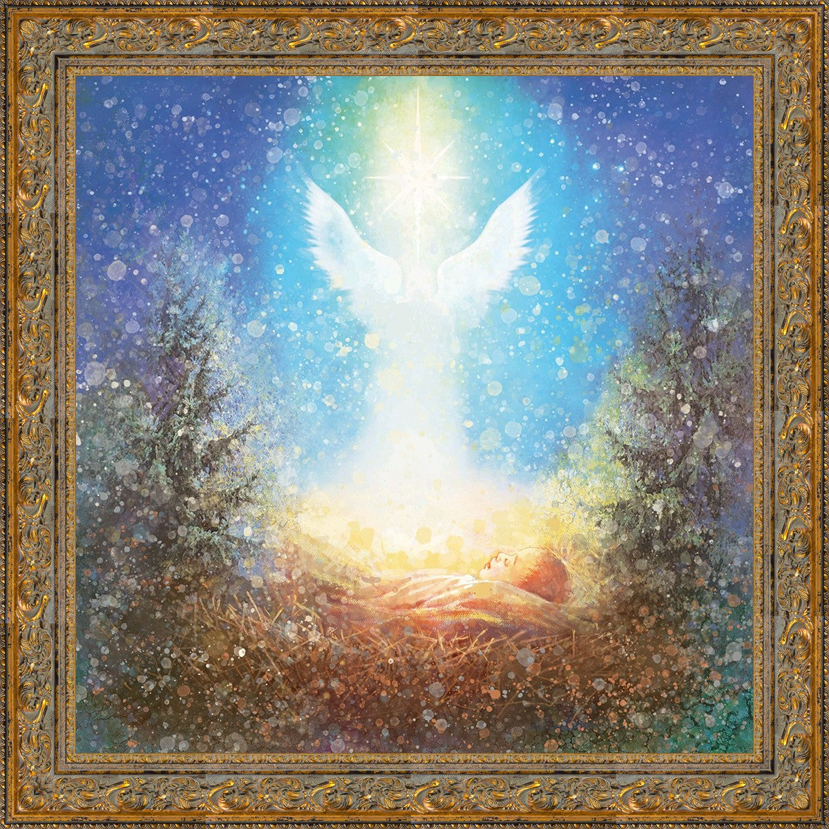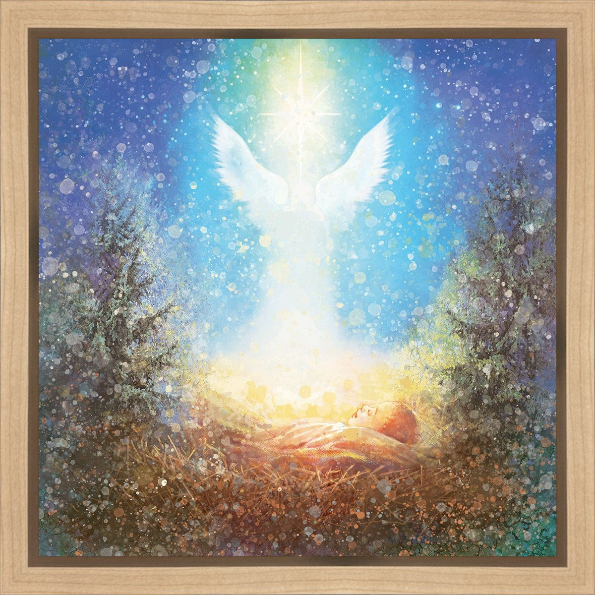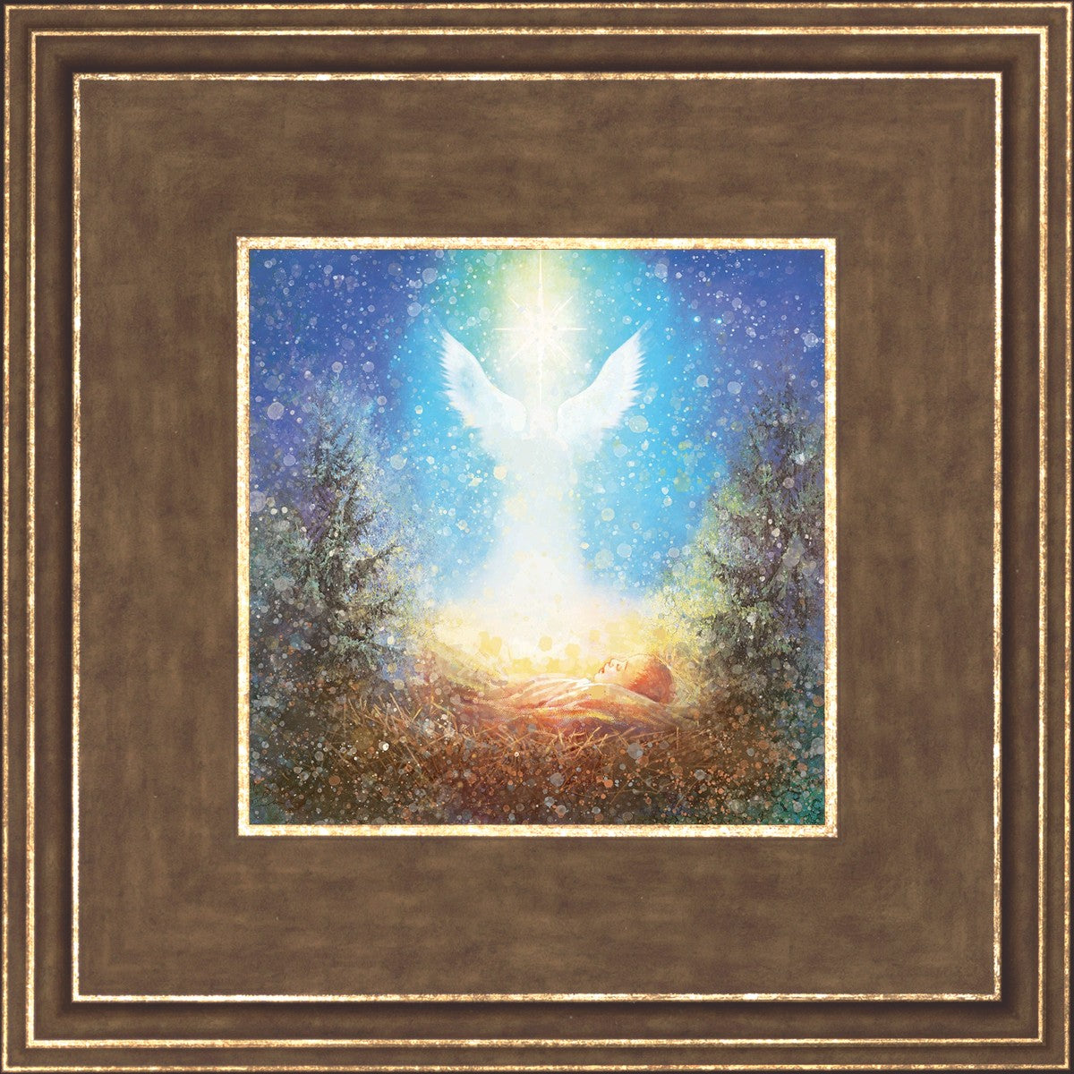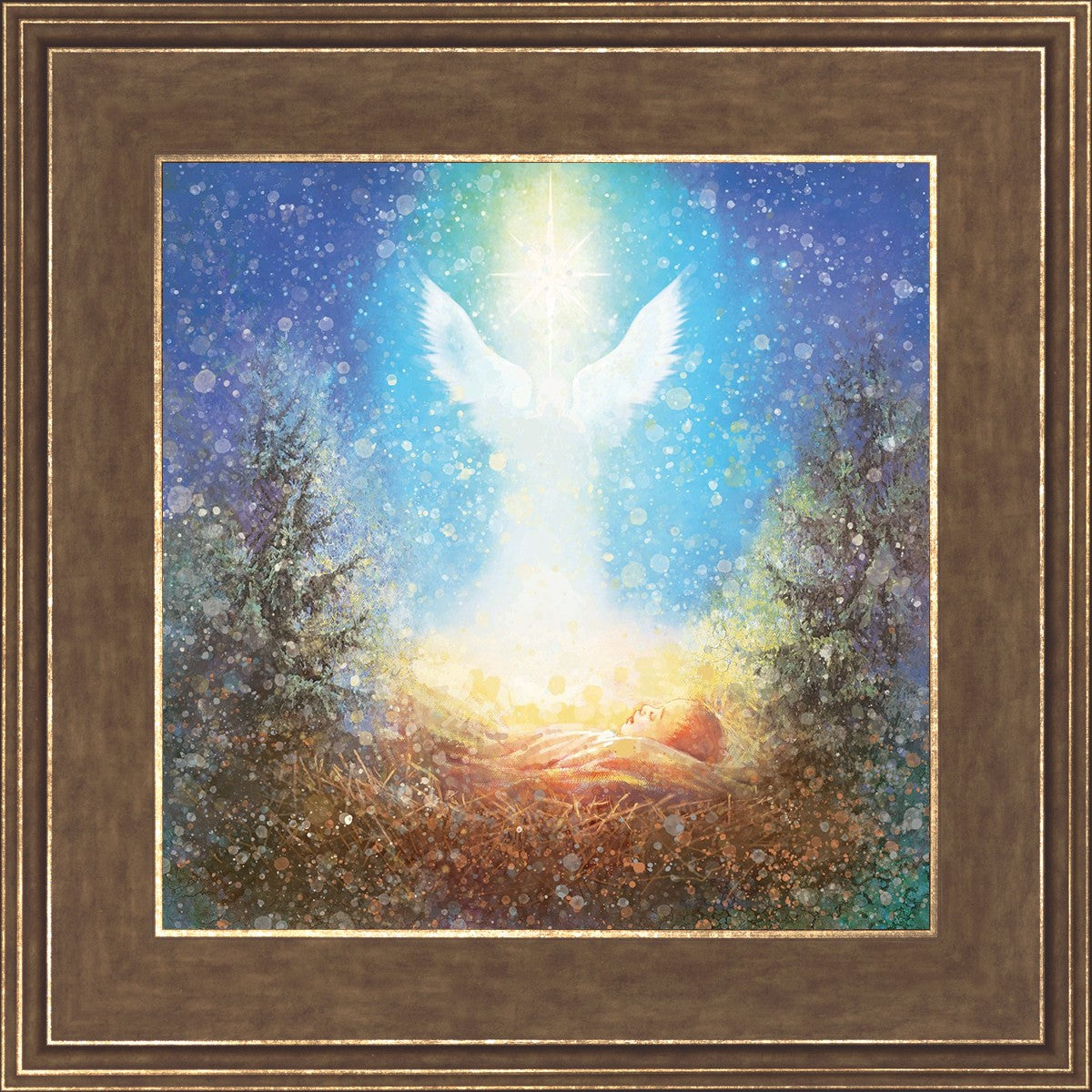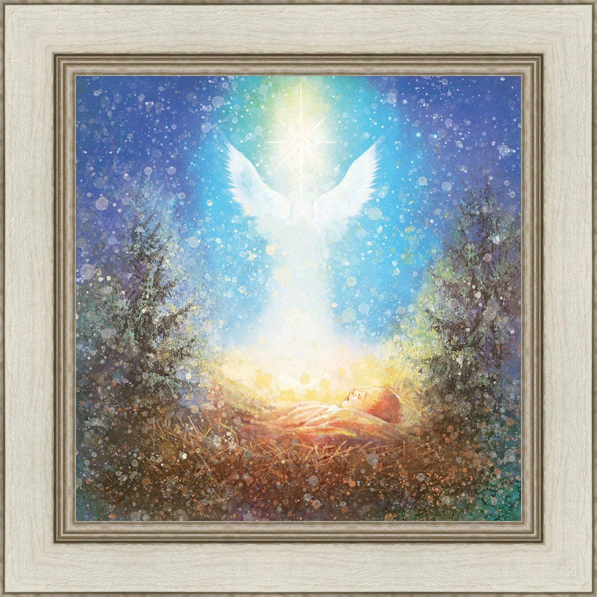 I Bring You Good News by Yongsung Kim features a nativiy with the angel Gabriel appearing above the newborn baby jesus against a colorful, jubuliant background