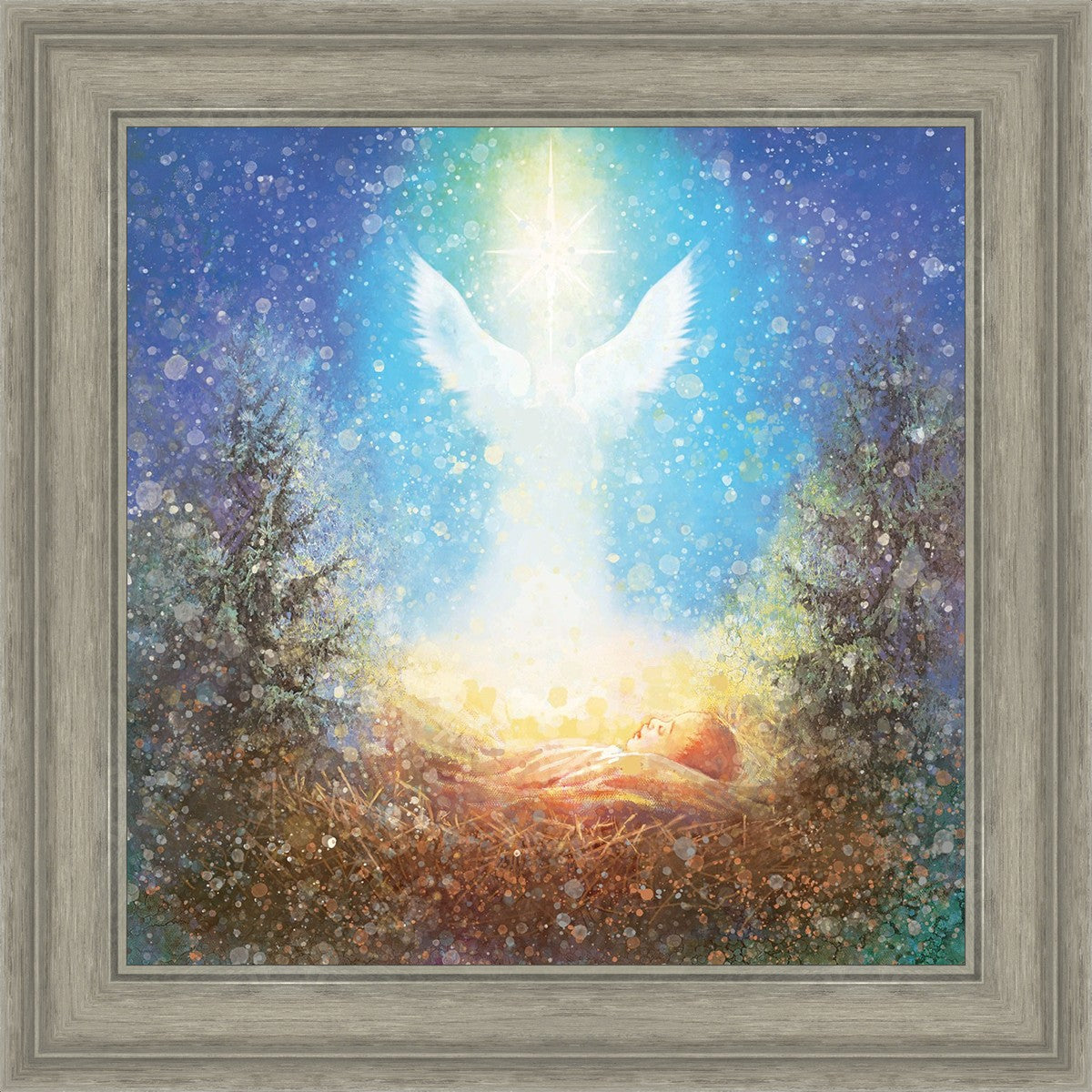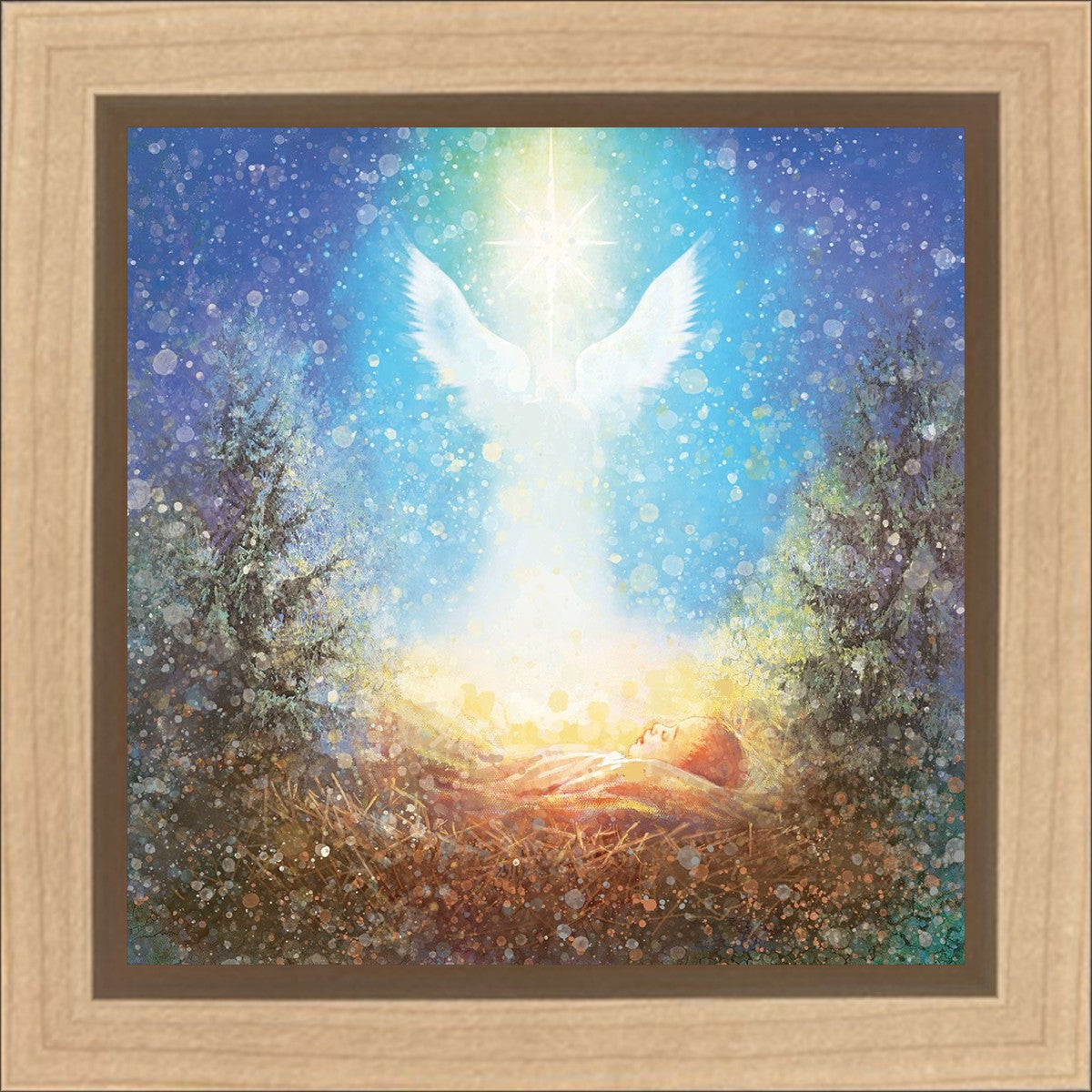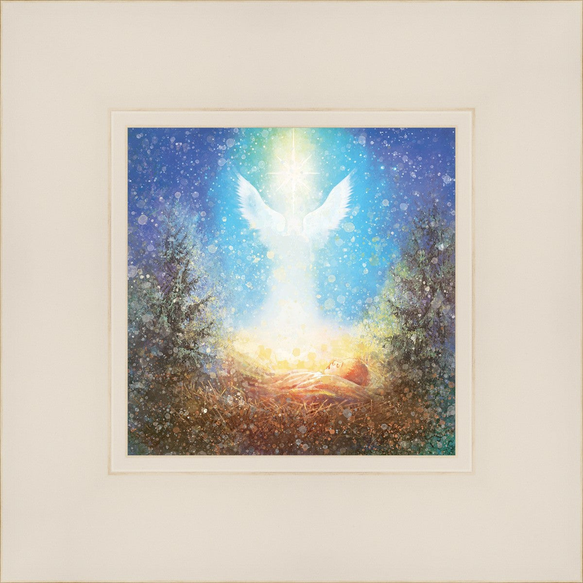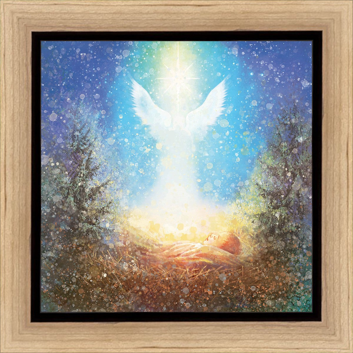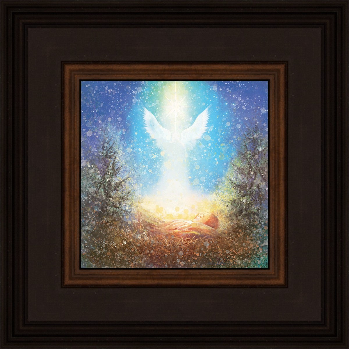 I Bring You Good News by Yongsung Kim features a nativiy with the angel Gabriel appearing above the newborn baby jesus against a colorful, jubuliant background