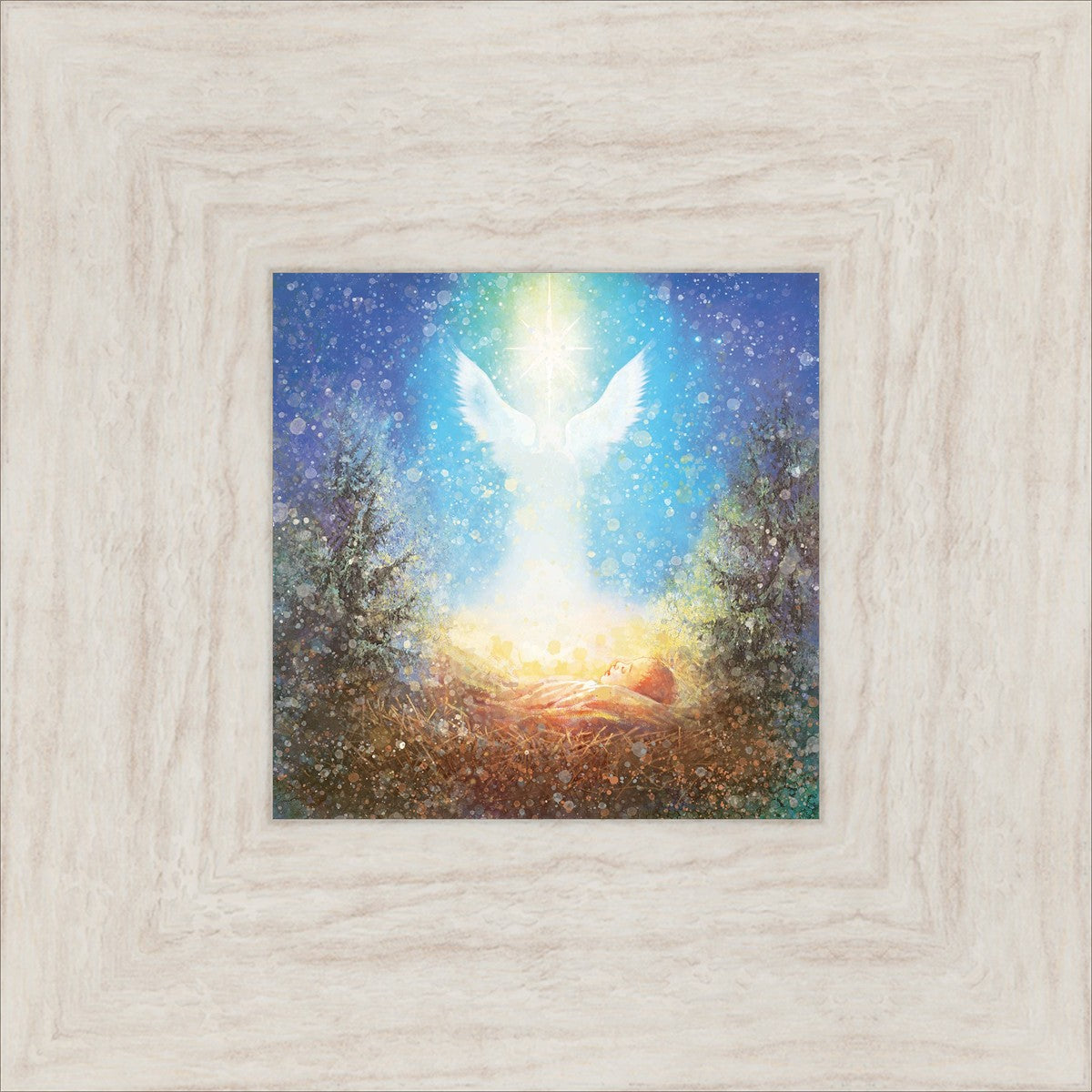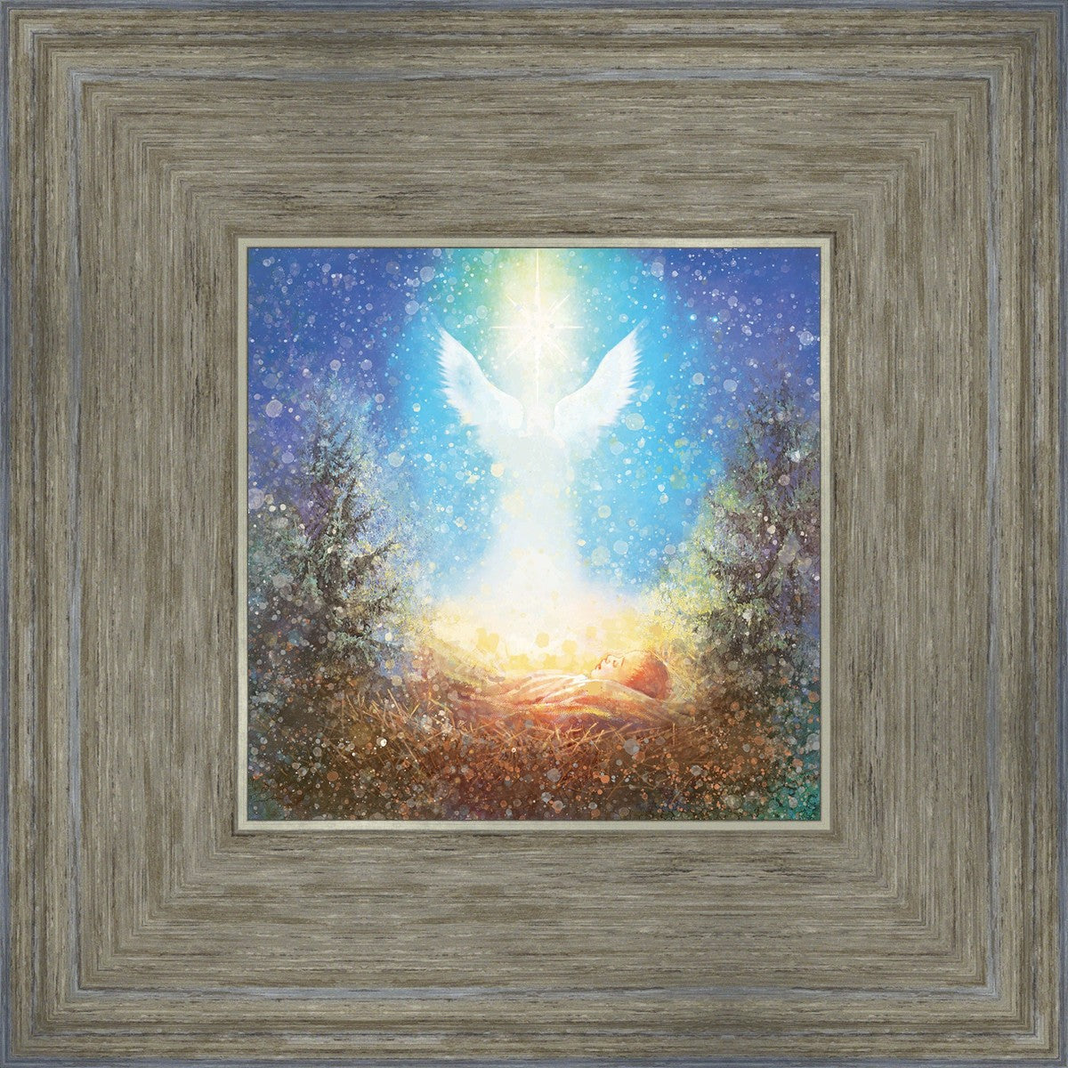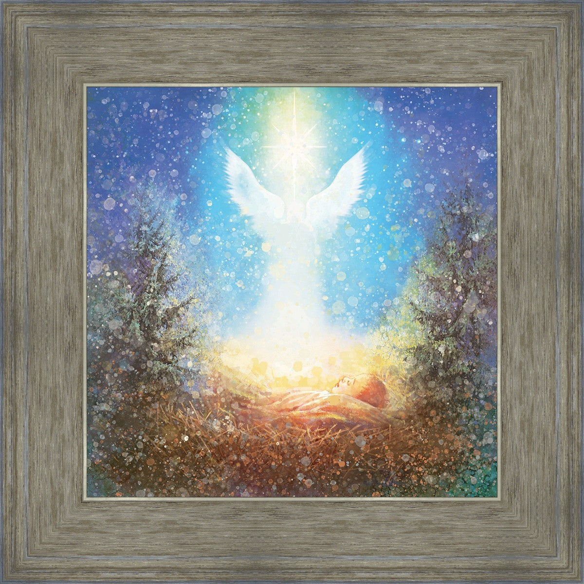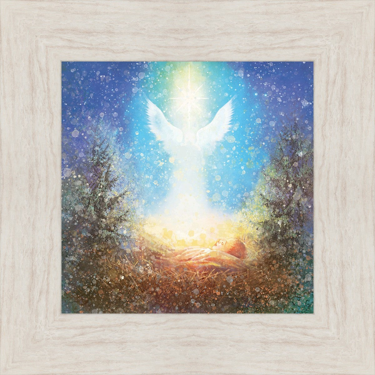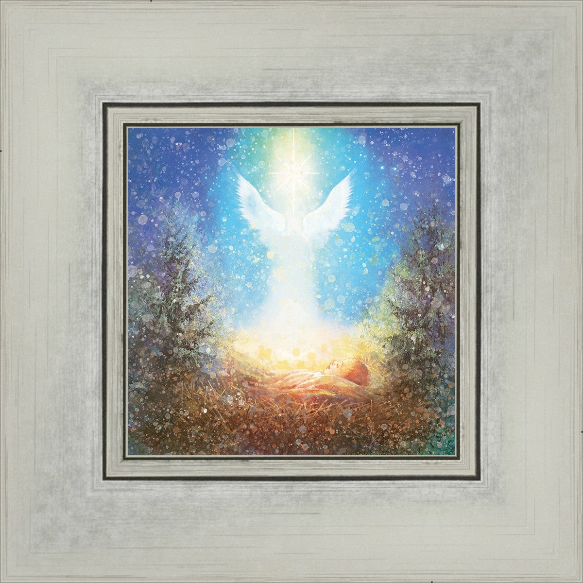 I Bring You Good News by Yongsung Kim features a nativiy with the angel Gabriel appearing above the newborn baby jesus against a colorful, jubuliant background