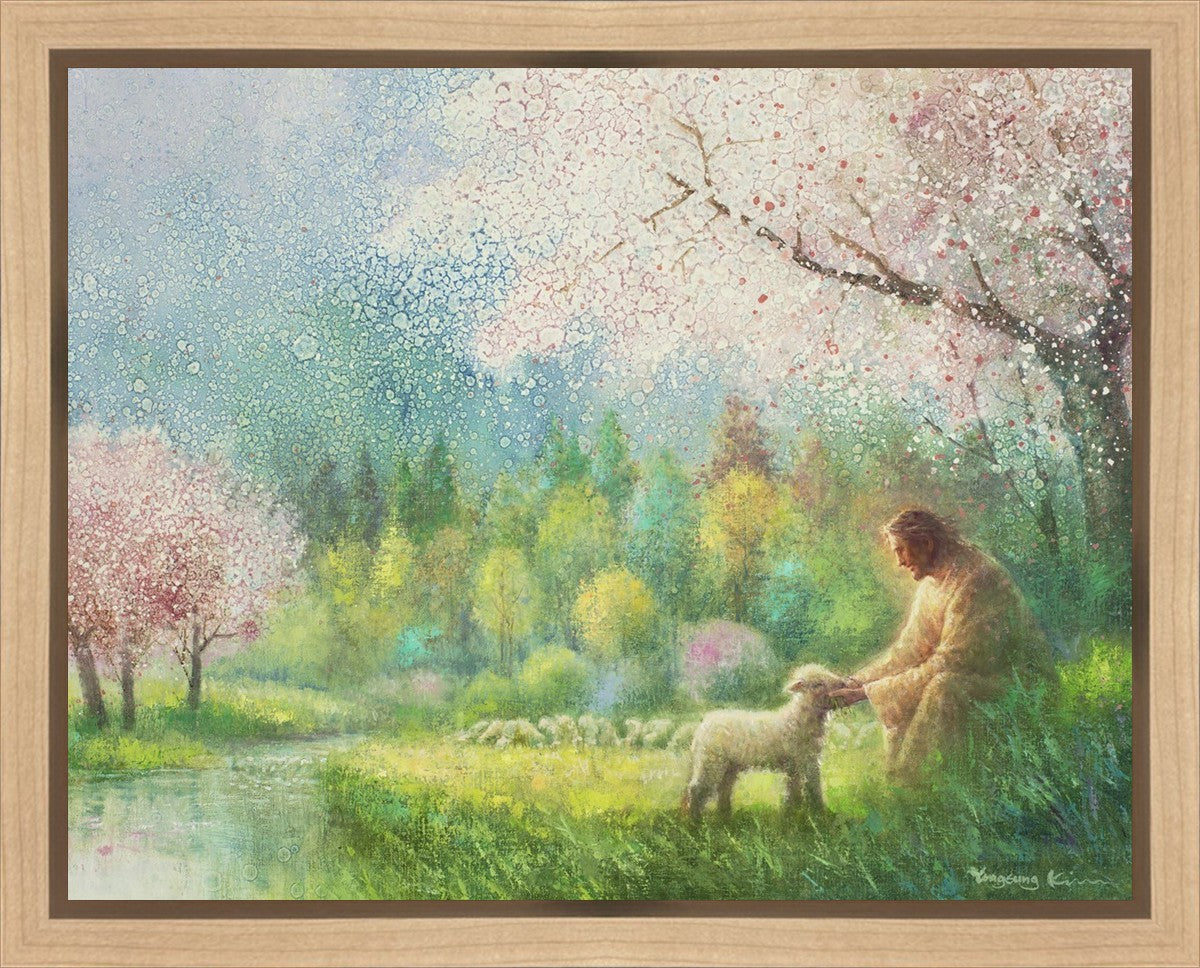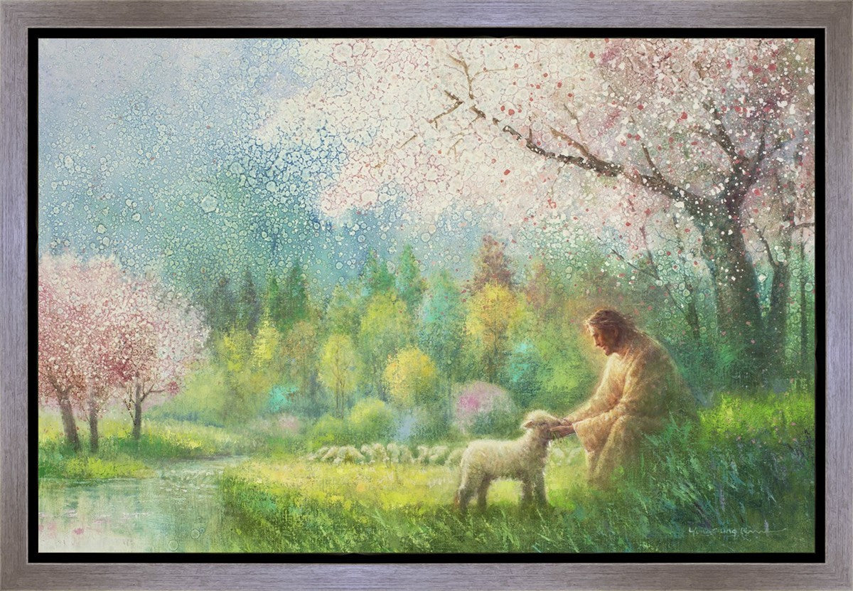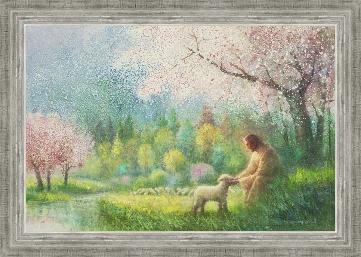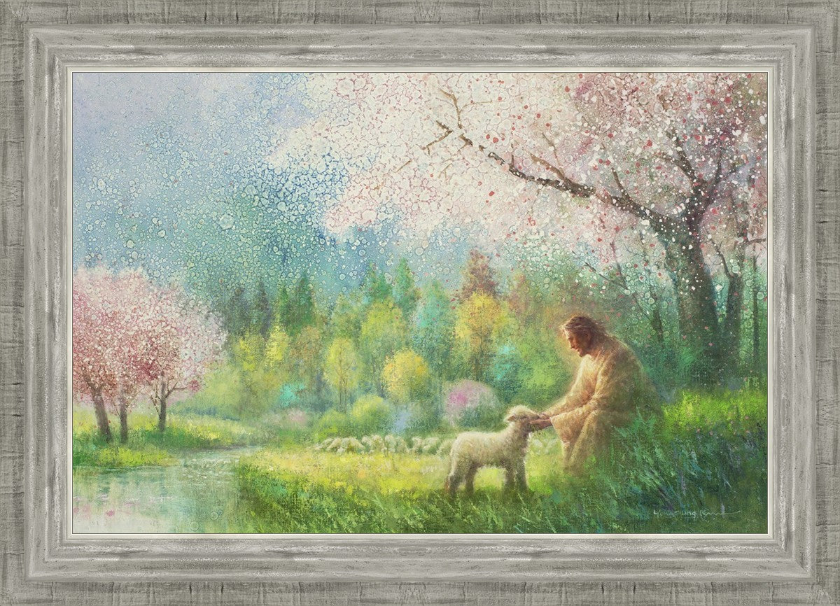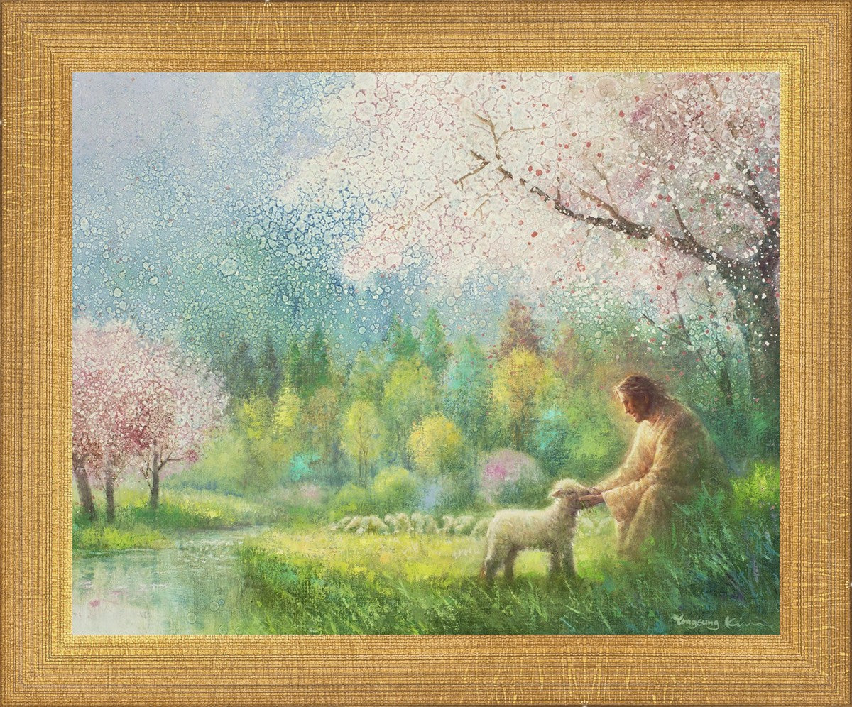 With a compassionate gaze, Jesus sits offering comfort and reassurance to a vulnerable and innocent spring lamb. The surrounding scenery is an explosion of colors and life, where blossoms of every hue blanket the earth, their vibrant petals echoing the joy and renewal of the season. Yongsung Kim invites viewers to find solace and renewal in the tender care of Christ.