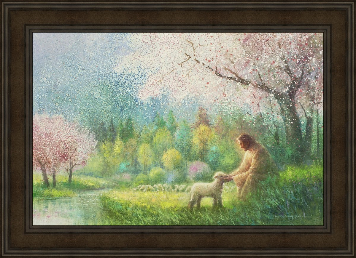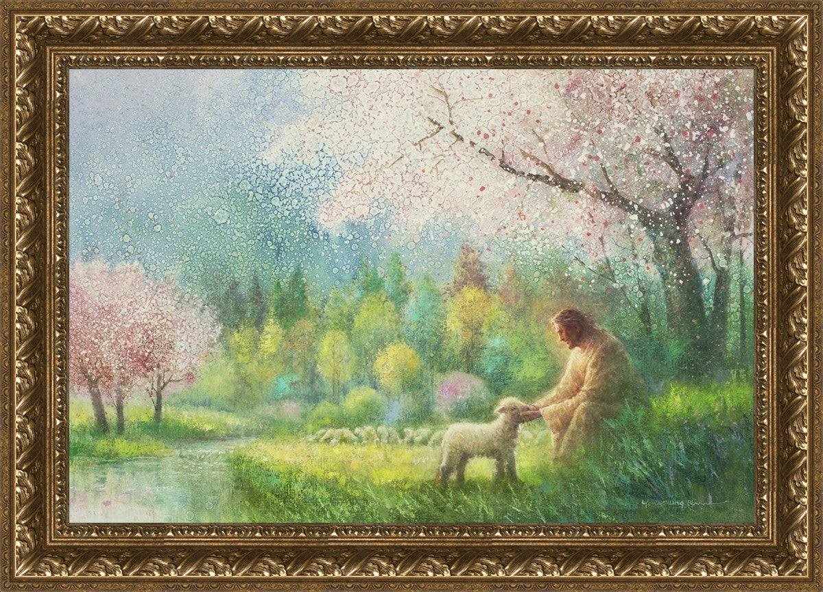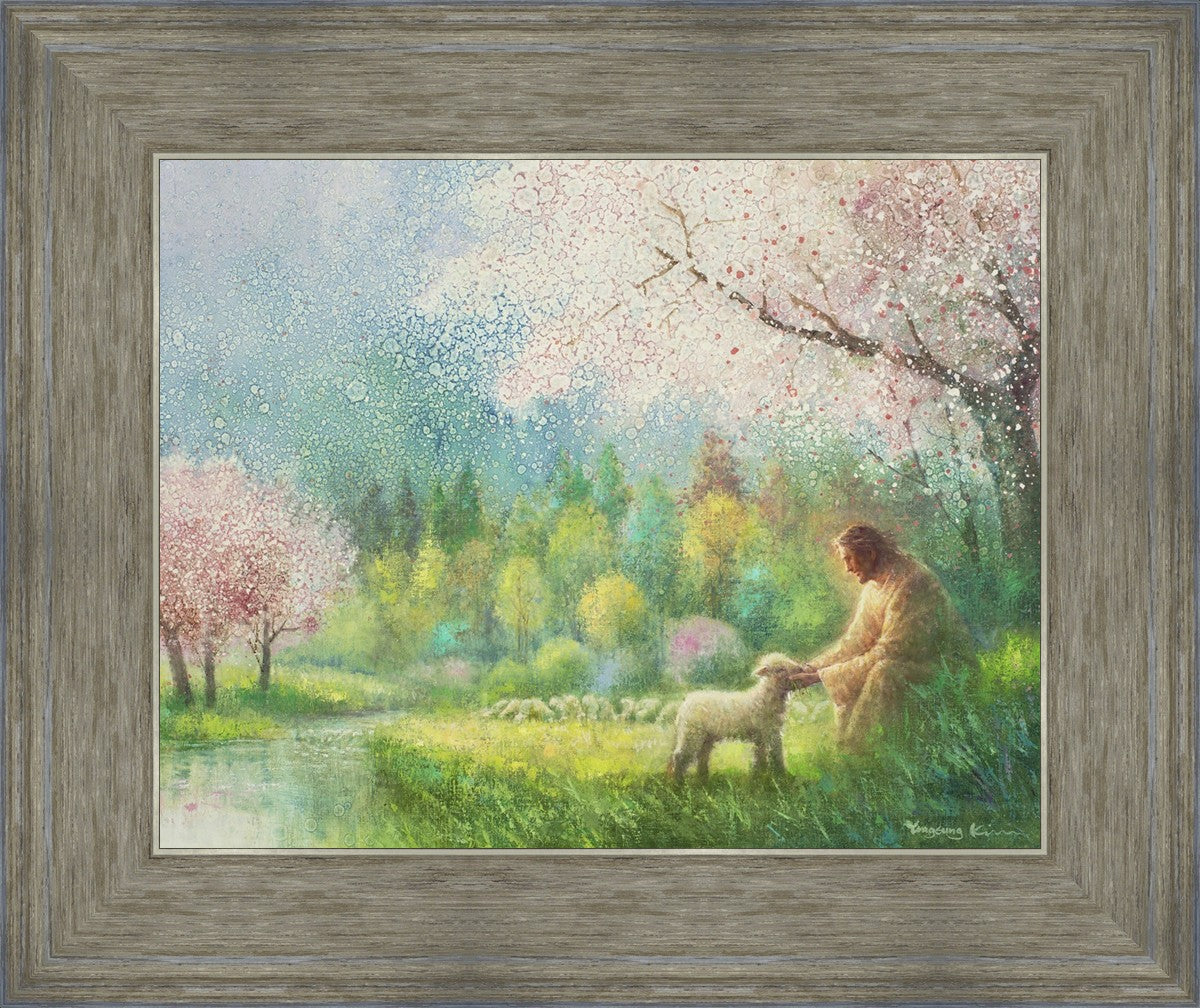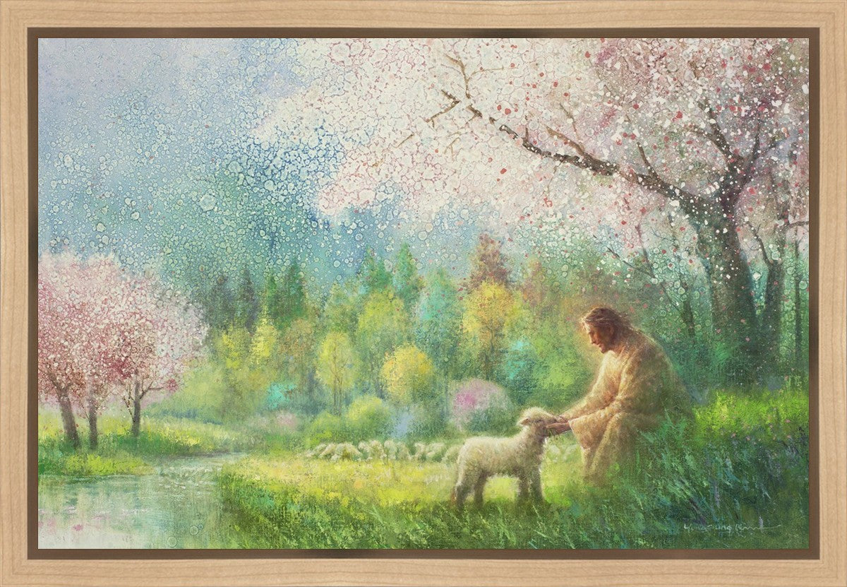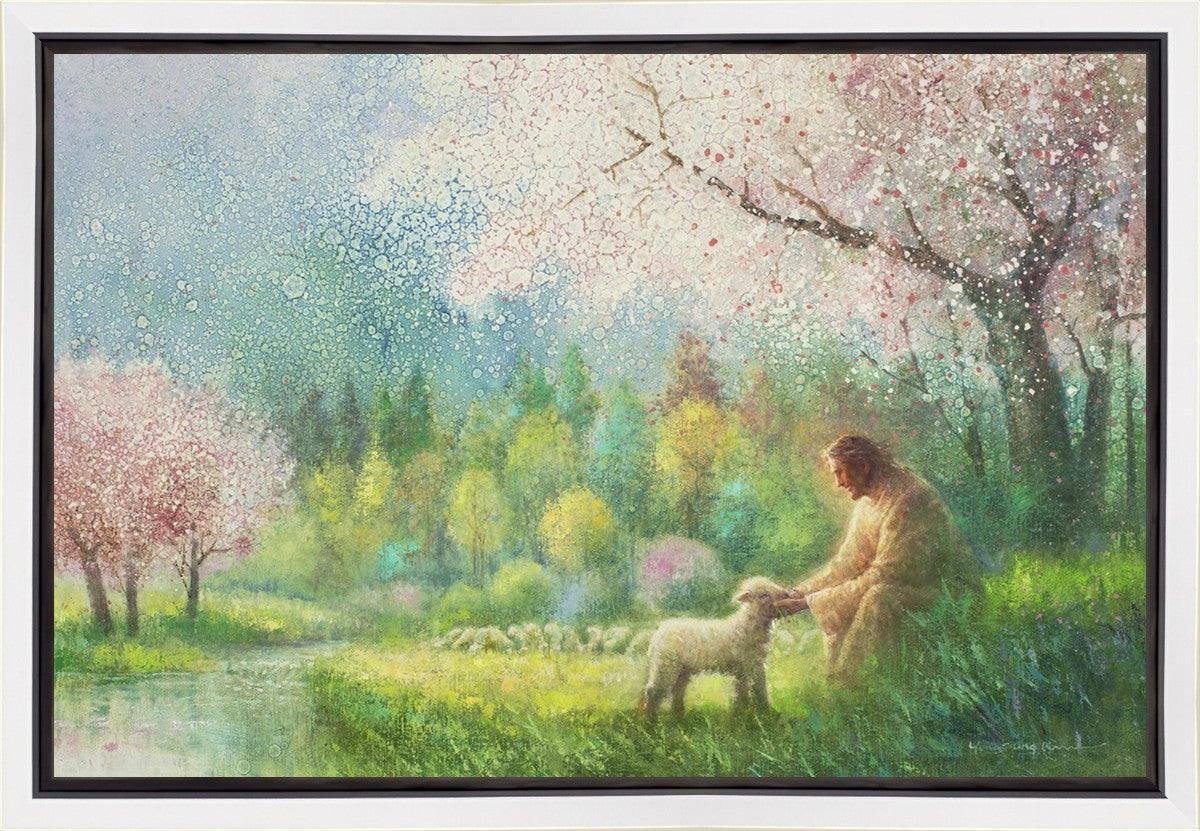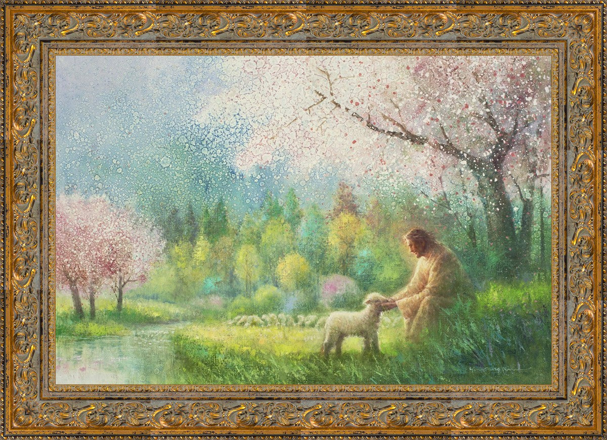 With a compassionate gaze, Jesus sits offering comfort and reassurance to a vulnerable and innocent spring lamb. The surrounding scenery is an explosion of colors and life, where blossoms of every hue blanket the earth, their vibrant petals echoing the joy and renewal of the season. Yongsung Kim invites viewers to find solace and renewal in the tender care of Christ.