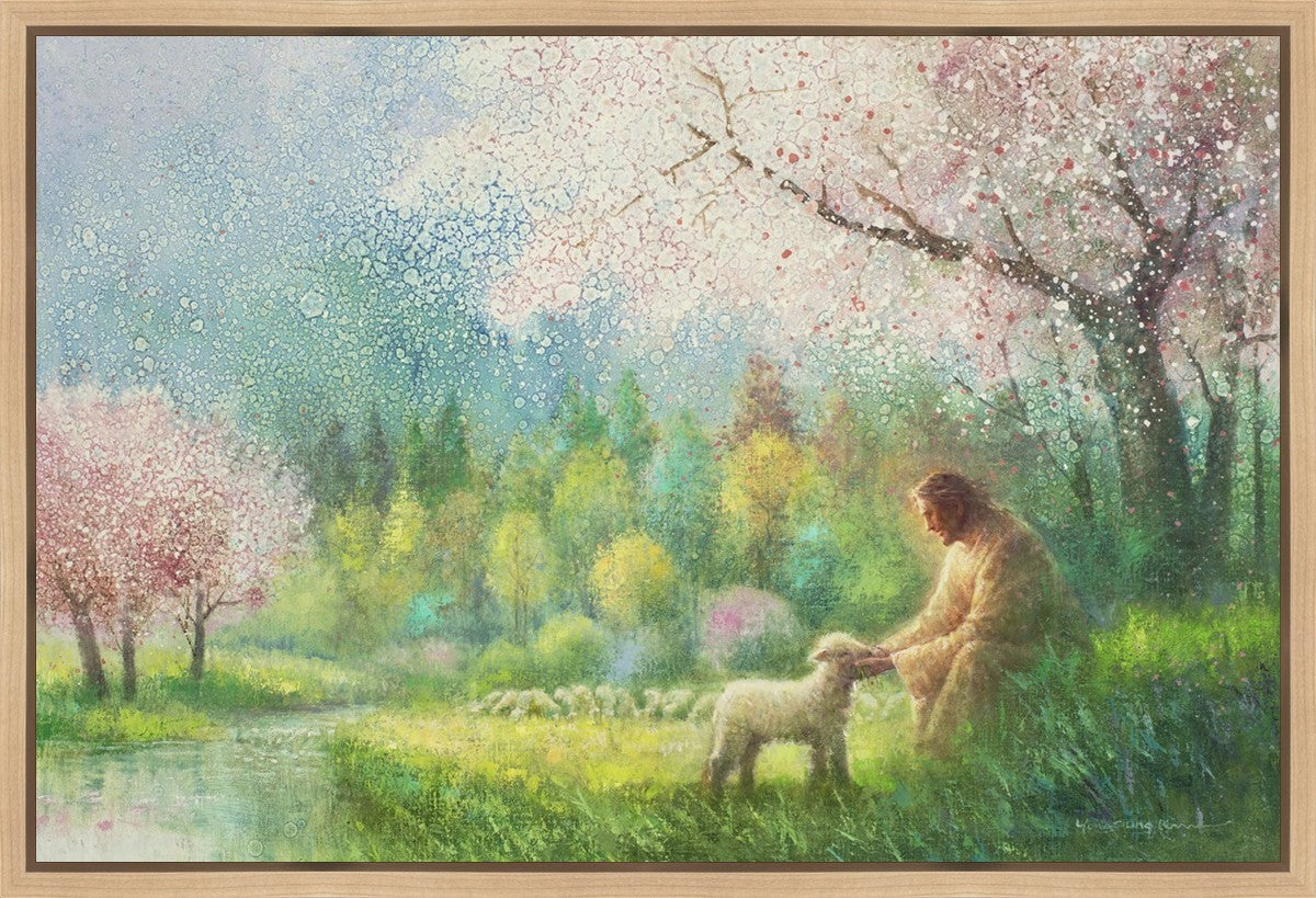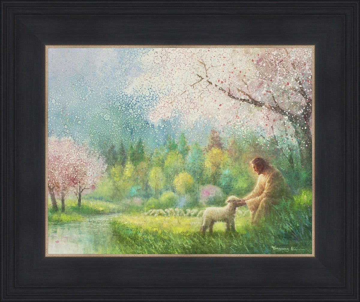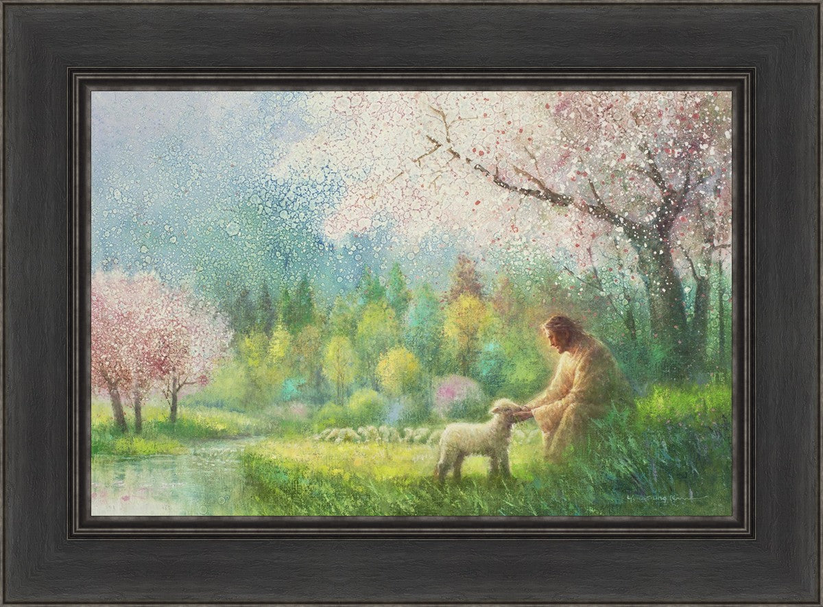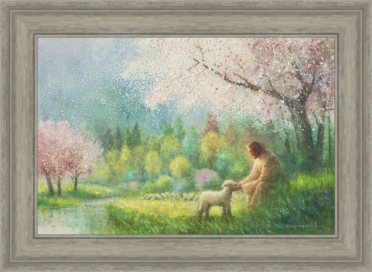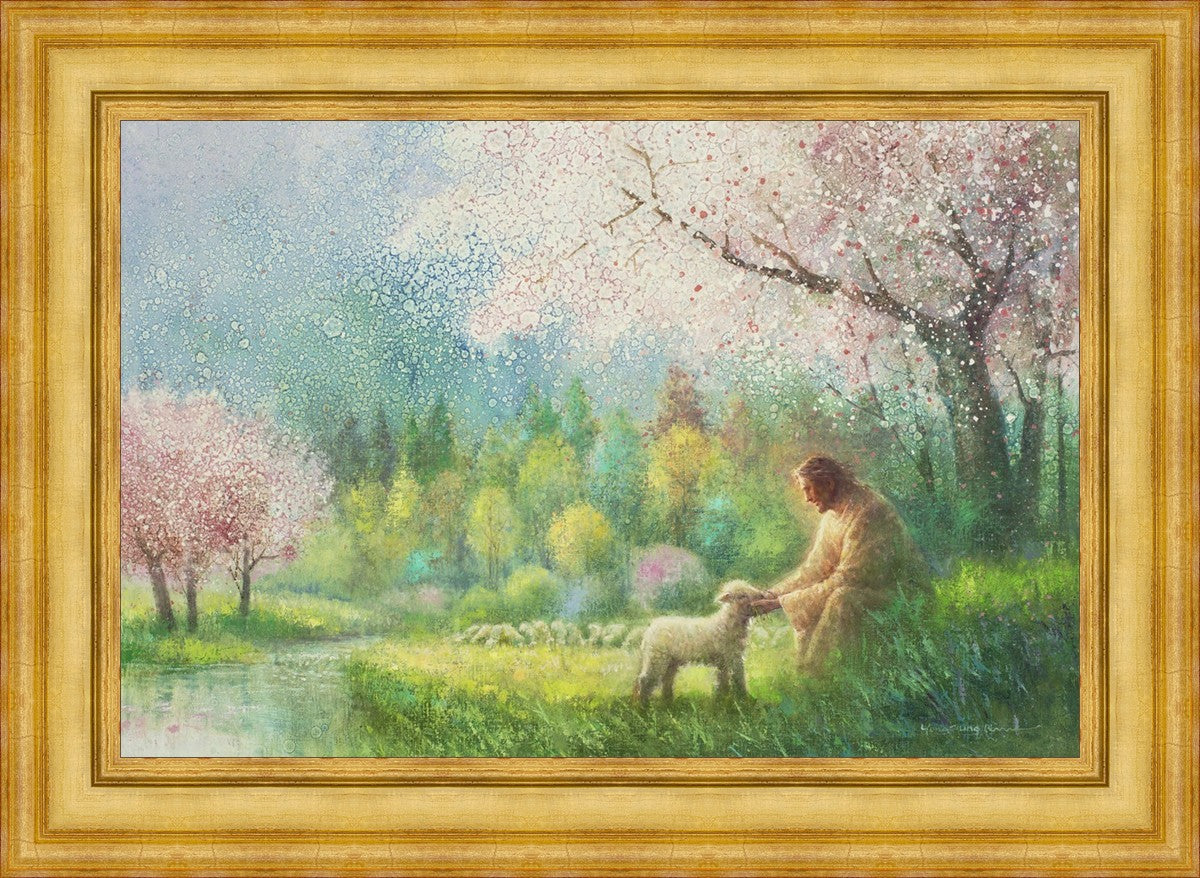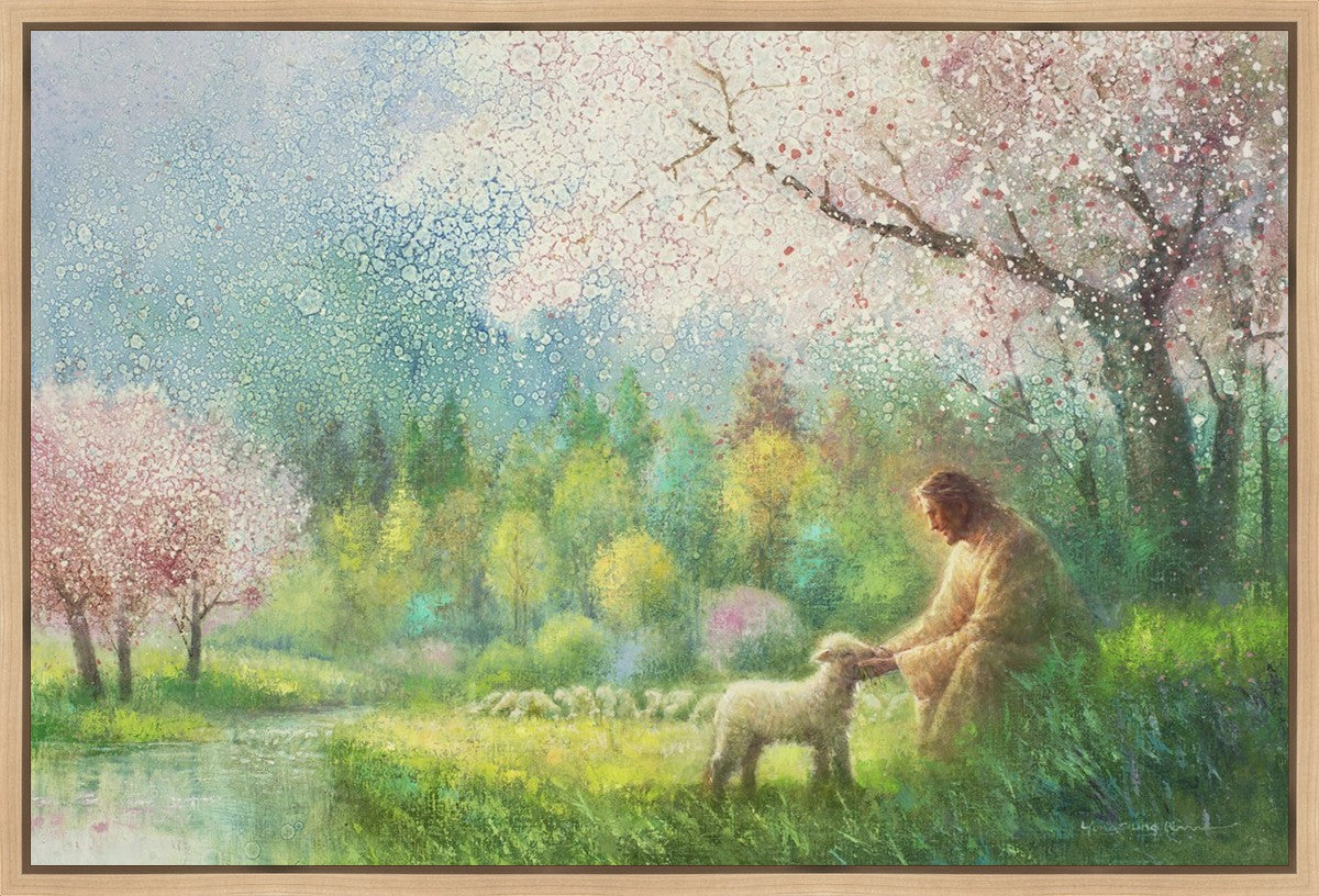 With a compassionate gaze, Jesus sits offering comfort and reassurance to a vulnerable and innocent spring lamb. The surrounding scenery is an explosion of colors and life, where blossoms of every hue blanket the earth, their vibrant petals echoing the joy and renewal of the season. Yongsung Kim invites viewers to find solace and renewal in the tender care of Christ.