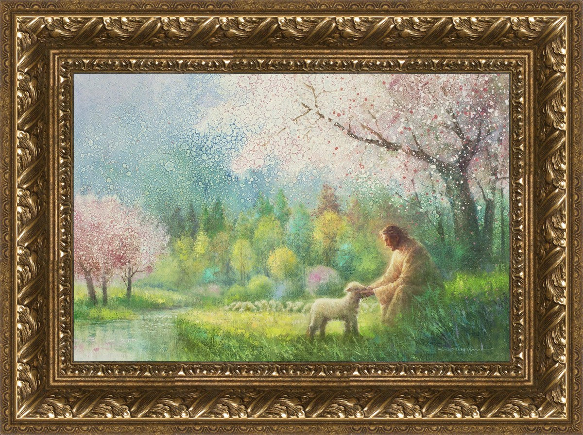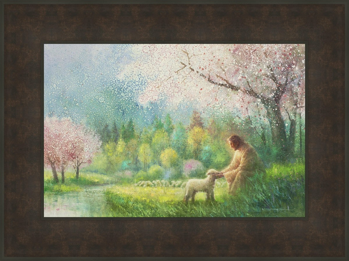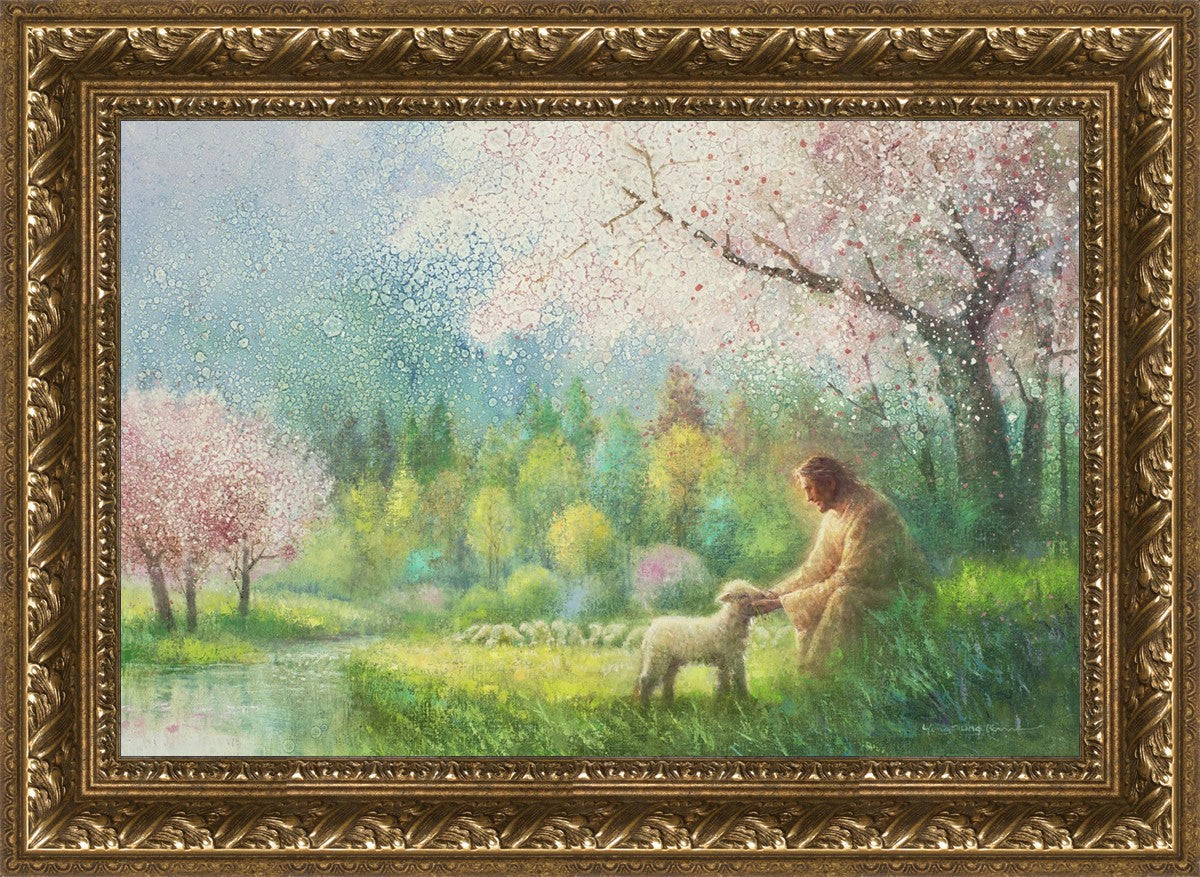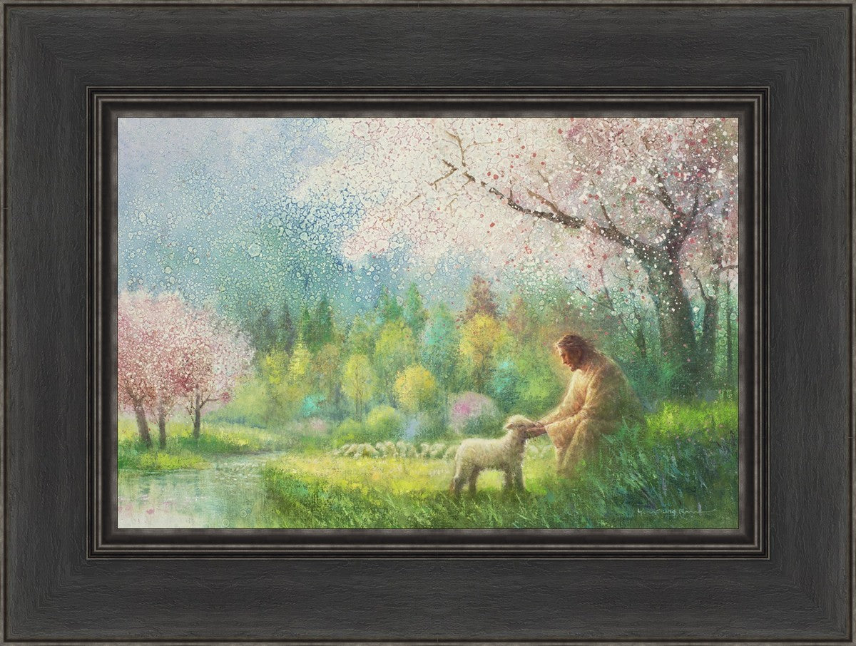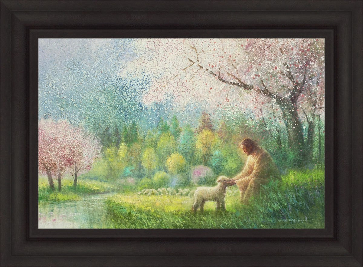 With a compassionate gaze, Jesus sits offering comfort and reassurance to a vulnerable and innocent spring lamb. The surrounding scenery is an explosion of colors and life, where blossoms of every hue blanket the earth, their vibrant petals echoing the joy and renewal of the season. Yongsung Kim invites viewers to find solace and renewal in the tender care of Christ.