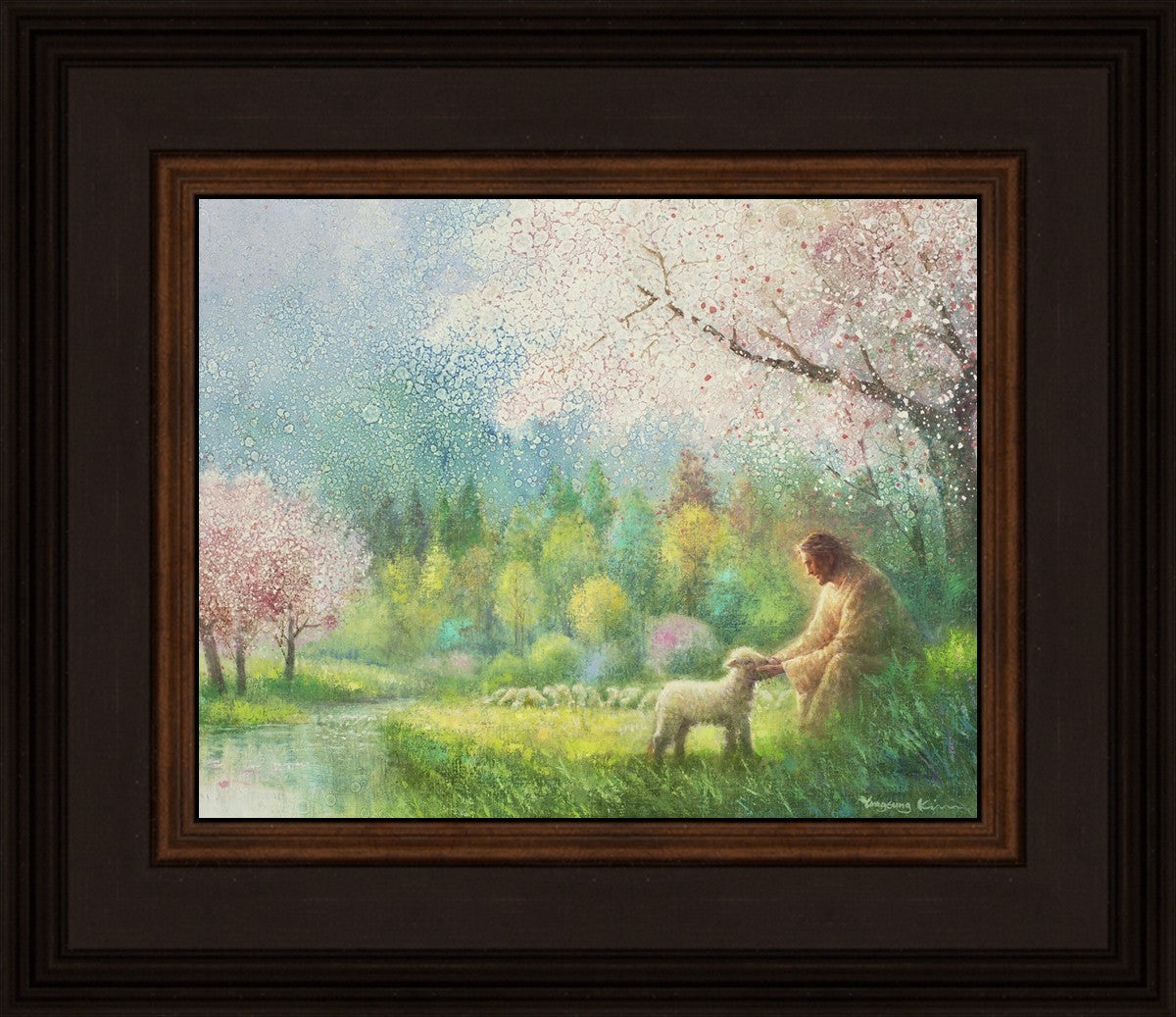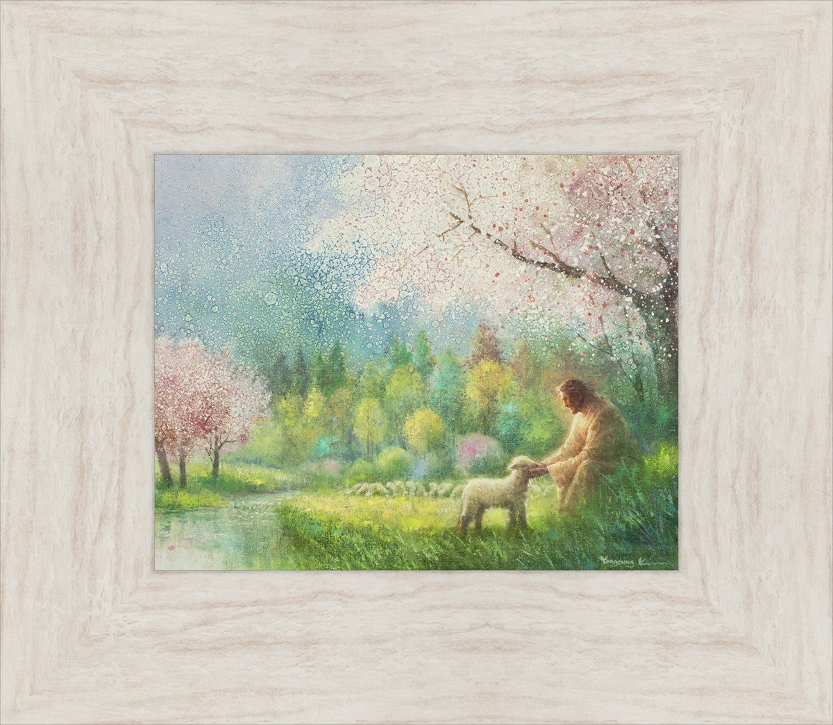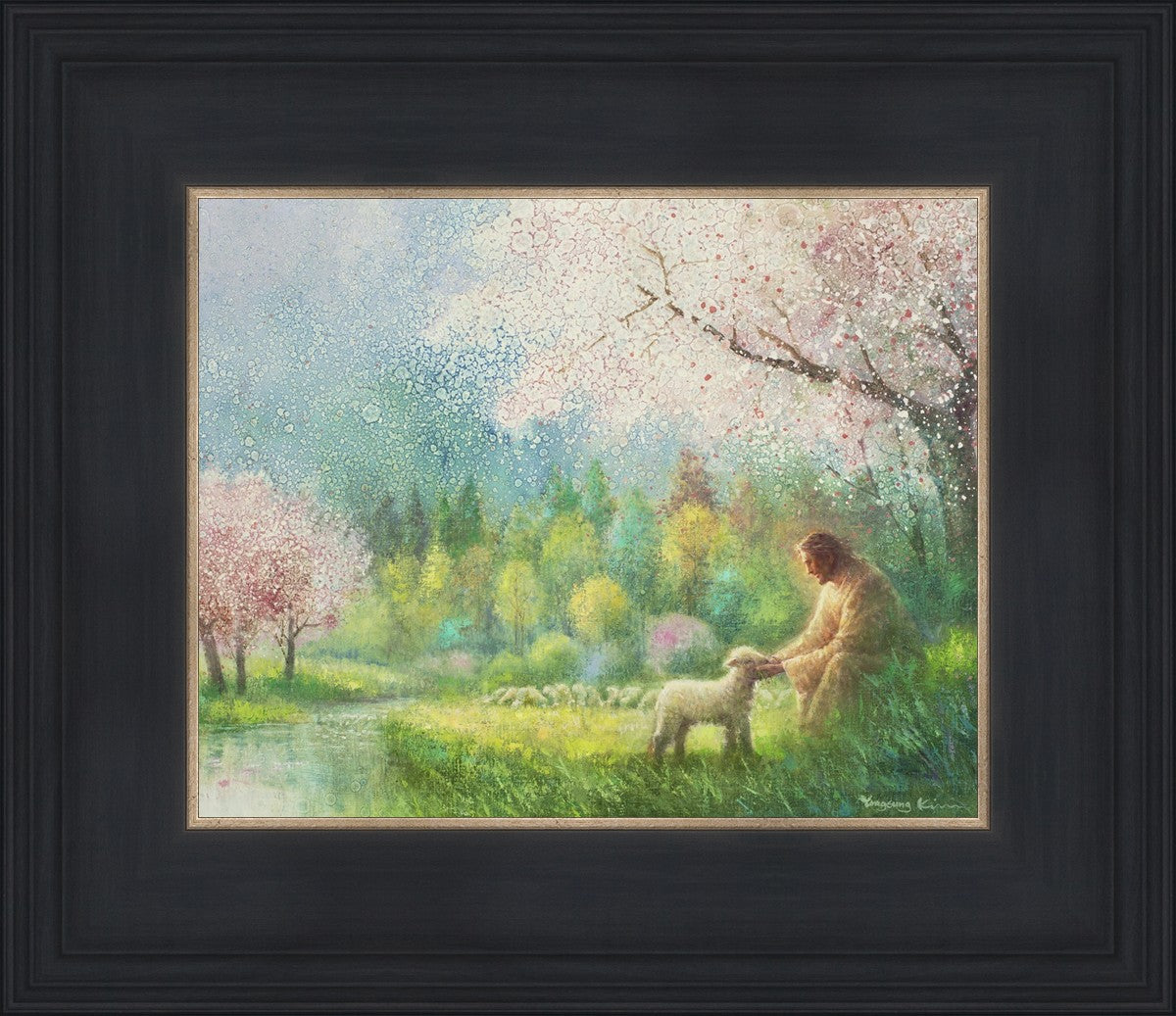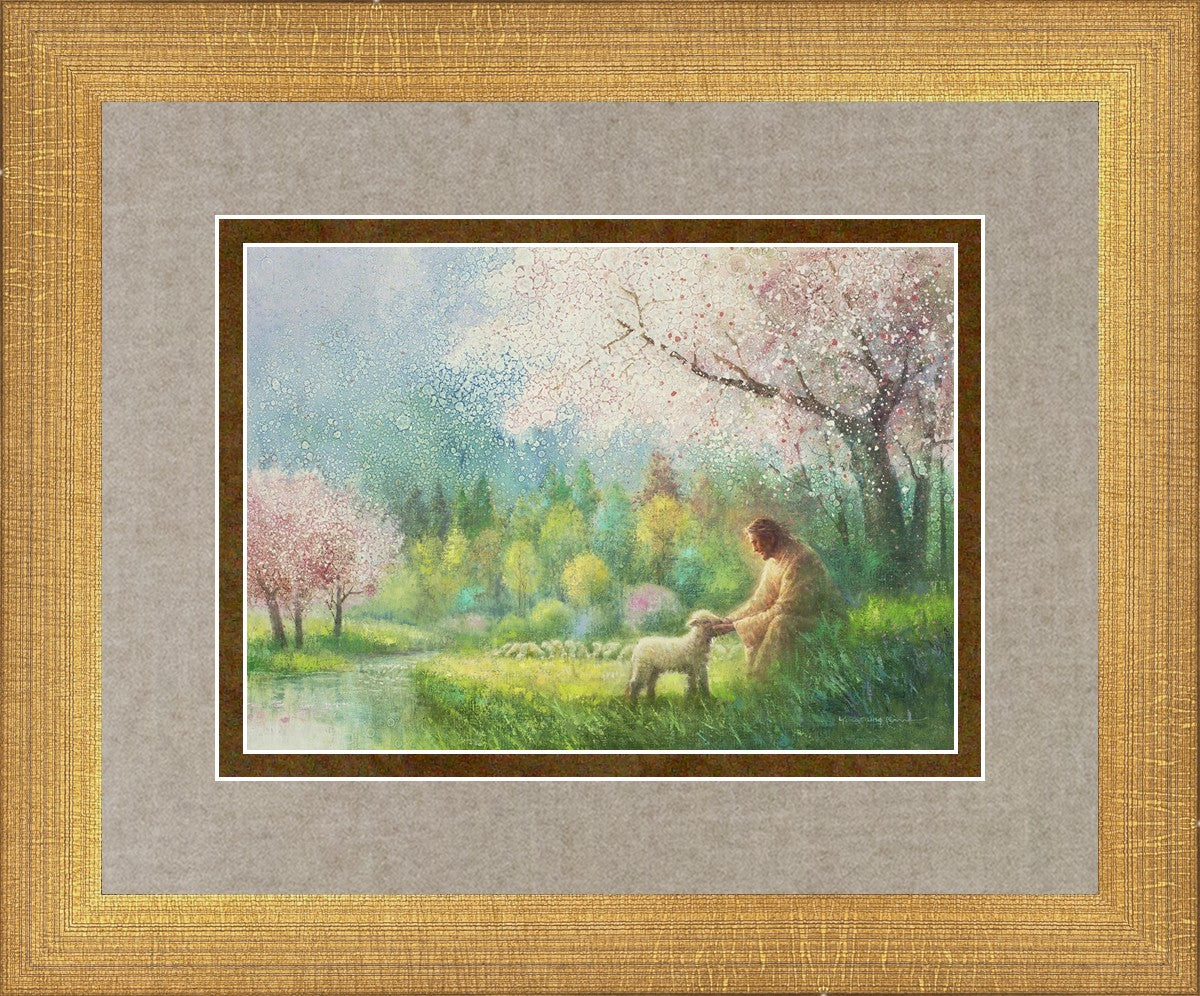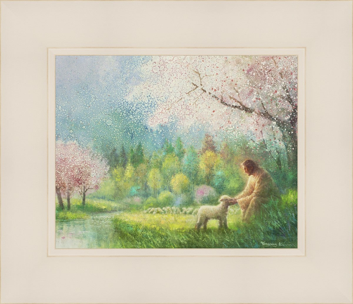 With a compassionate gaze, Jesus sits offering comfort and reassurance to a vulnerable and innocent spring lamb. The surrounding scenery is an explosion of colors and life, where blossoms of every hue blanket the earth, their vibrant petals echoing the joy and renewal of the season. Yongsung Kim invites viewers to find solace and renewal in the tender care of Christ.