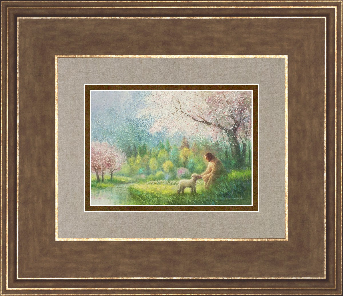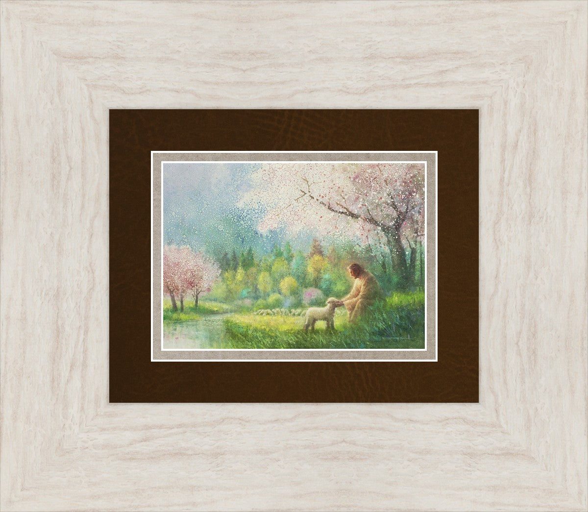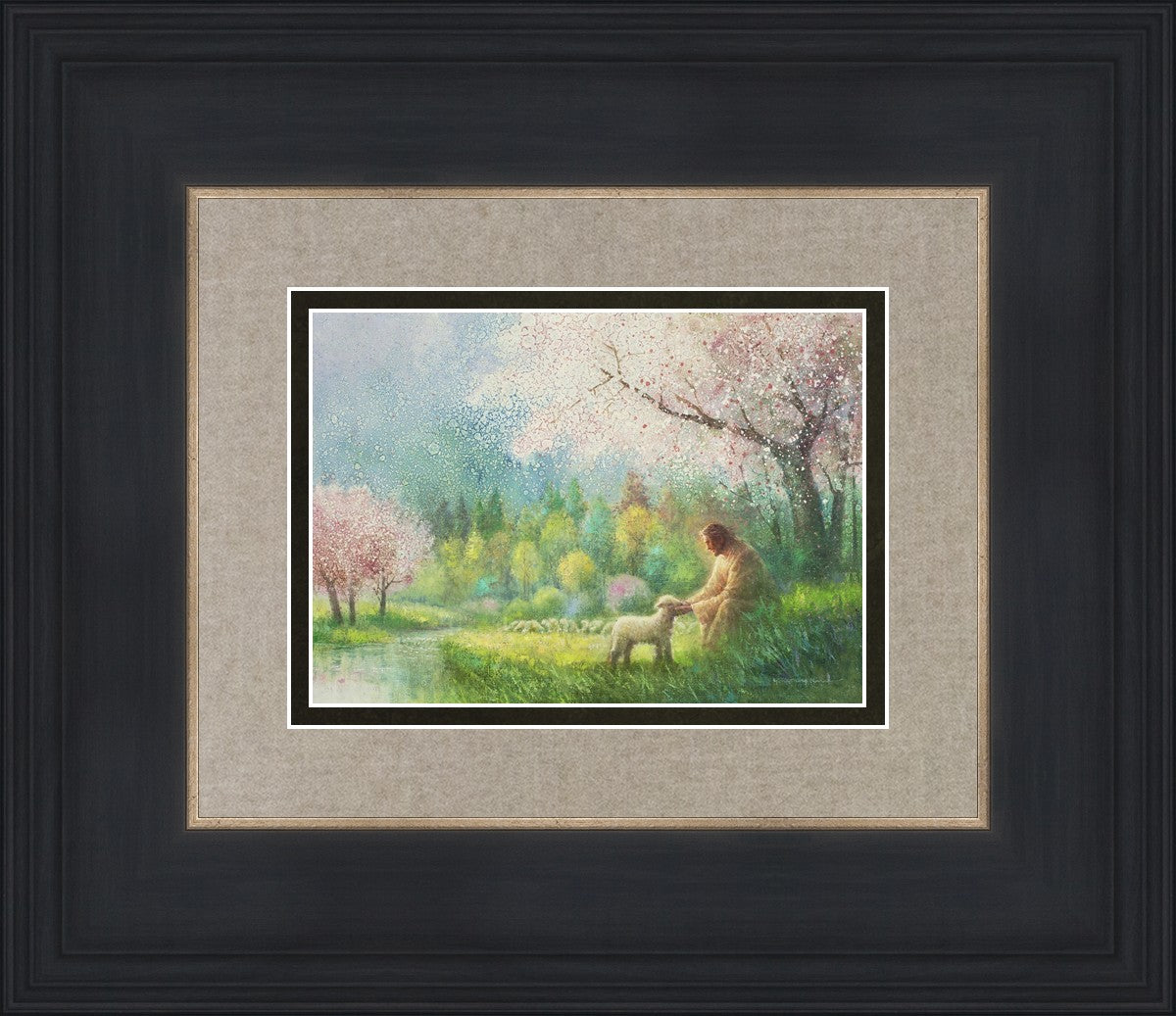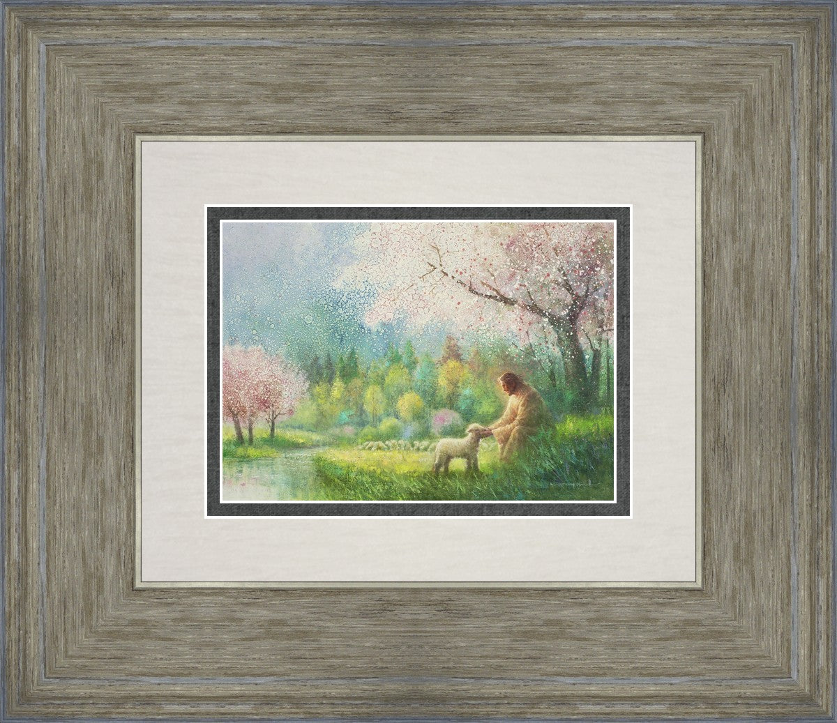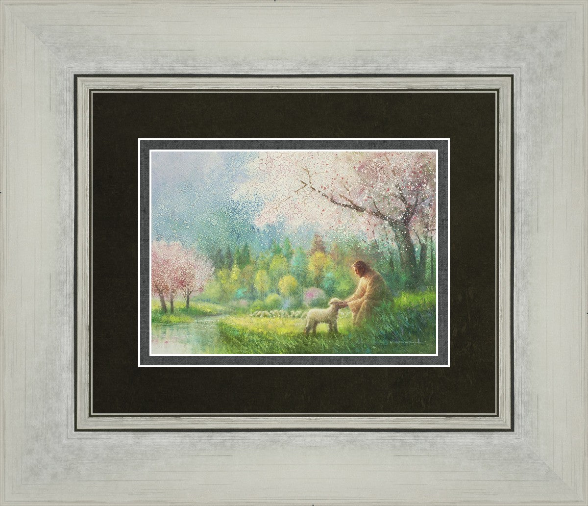 With a compassionate gaze, Jesus sits offering comfort and reassurance to a vulnerable and innocent spring lamb. The surrounding scenery is an explosion of colors and life, where blossoms of every hue blanket the earth, their vibrant petals echoing the joy and renewal of the season. Yongsung Kim invites viewers to find solace and renewal in the tender care of Christ.