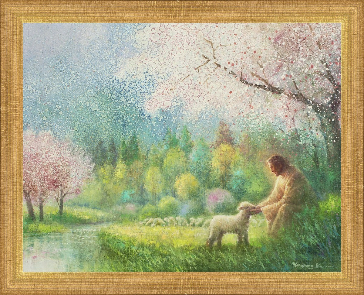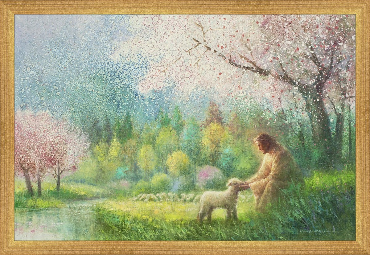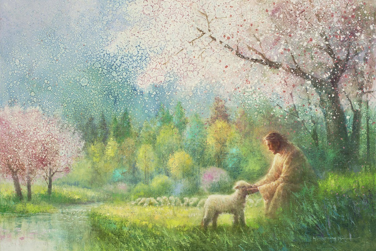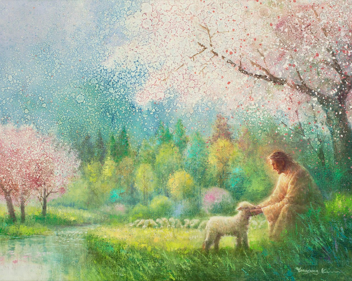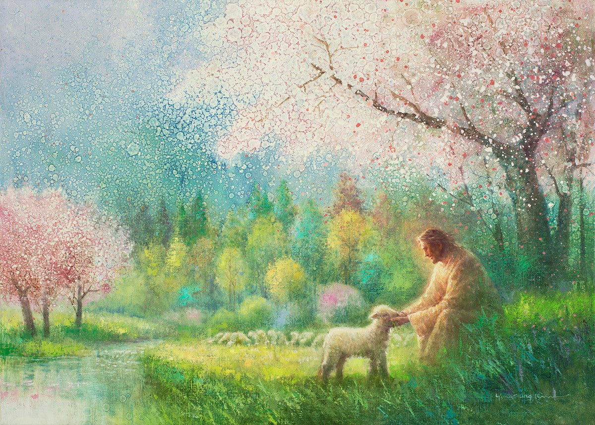 "I Know Thy Name" by Yongsung Kim portrays Jesus Christ comforting a young lamb in a vibrant spring landscape, symbolizing His caring and personal knowledge of each individual.