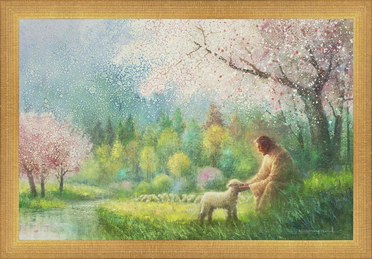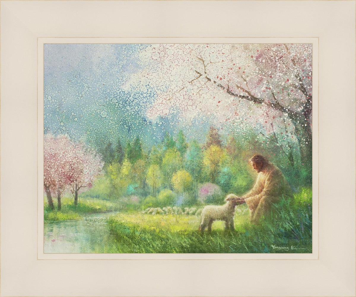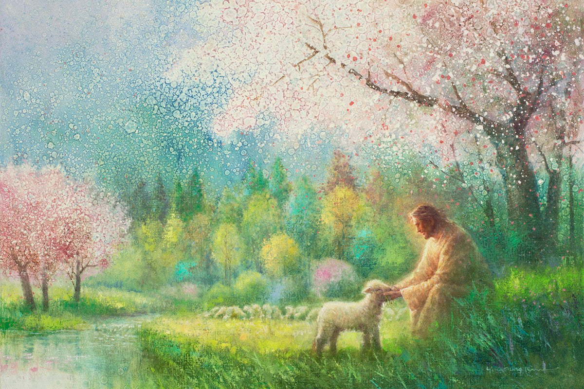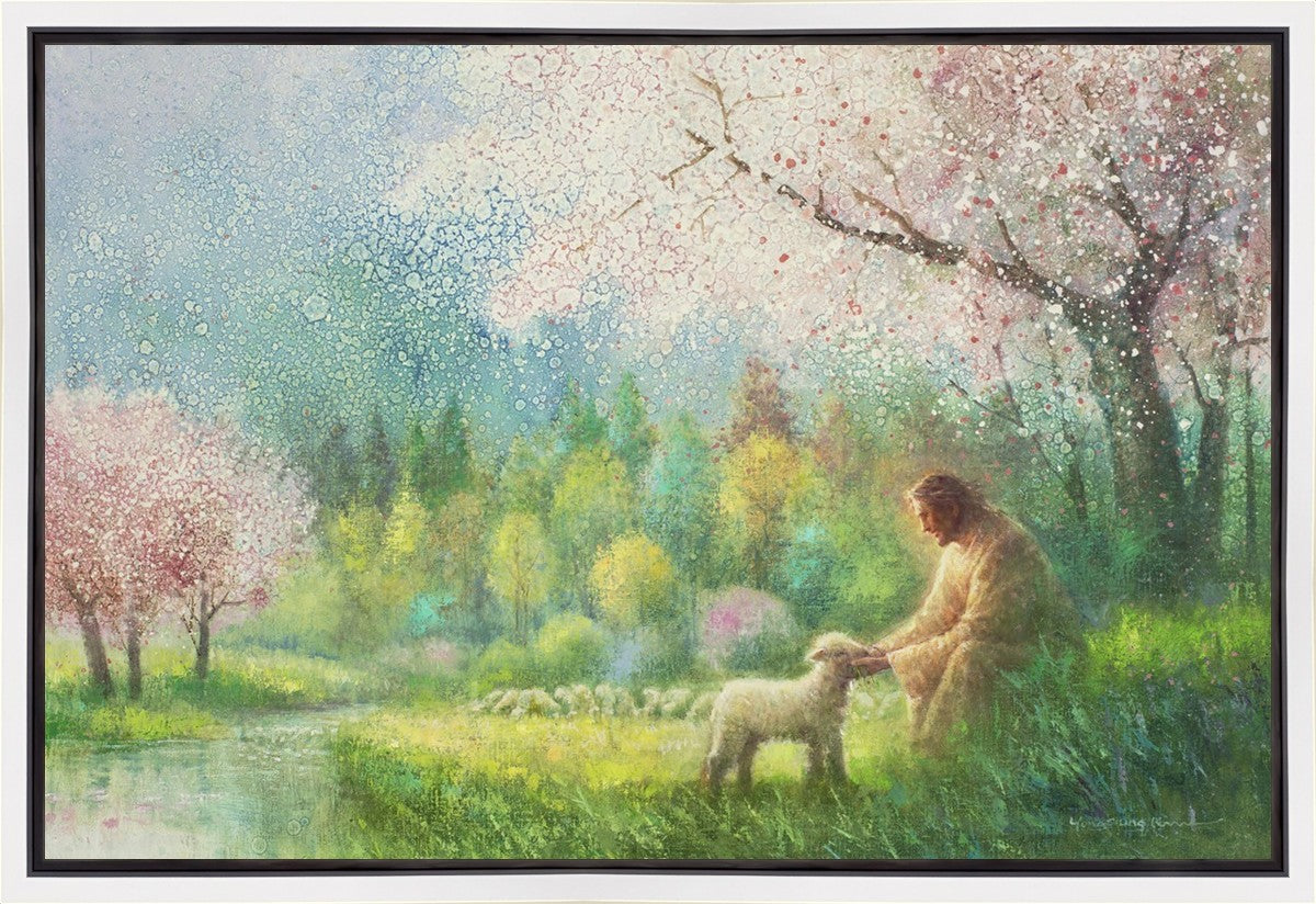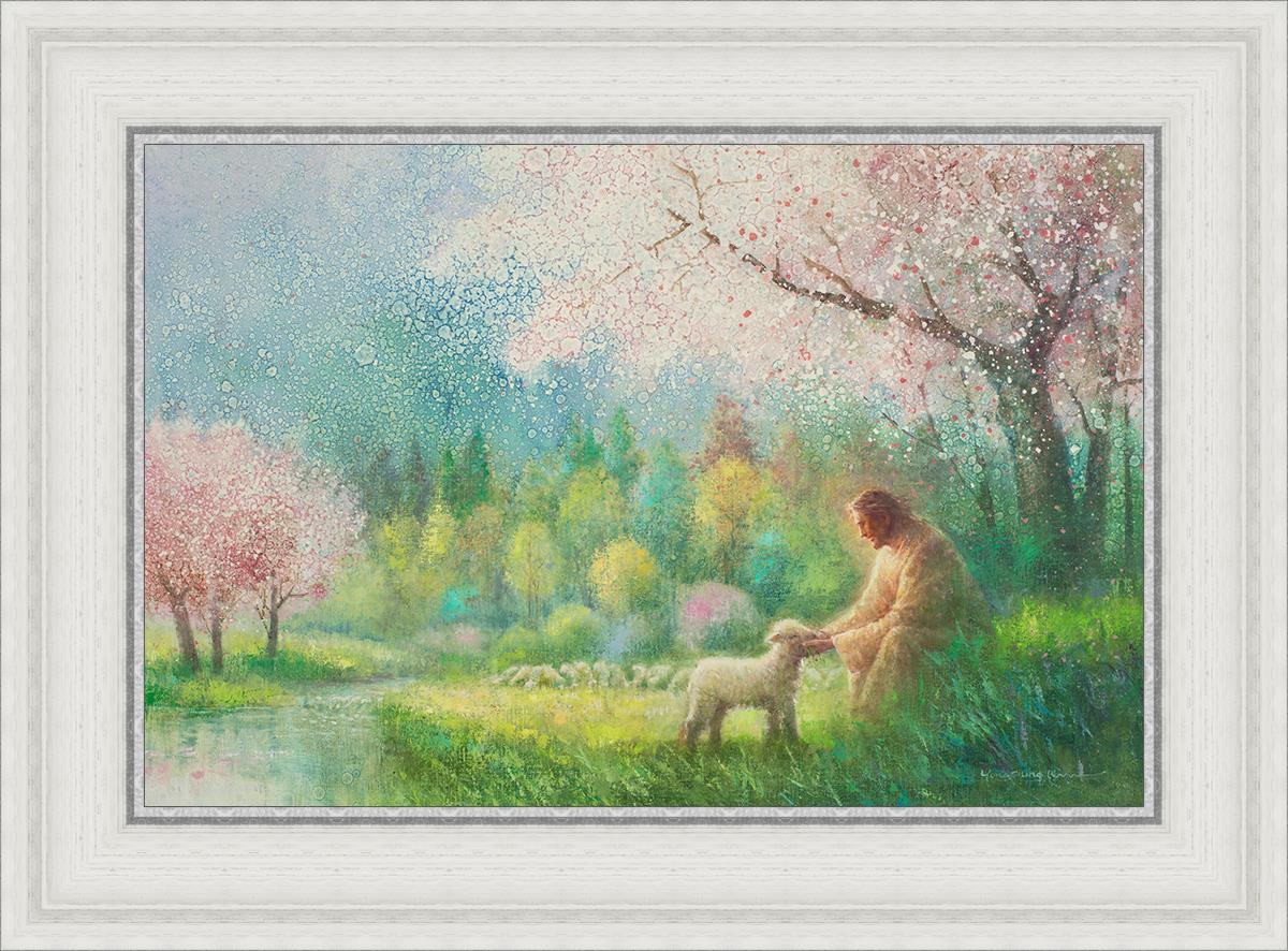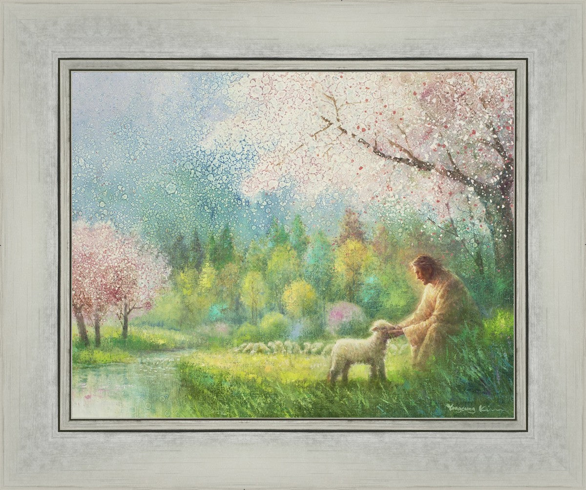 "I Know Thy Name" by Yongsung Kim portrays Jesus Christ comforting a young lamb in a vibrant spring landscape, symbolizing His caring and personal knowledge of each individual.