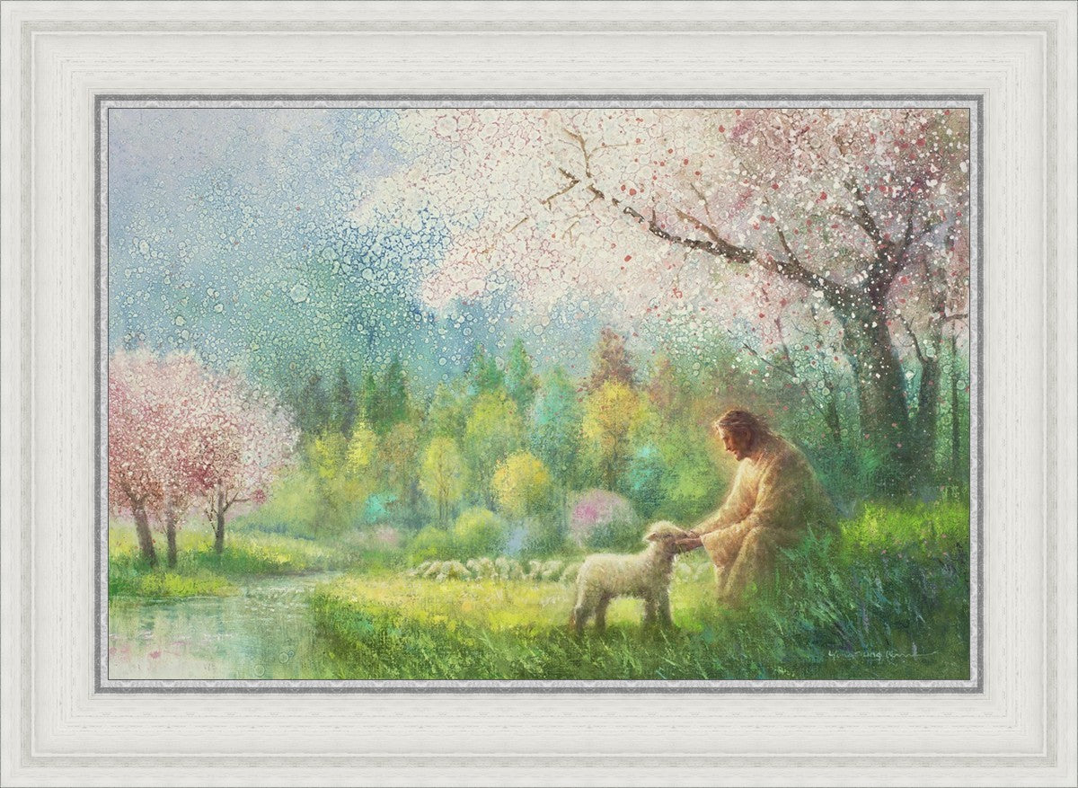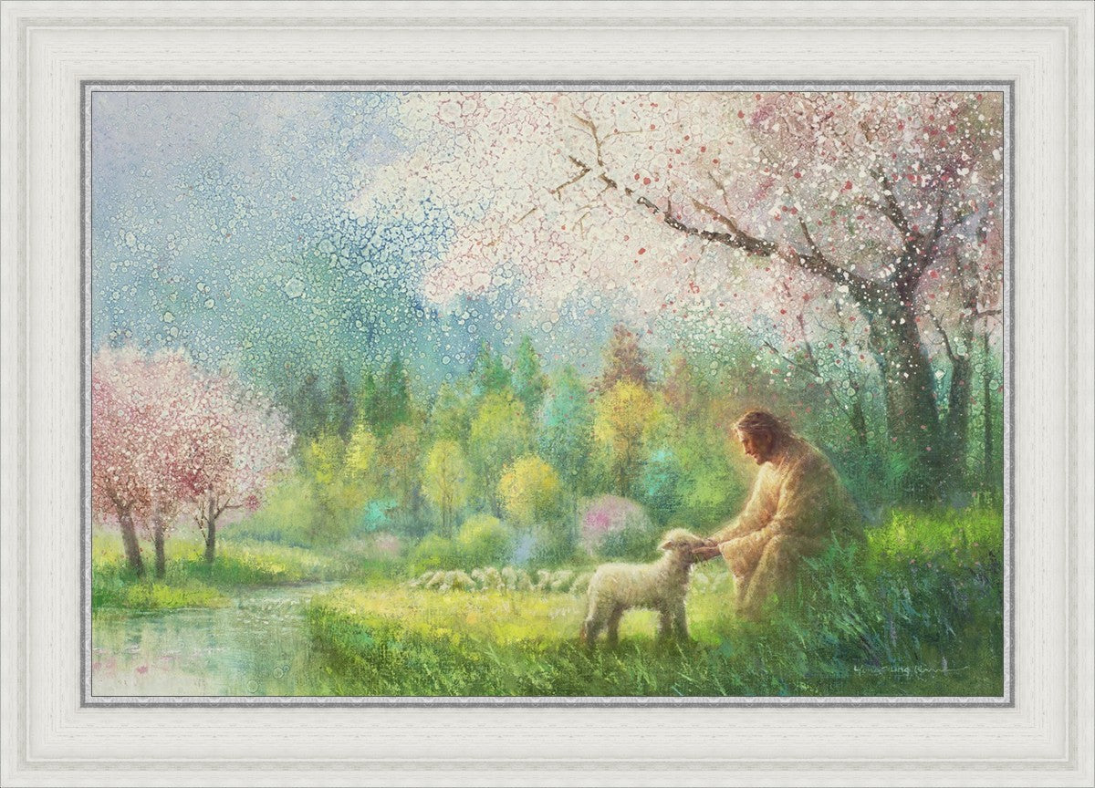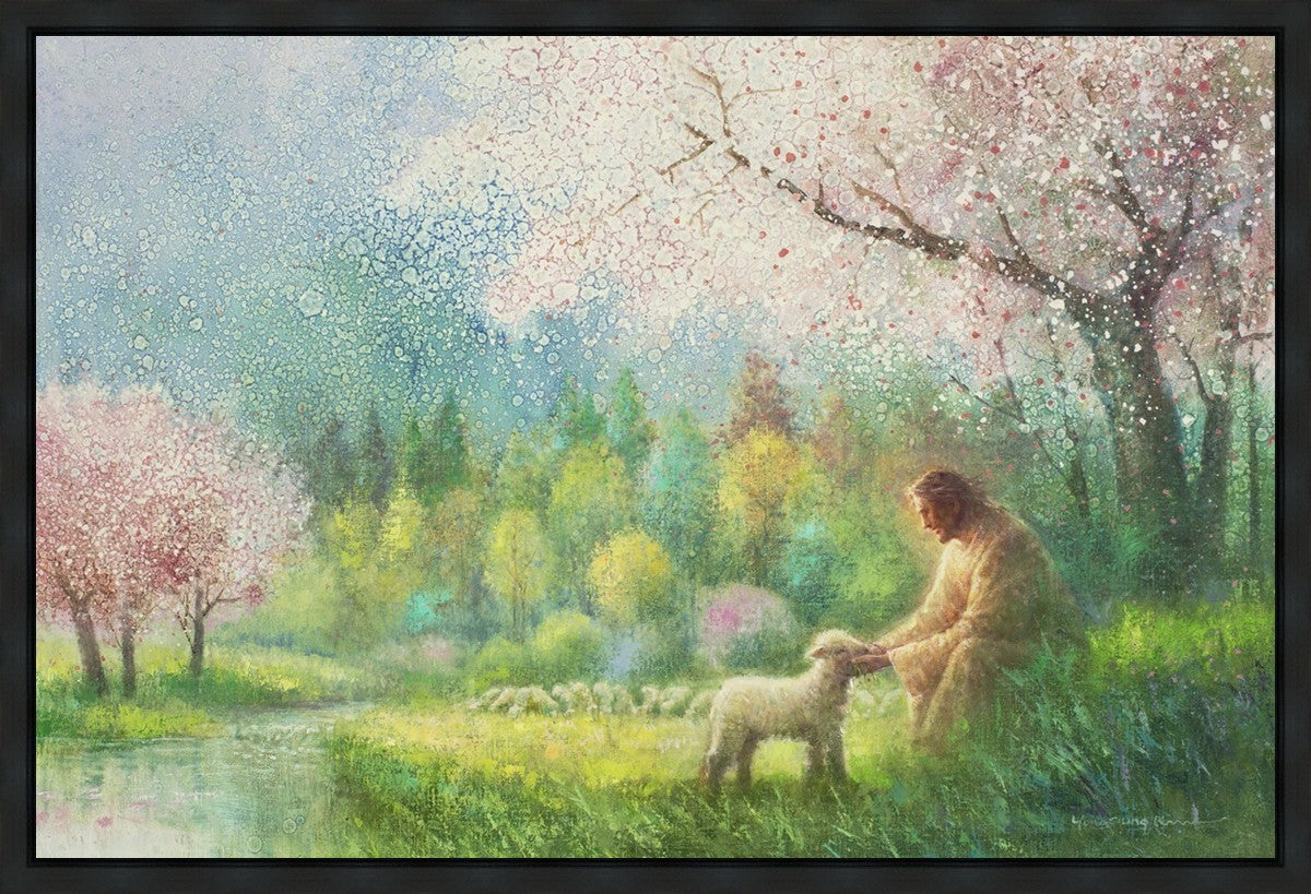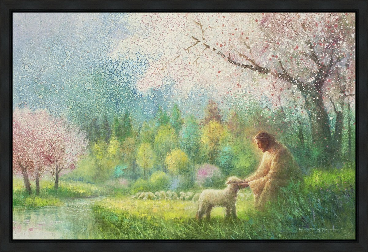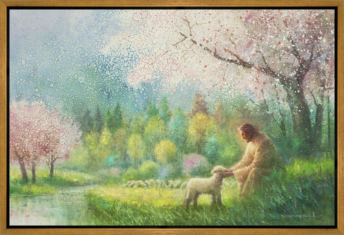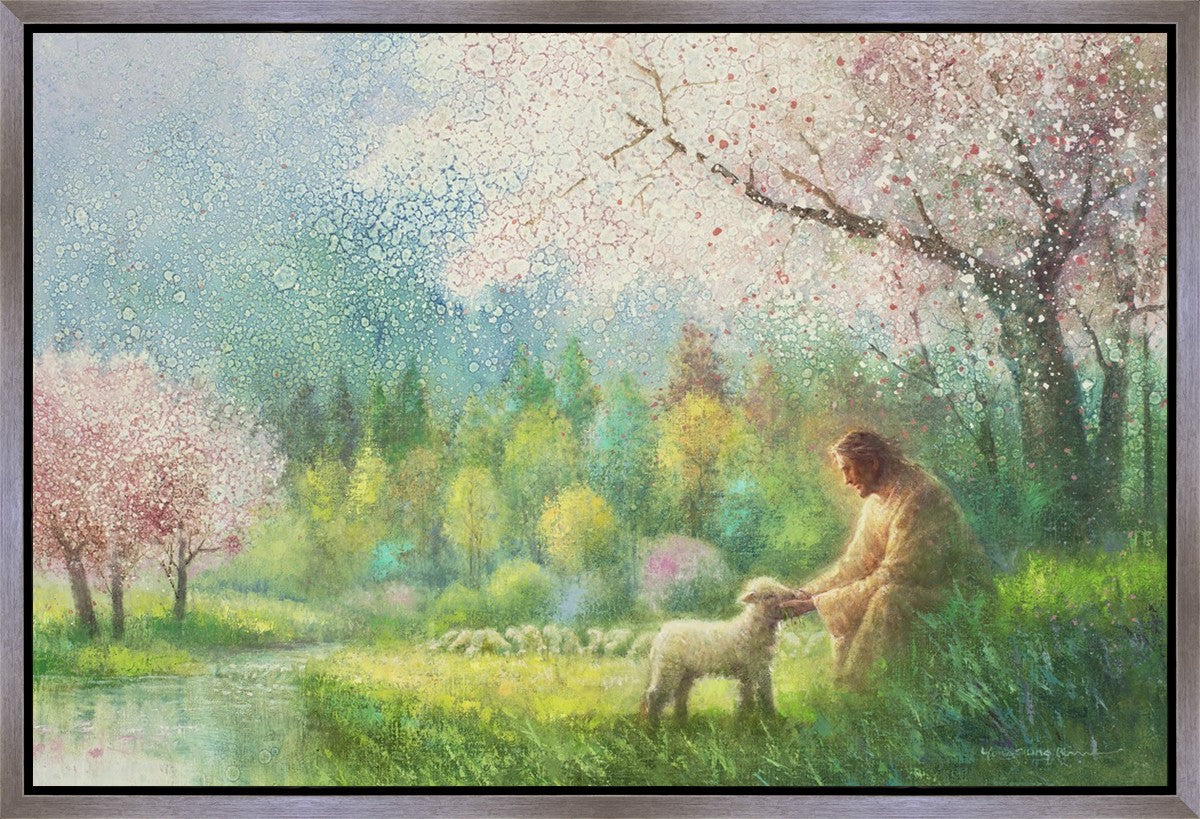 "I Know Thy Name" by Yongsung Kim portrays Jesus Christ comforting a young lamb in a vibrant spring landscape, symbolizing His caring and personal knowledge of each individual.