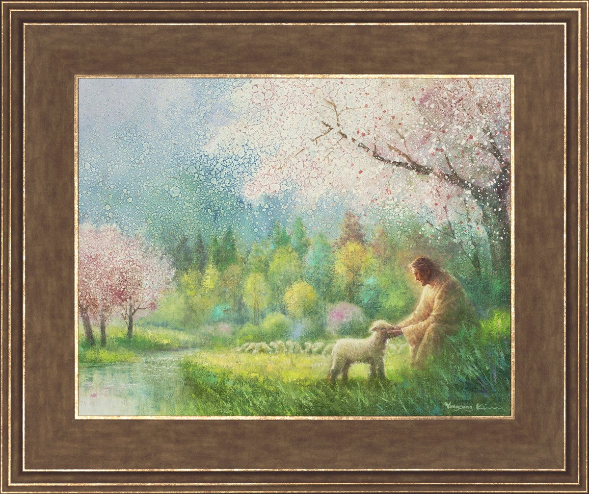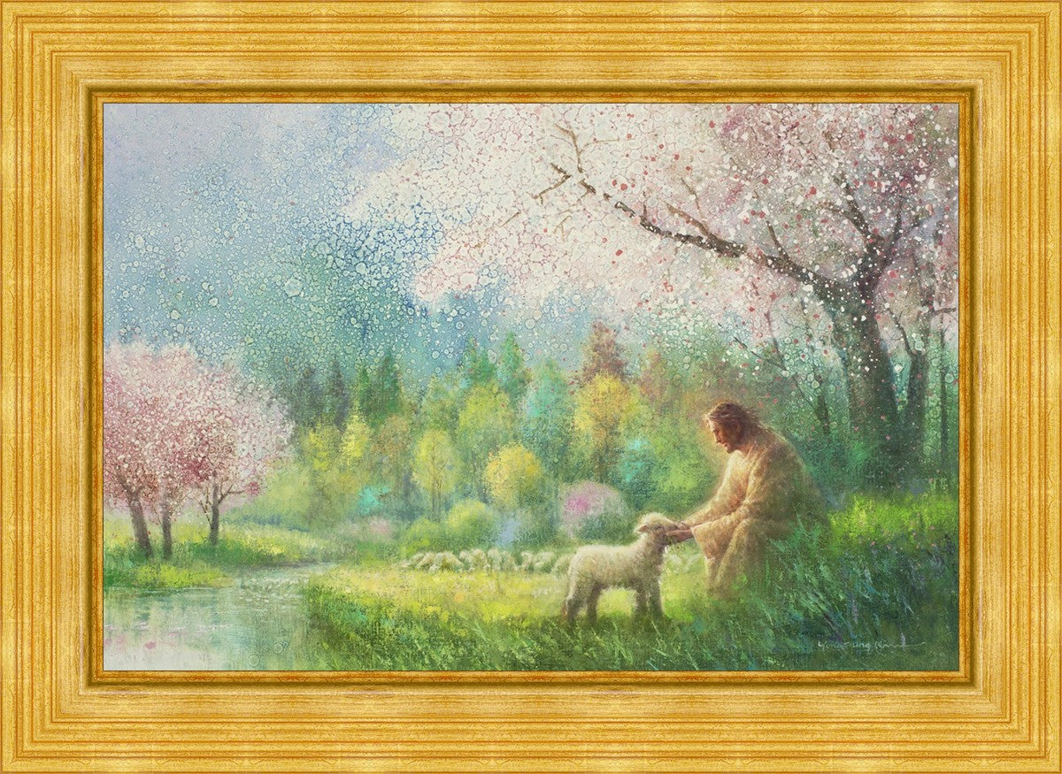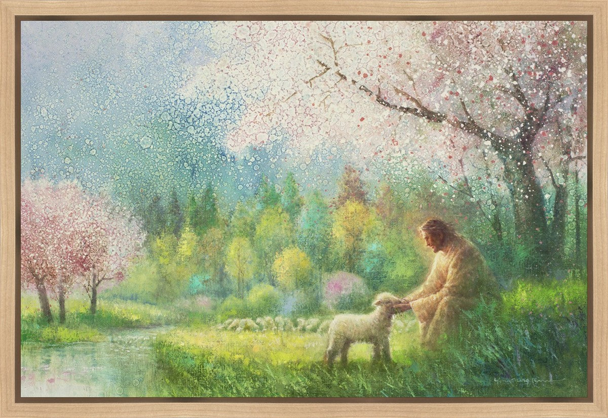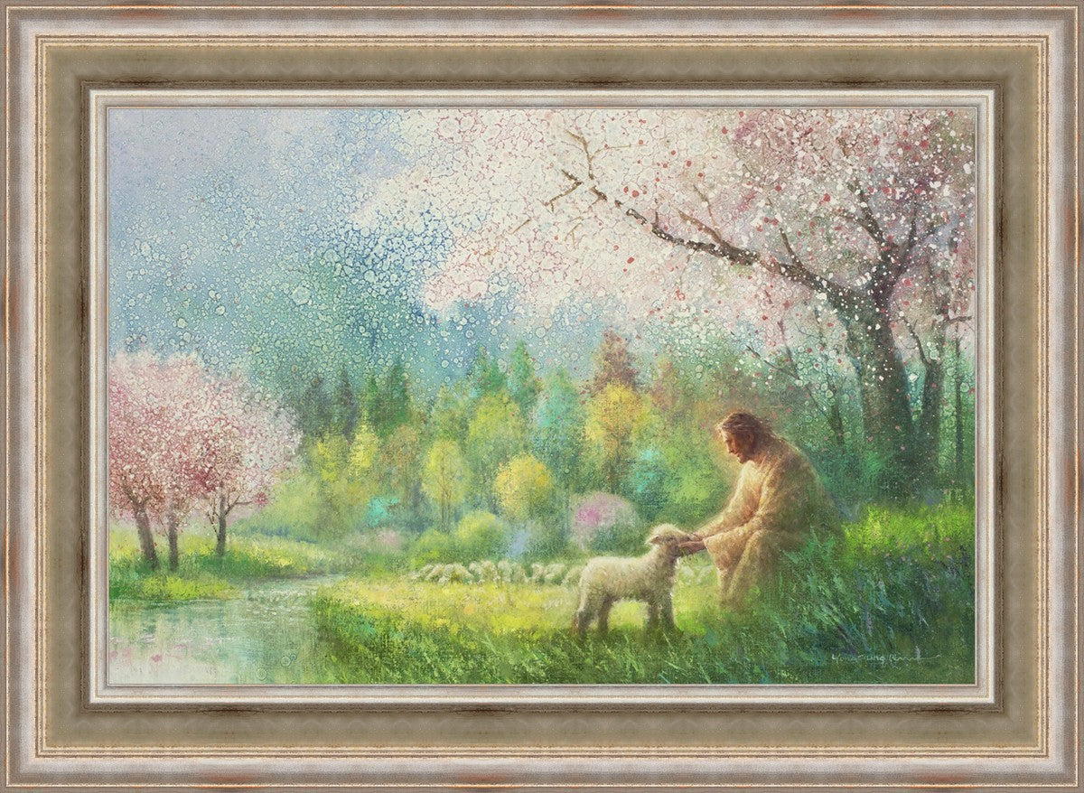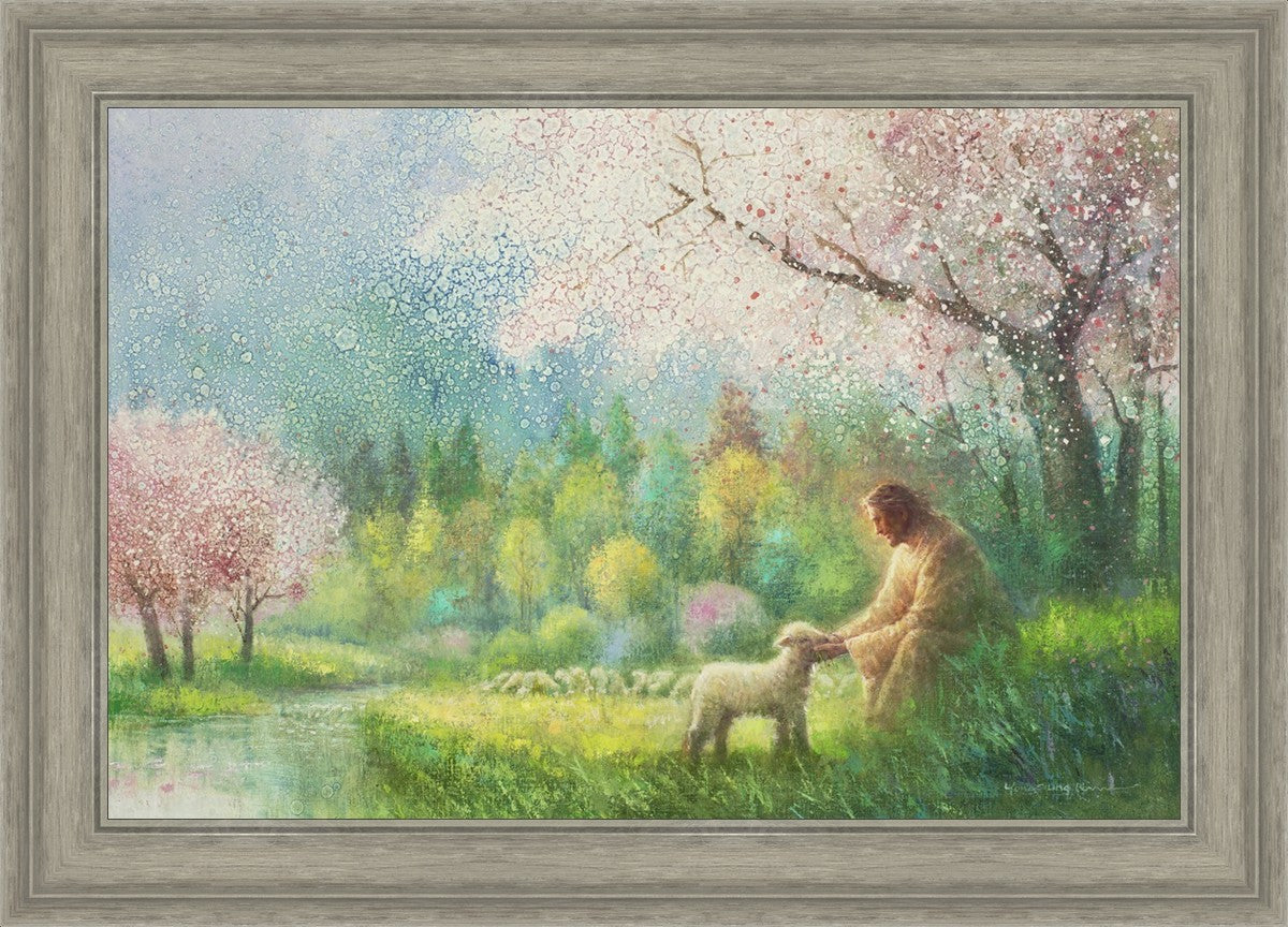 "I Know Thy Name" by Yongsung Kim portrays Jesus Christ comforting a young lamb in a vibrant spring landscape, symbolizing His caring and personal knowledge of each individual.