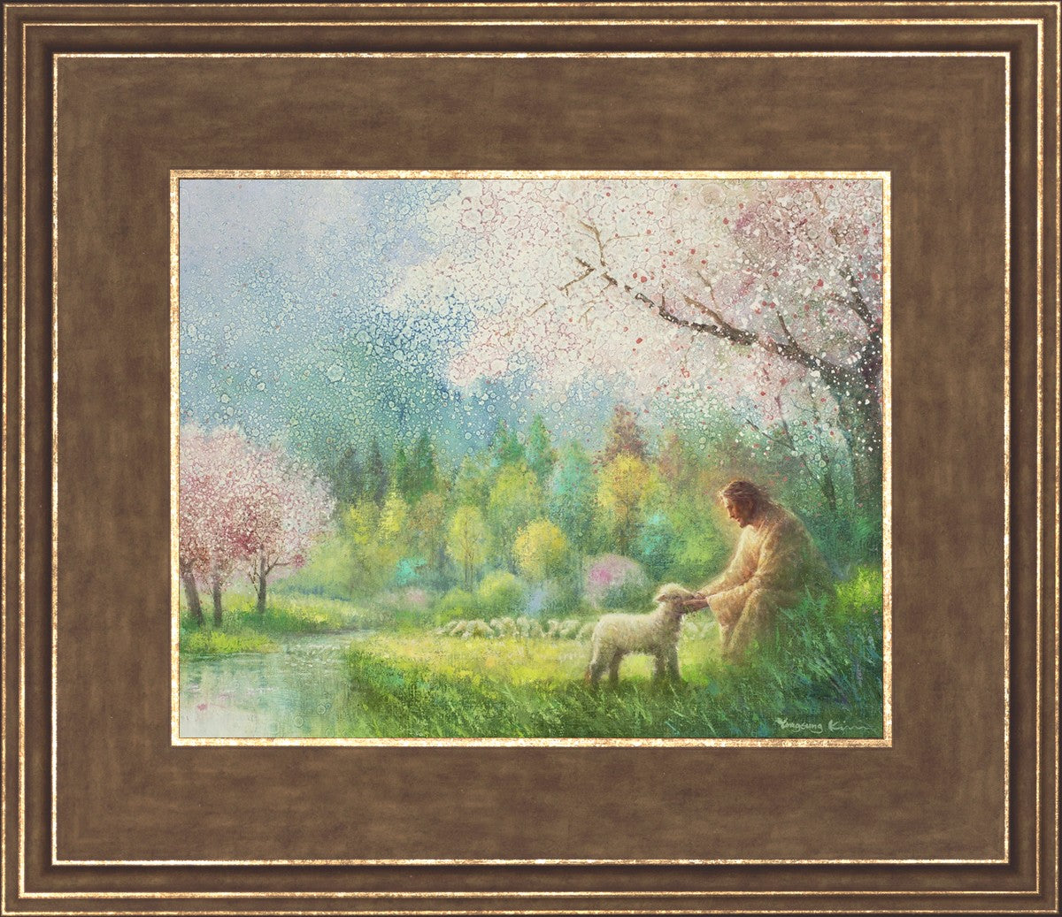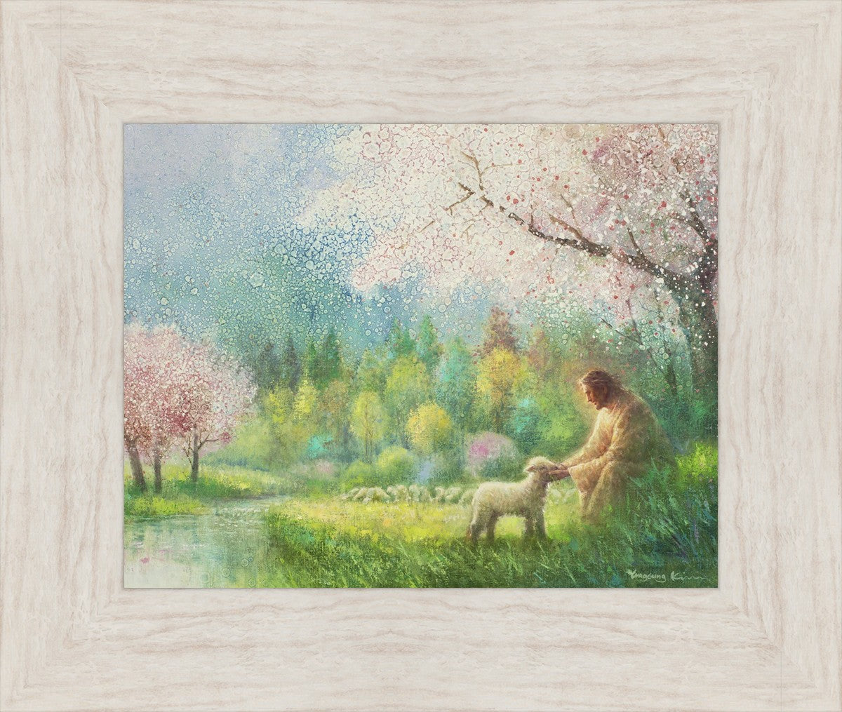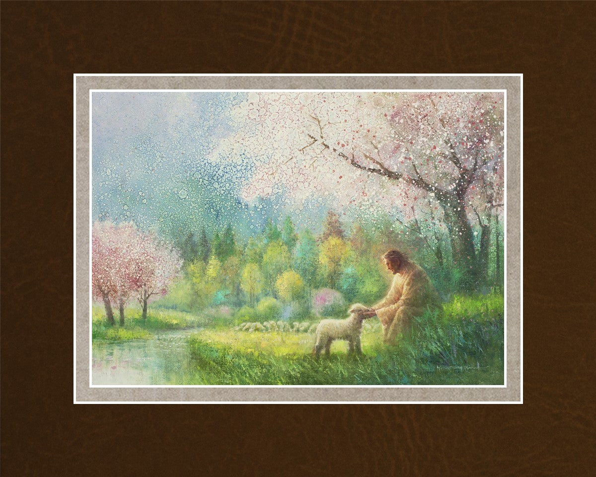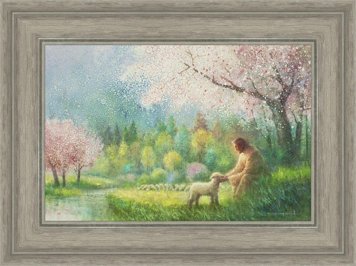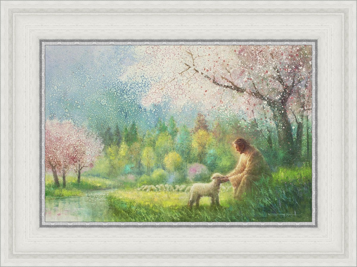 "I Know Thy Name" by Yongsung Kim portrays Jesus Christ comforting a young lamb in a vibrant spring landscape, symbolizing His caring and personal knowledge of each individual.