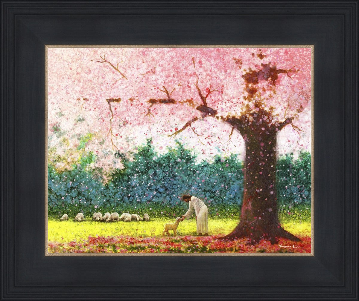 In Green Pastures by Yongsung Kim portrays Jesus Christ tenderly caring for a lamb under a picturesque pink tree, in a green pasture. This artwork from Yongsung Kim resonates with viewers seeking a deeper connection to their faith journey.