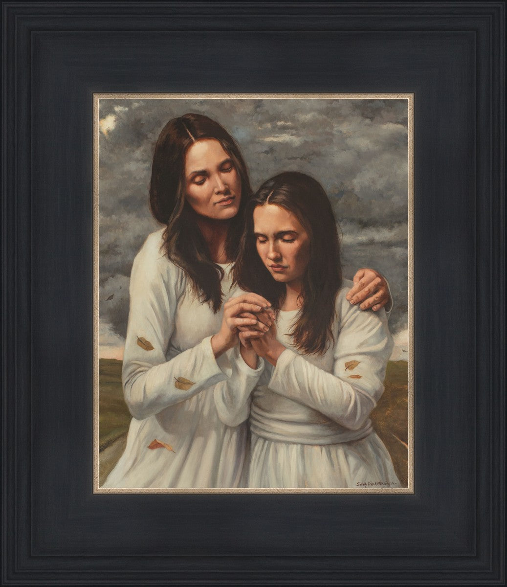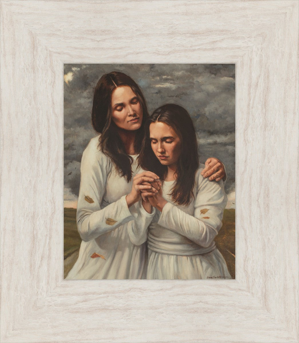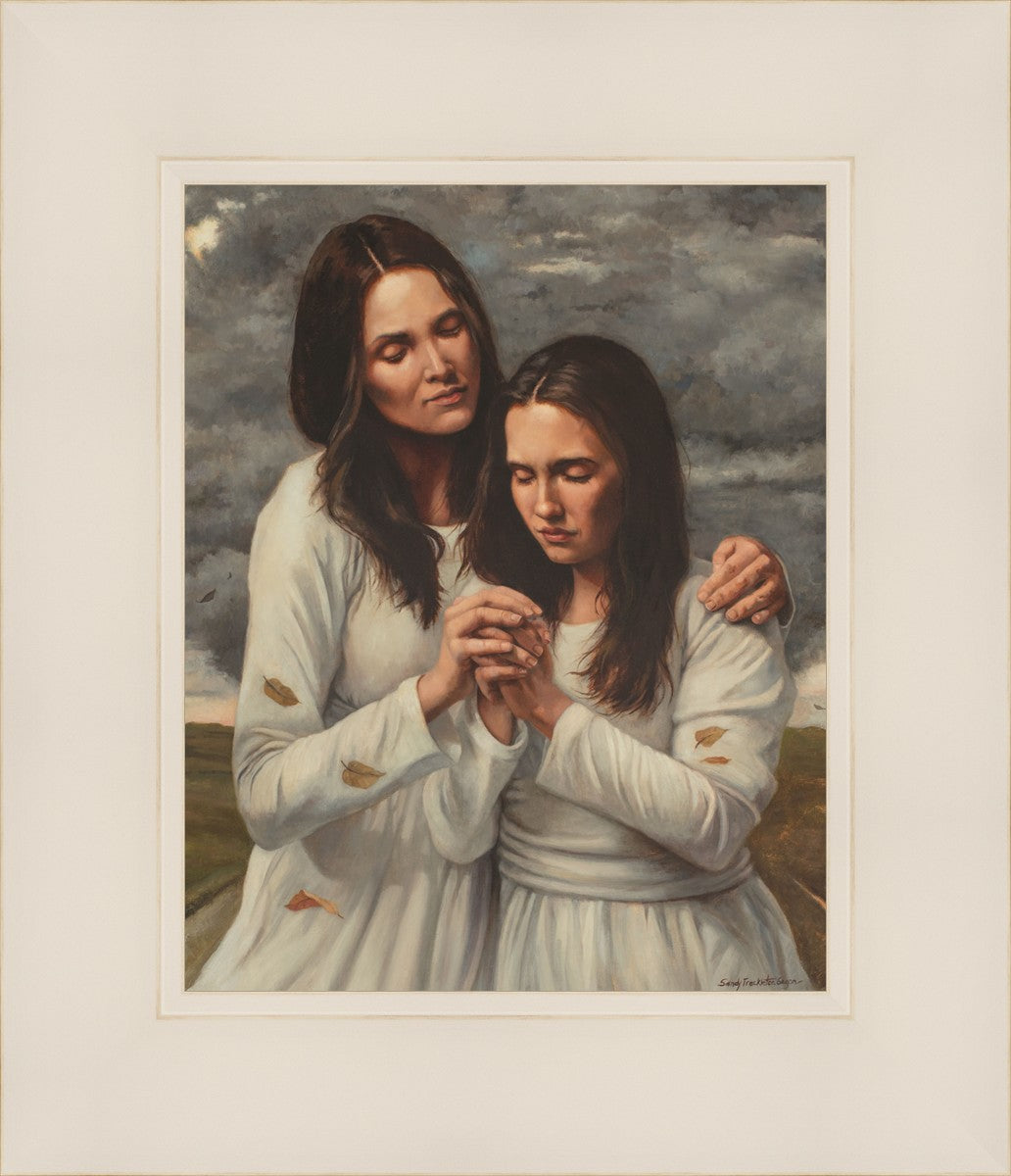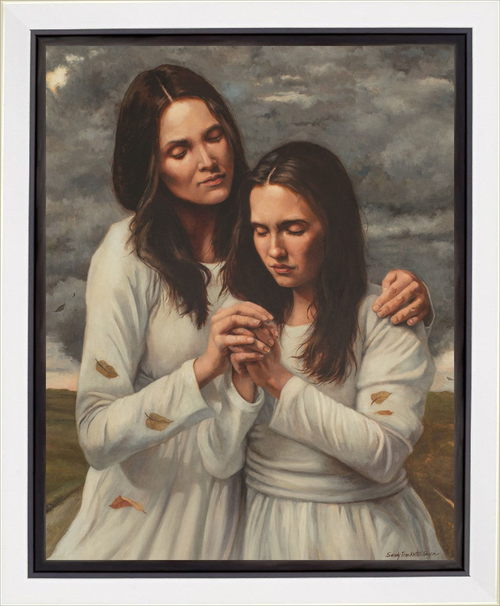 In this painting I have two women in fervent prayer seeking strength and solace. The background is a storm. The detritus of life is symbolized in the leaves swirling around them. I loved painting the light emerging from the clouds, to me this symbolized hope even in the dark. I heard a statement by Dr. Lili De Hoyos Anderson: “Faith grows in the dark” How do we become stronger in the dark regardless of age or circumstances? 2022 brought me personally to a new level of understanding of this timeless question, what is the purpose of pain? It has given me opportunities to reframe and look again more clearly. In the strength of the Lord, I can do all things