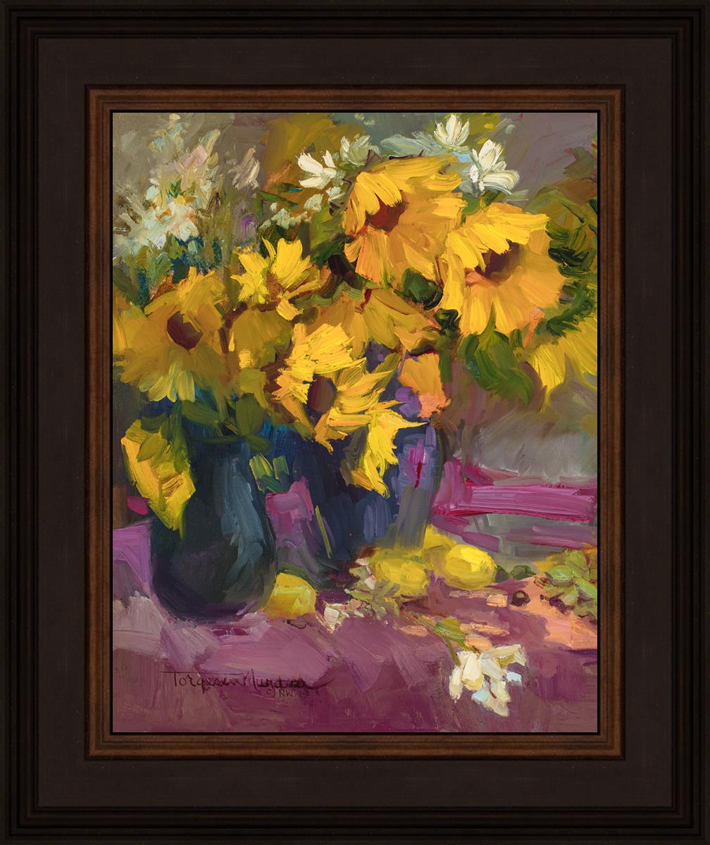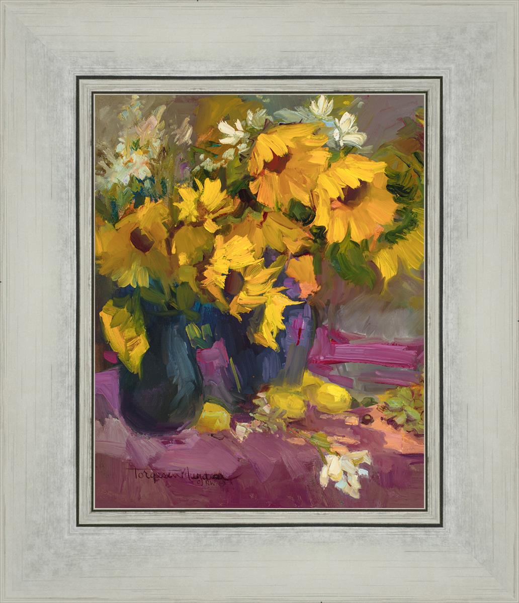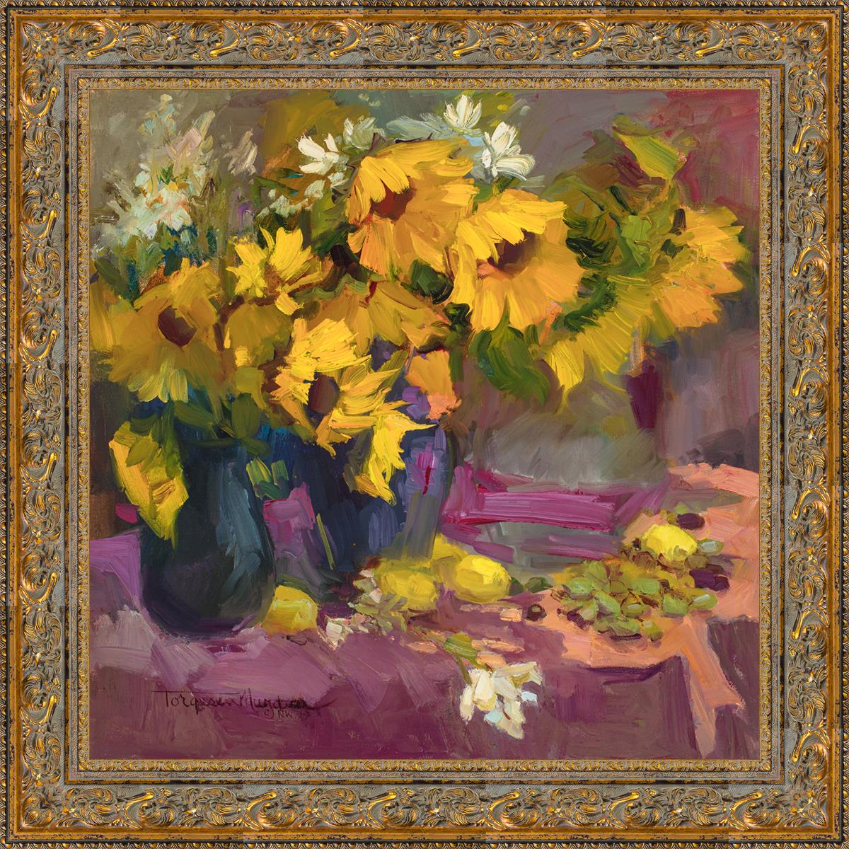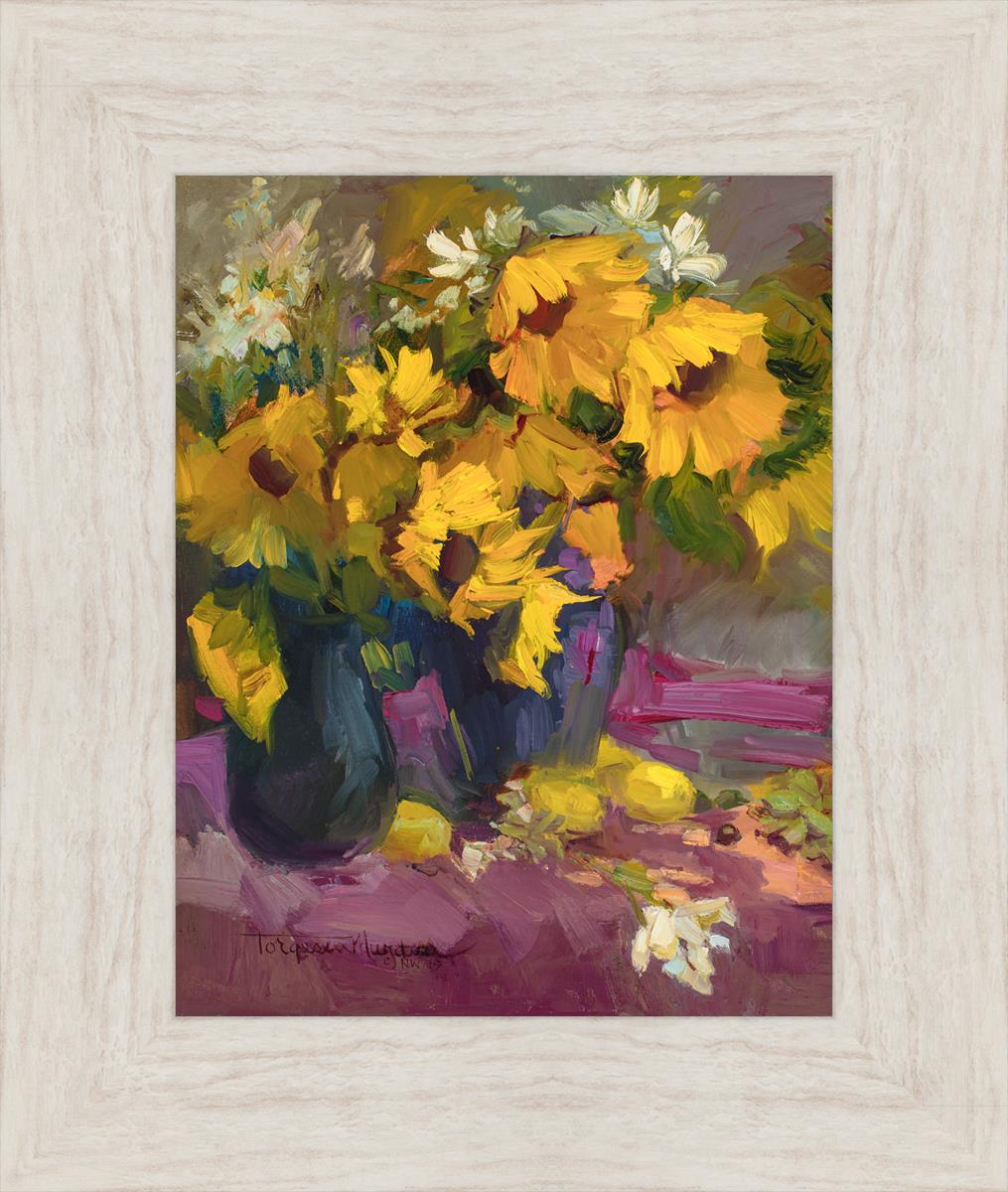 Fields of Sunflowers fill my heart with sunshine. So when I can’t go out be it rain or wind, I grab some sunflowers and set them up in the studio with a few white california poppies, a purple cloth to set off the yellow, and a ribbon for leading the eye. Turn a little studio light on the setup and VOILA’ ! Inner Sunshine