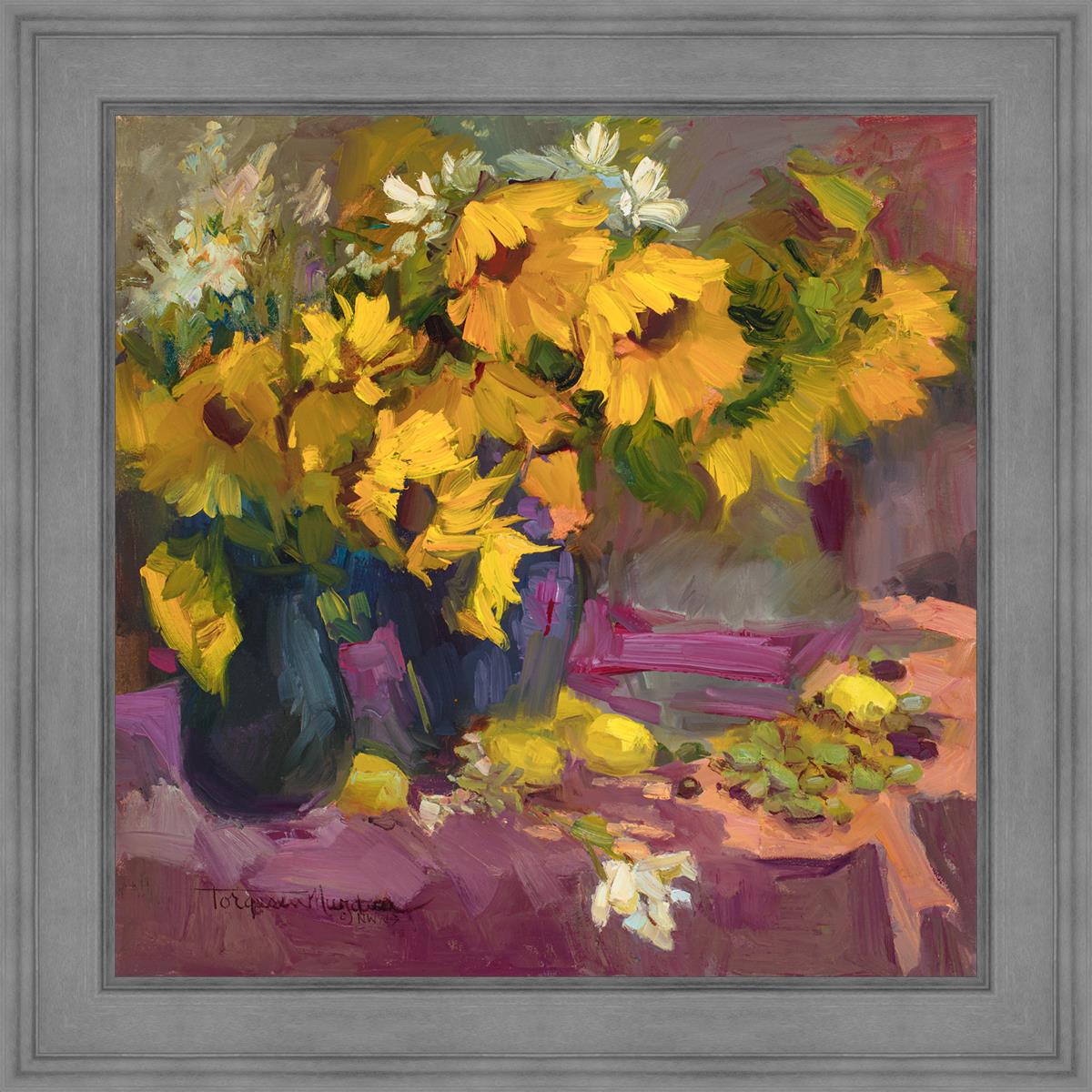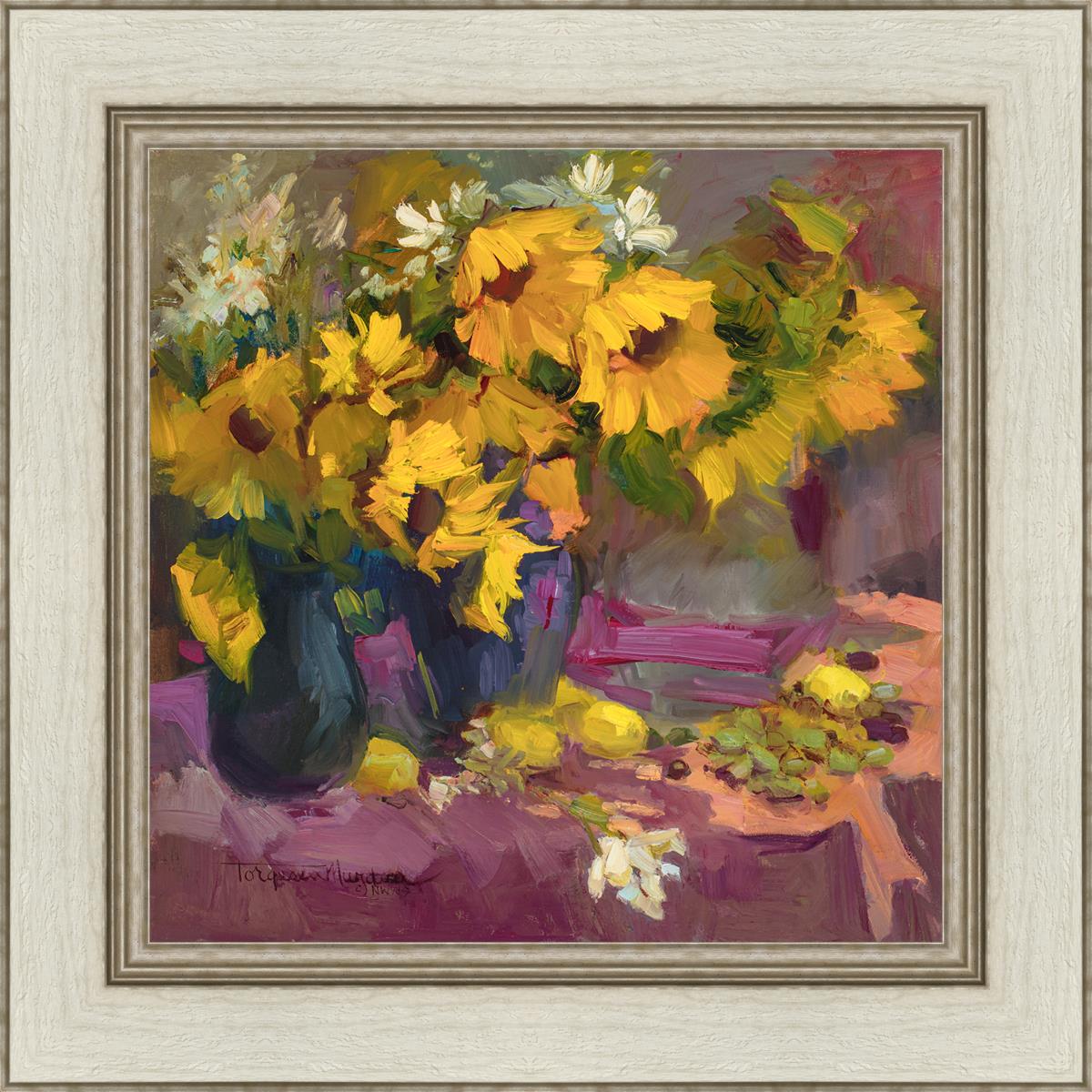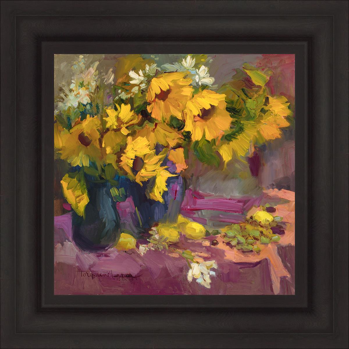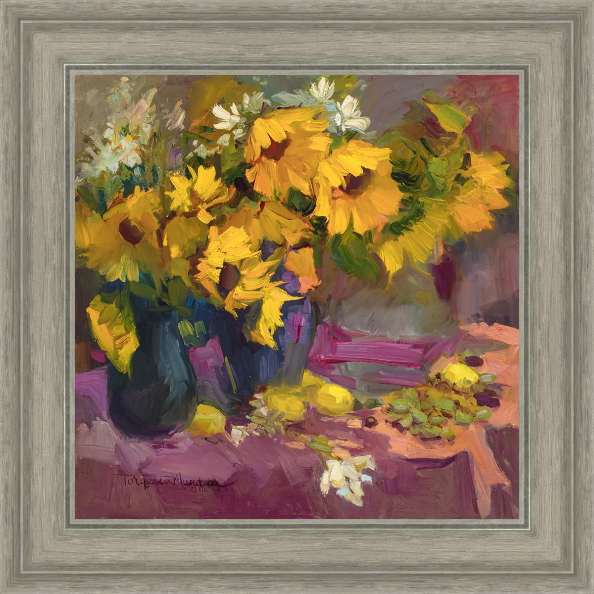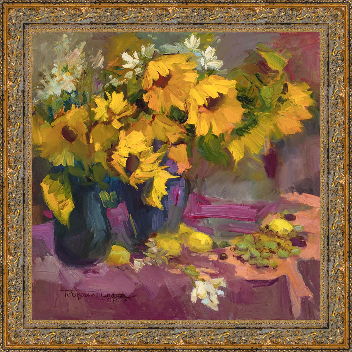 Fields of Sunflowers fill my heart with sunshine. So when I can’t go out be it rain or wind, I grab some sunflowers and set them up in the studio with a few white california poppies, a purple cloth to set off the yellow, and a ribbon for leading the eye. Turn a little studio light on the setup and VOILA’ ! Inner Sunshine