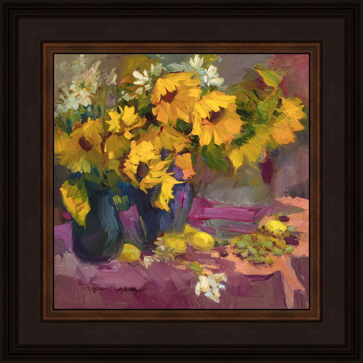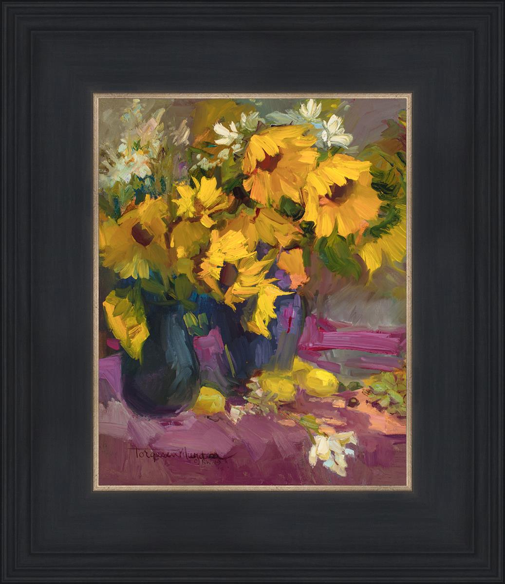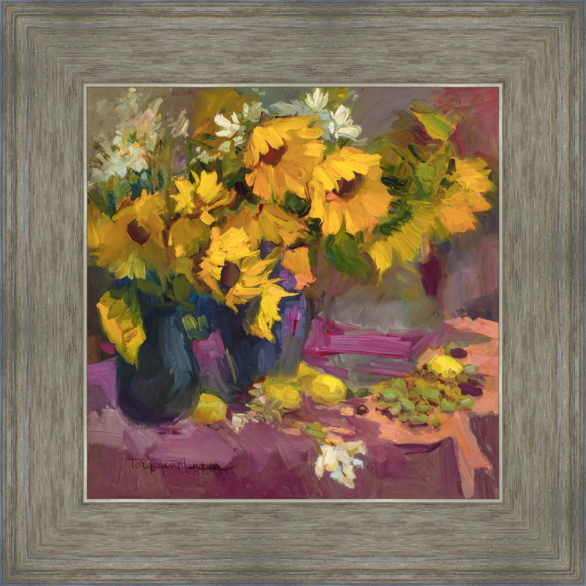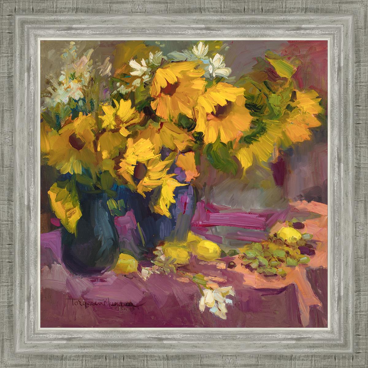 Fields of Sunflowers fill my heart with sunshine. So when I can’t go out be it rain or wind, I grab some sunflowers and set them up in the studio with a few white california poppies, a purple cloth to set off the yellow, and a ribbon for leading the eye. Turn a little studio light on the setup and VOILA’ ! Inner Sunshine