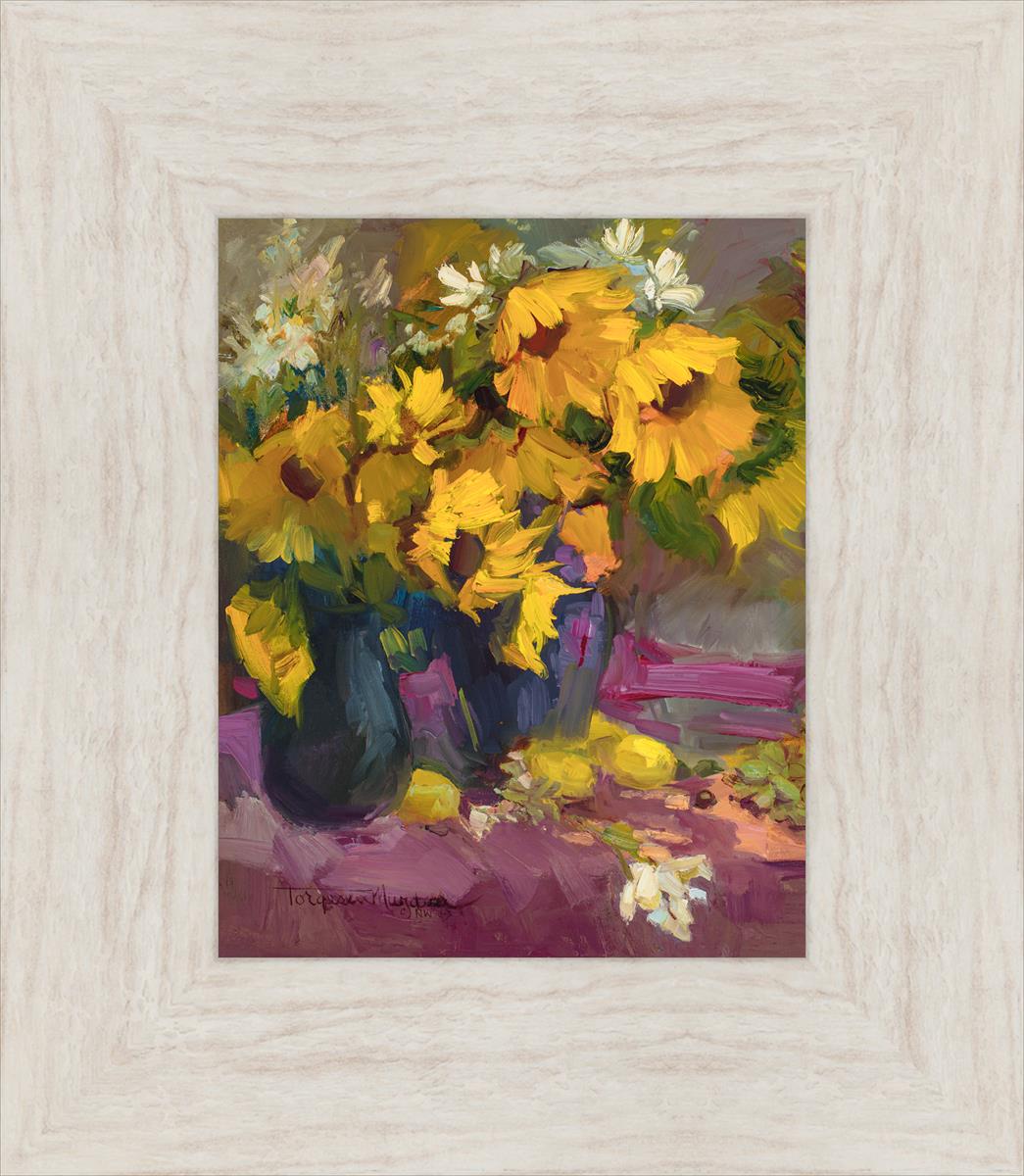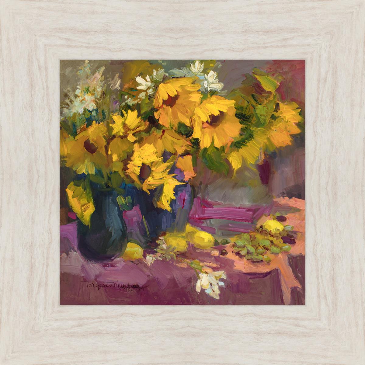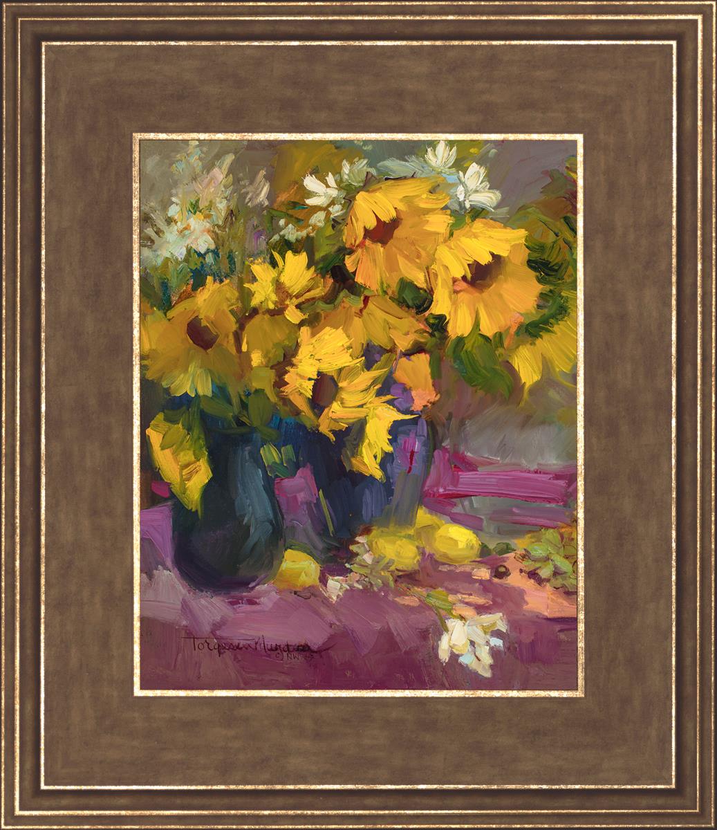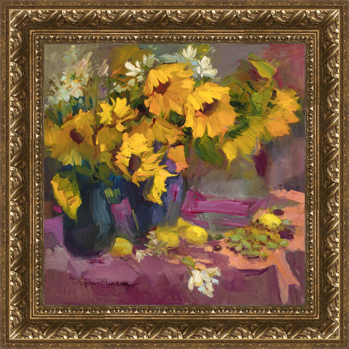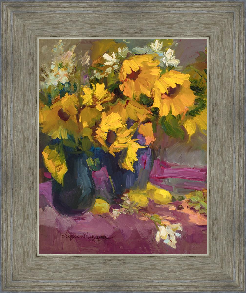 Fields of Sunflowers fill my heart with sunshine. So when I can’t go out be it rain or wind, I grab some sunflowers and set them up in the studio with a few white california poppies, a purple cloth to set off the yellow, and a ribbon for leading the eye. Turn a little studio light on the setup and VOILA’ ! Inner Sunshine