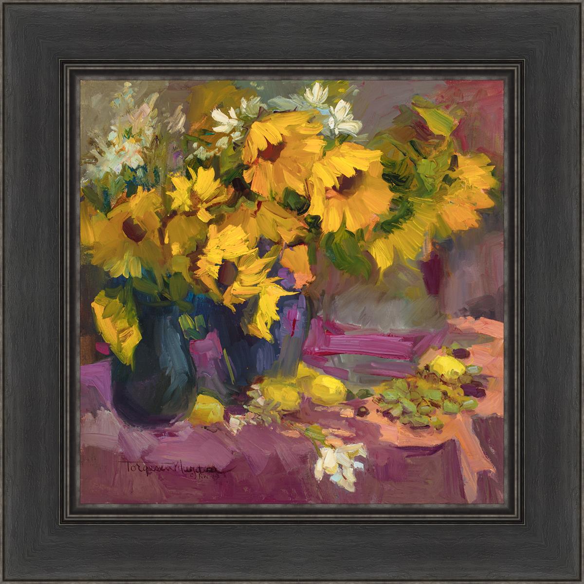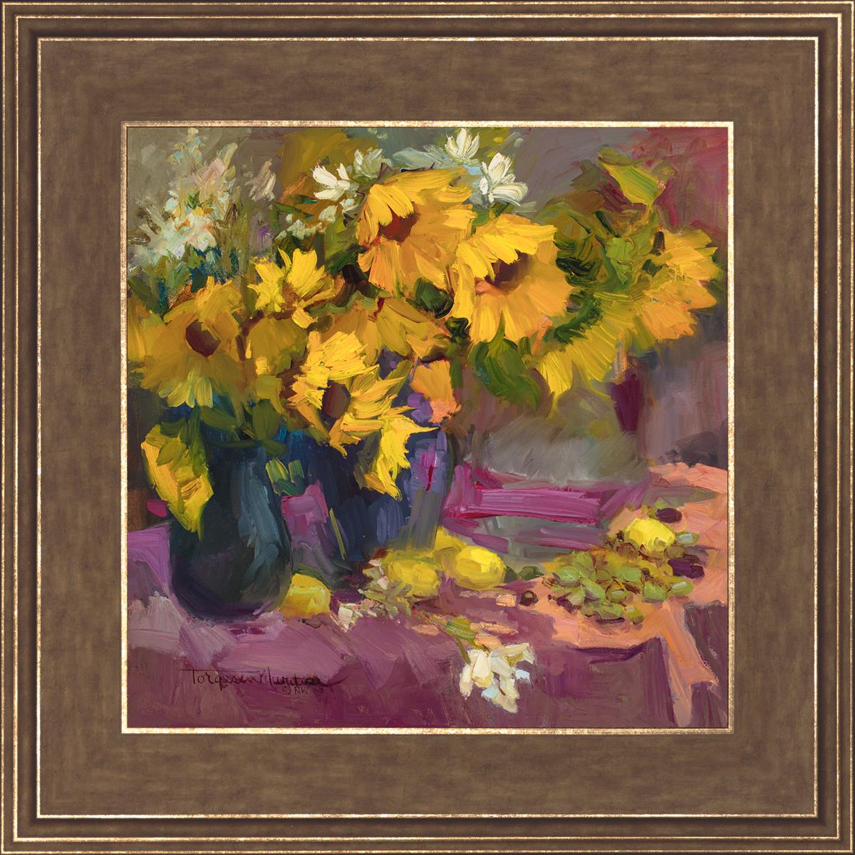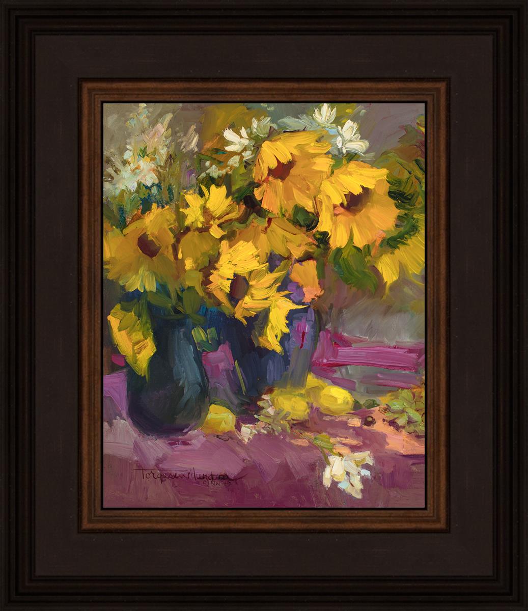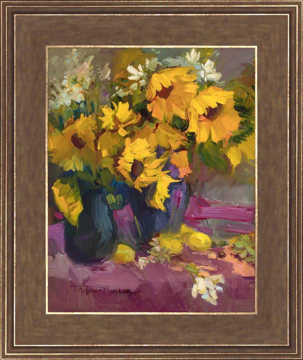 Fields of Sunflowers fill my heart with sunshine. So when I can’t go out be it rain or wind, I grab some sunflowers and set them up in the studio with a few white california poppies, a purple cloth to set off the yellow, and a ribbon for leading the eye. Turn a little studio light on the setup and VOILA’ ! Inner Sunshine