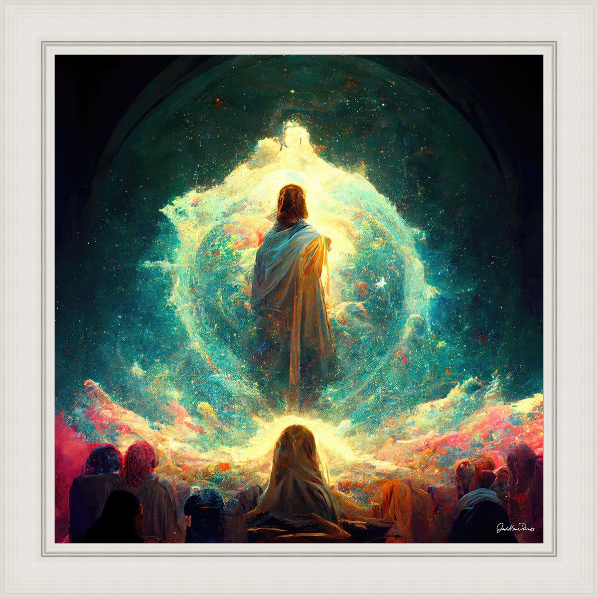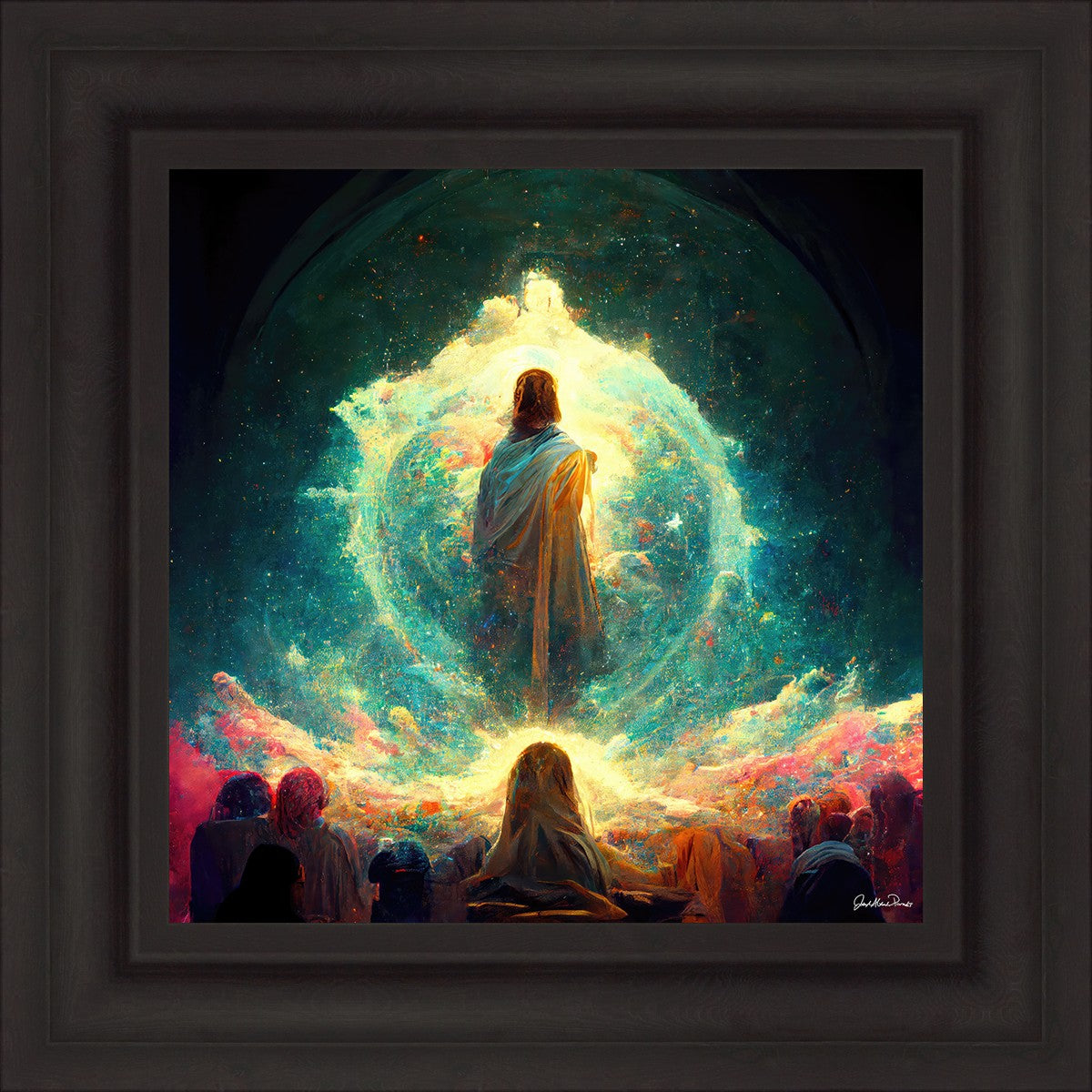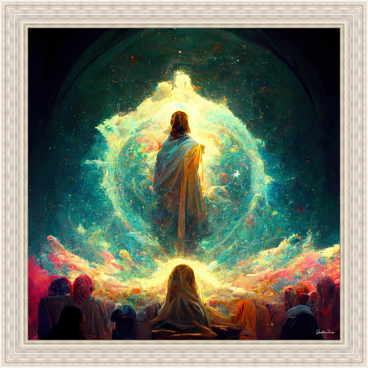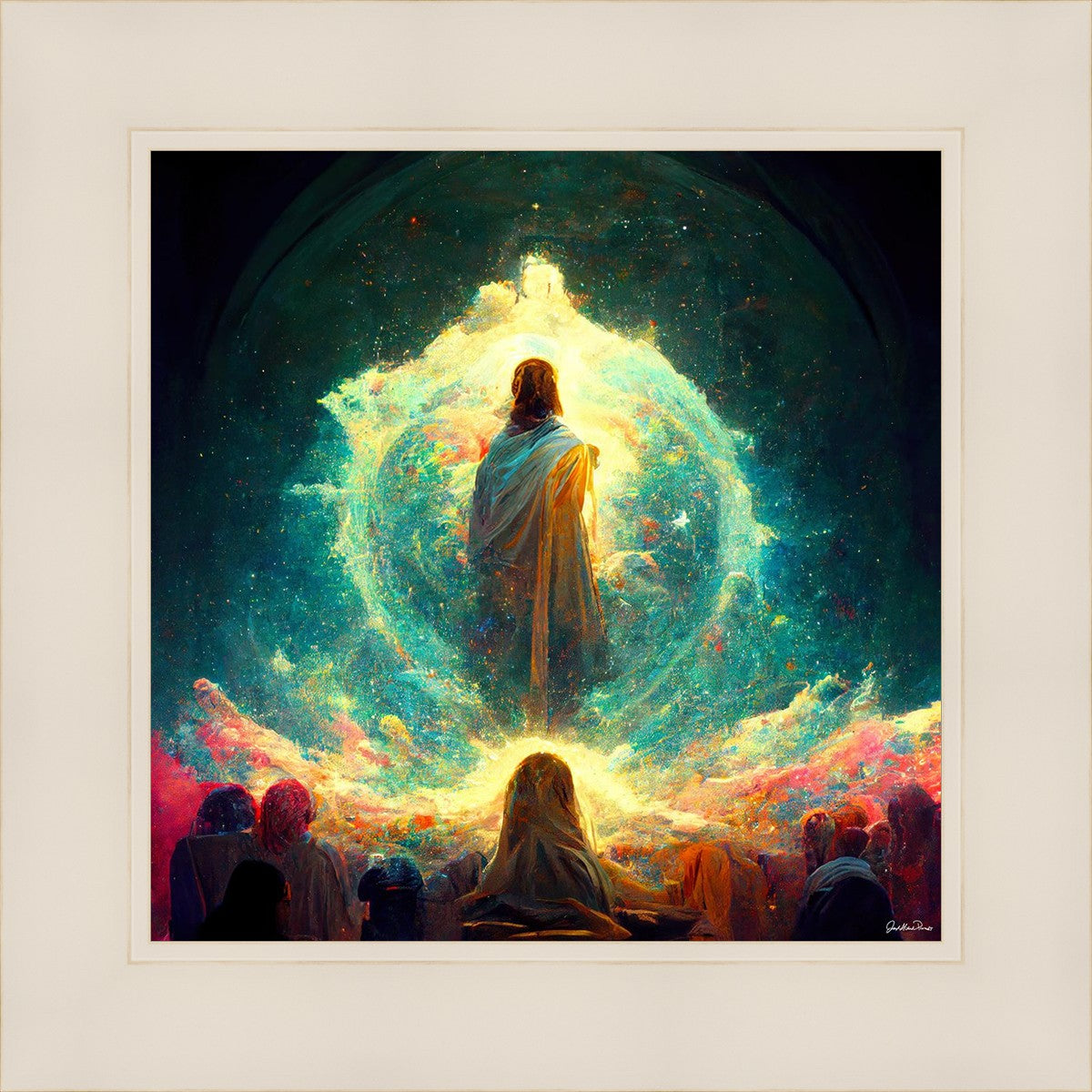 This piece depicts all of God’s children in the beginning witnessing the Savior create the universe and Earth, upon which we would live out our mortal lives.