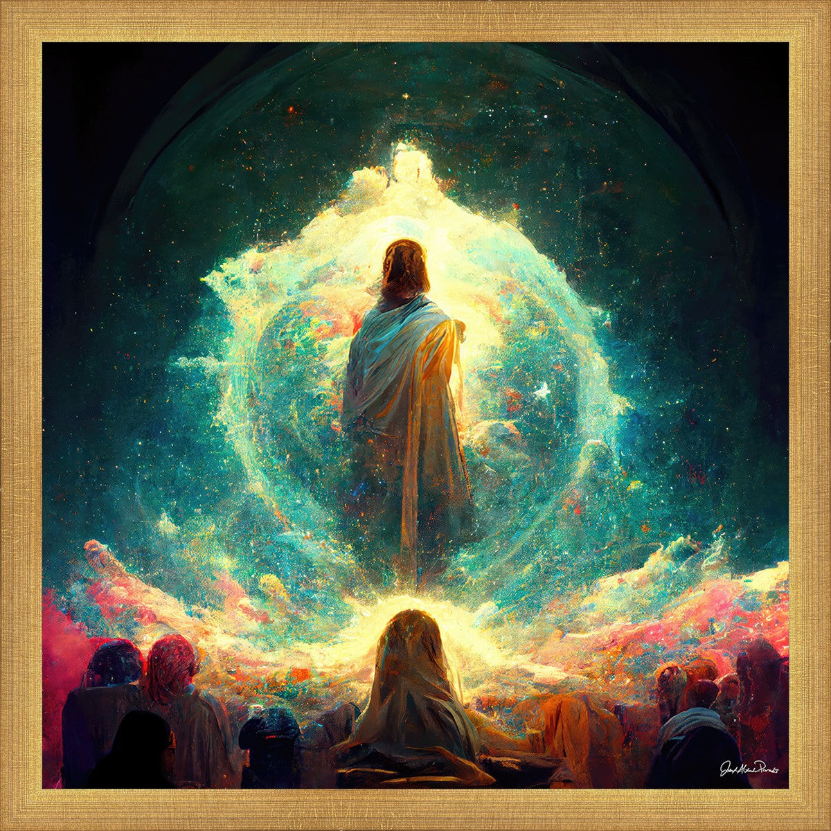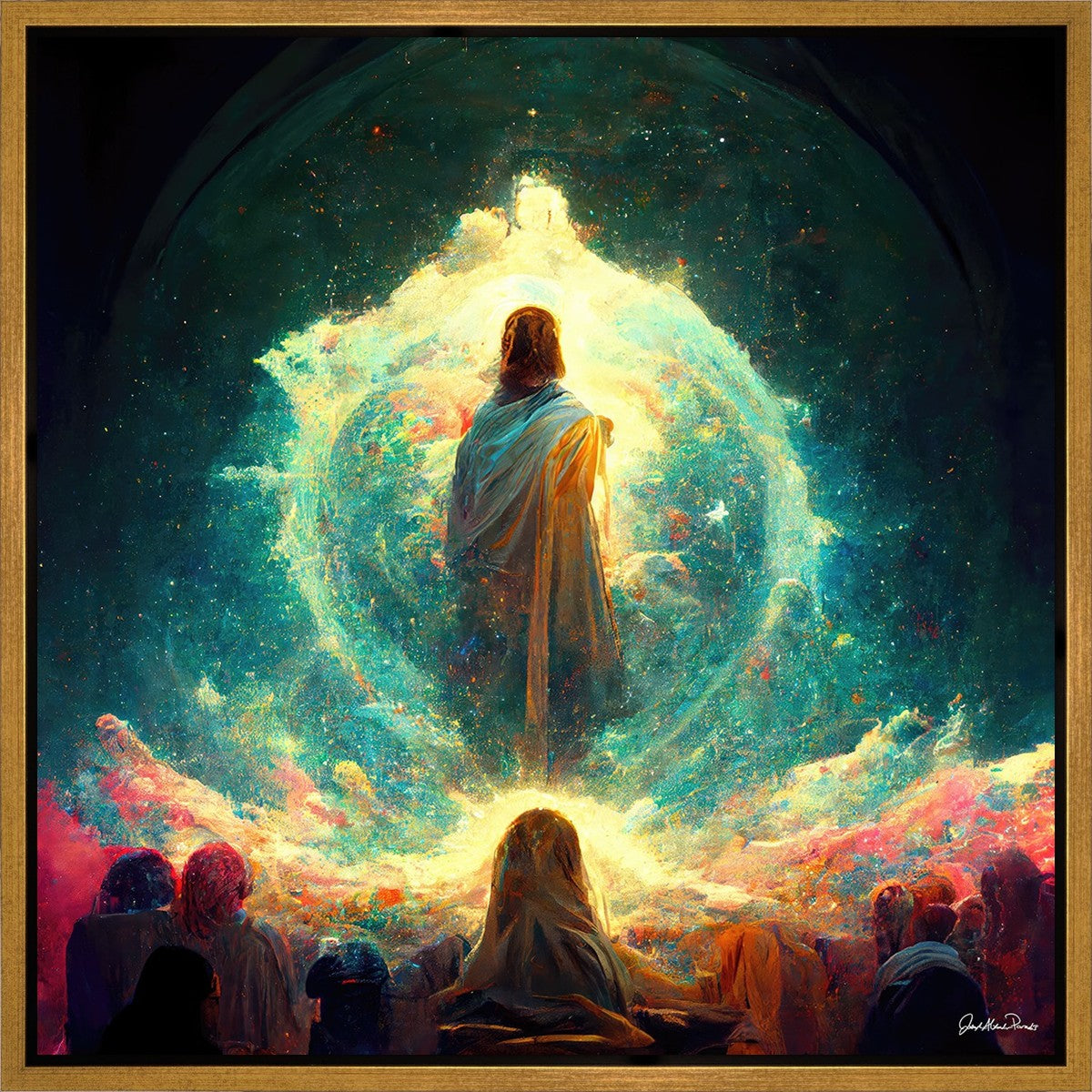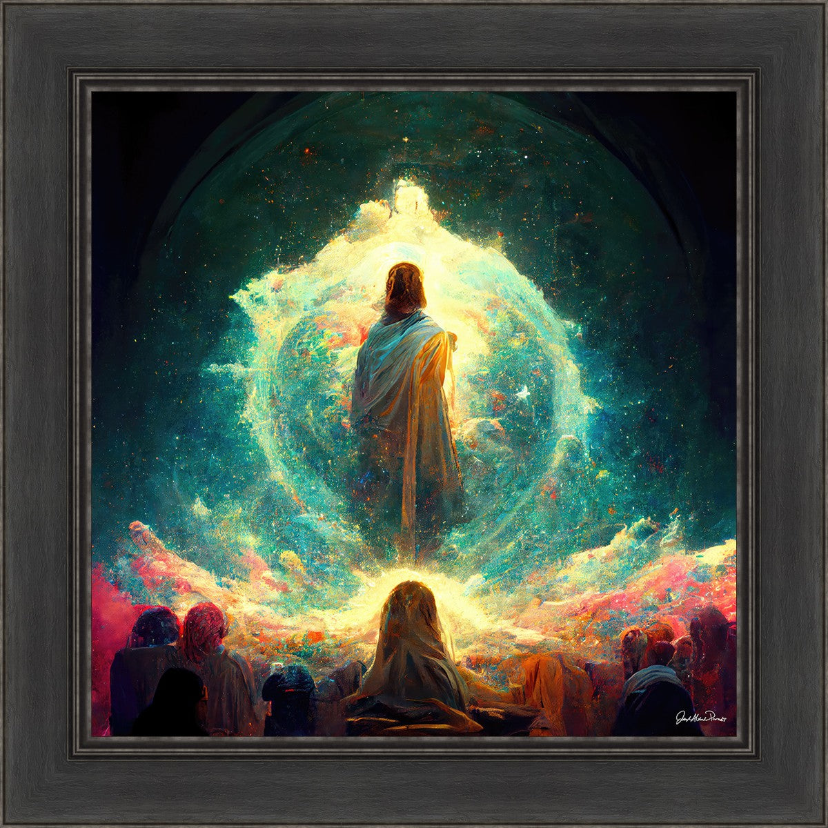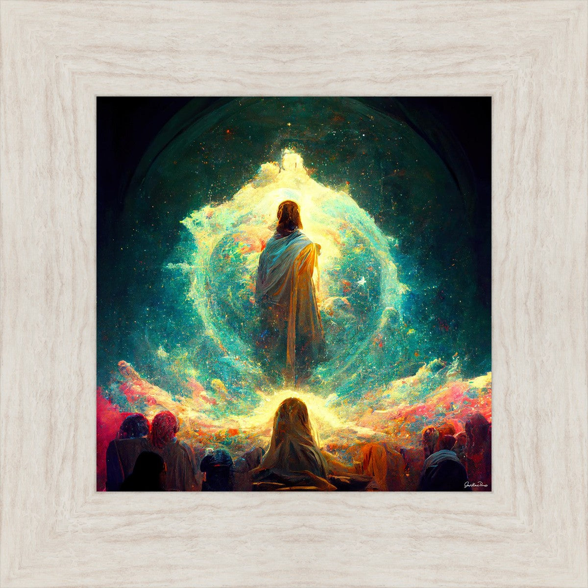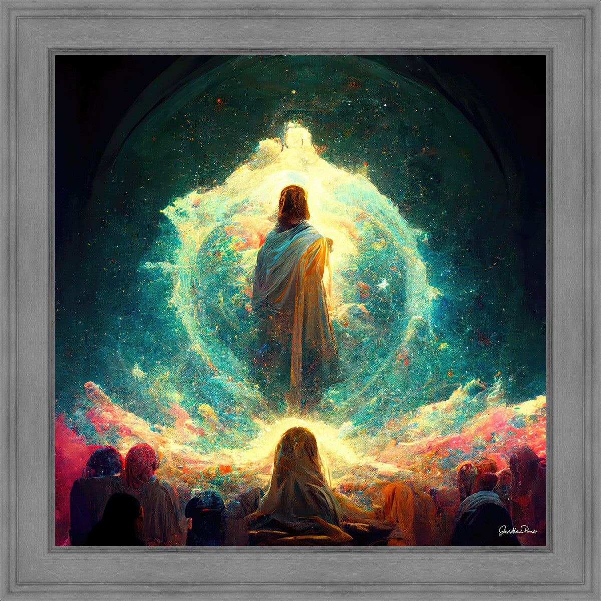 This piece depicts all of God’s children in the beginning witnessing the Savior create the universe and Earth, upon which we would live out our mortal lives.