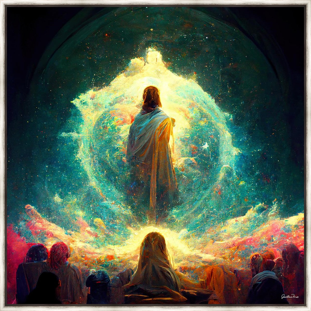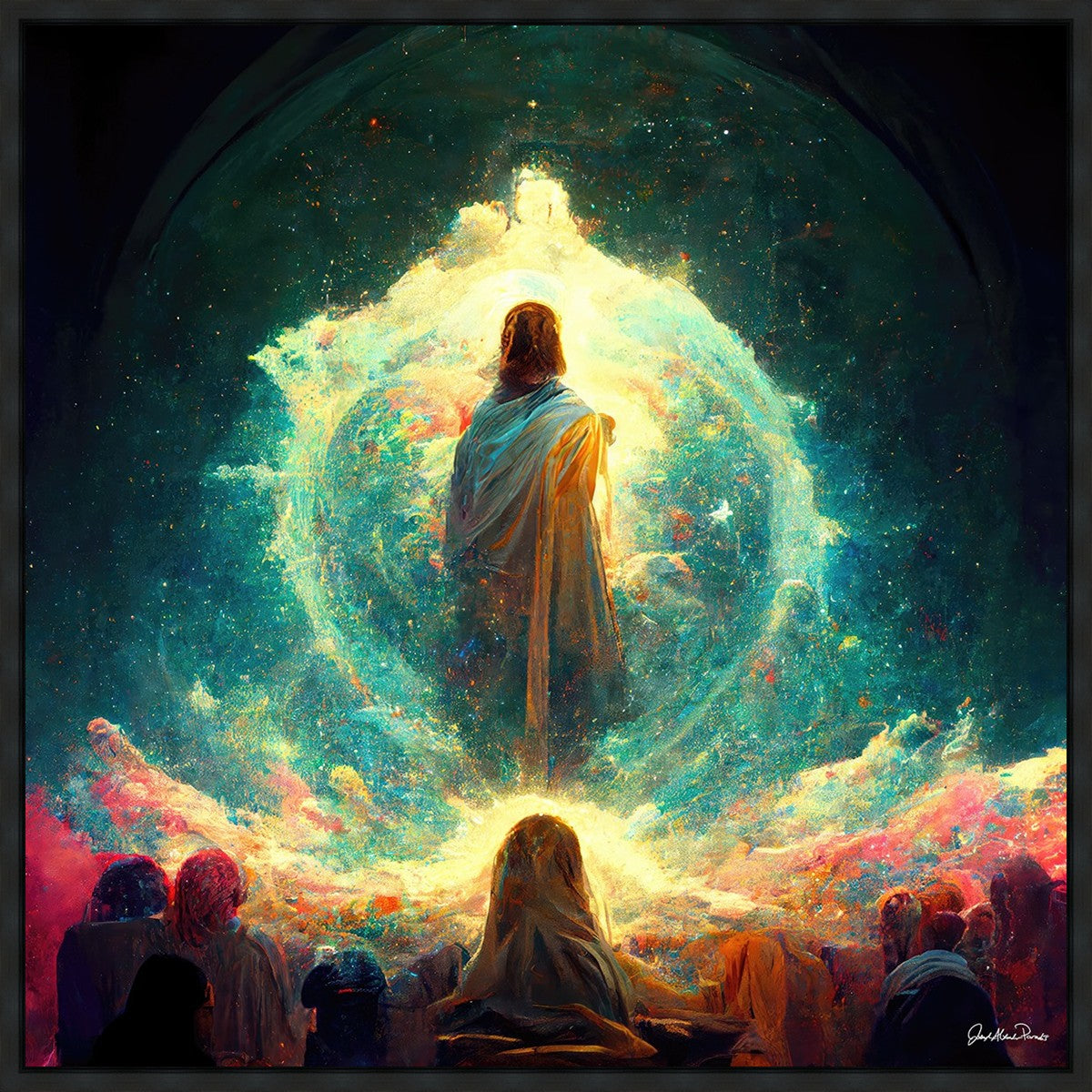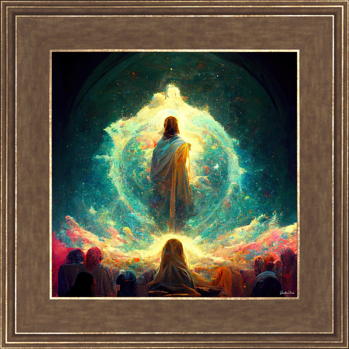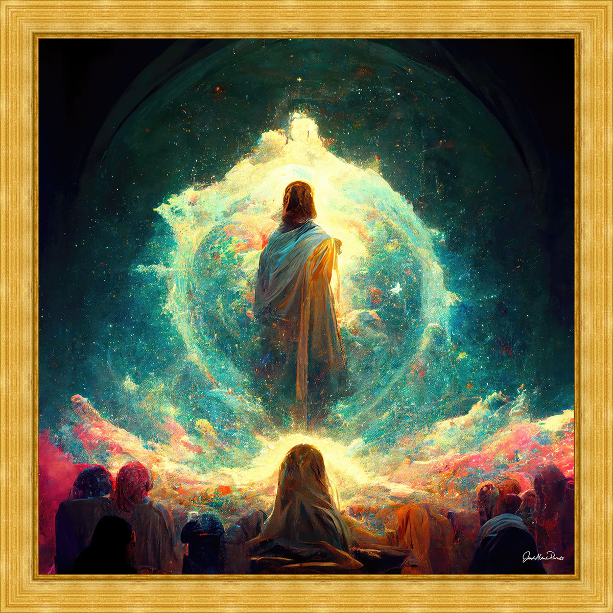 This piece depicts all of God’s children in the beginning witnessing the Savior create the universe and Earth, upon which we would live out our mortal lives.