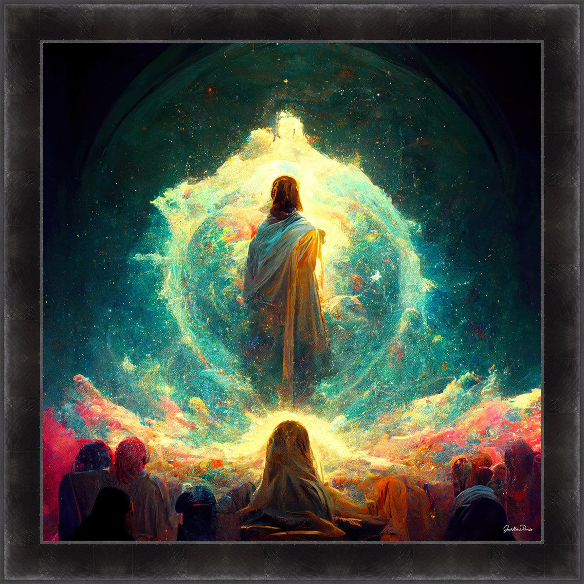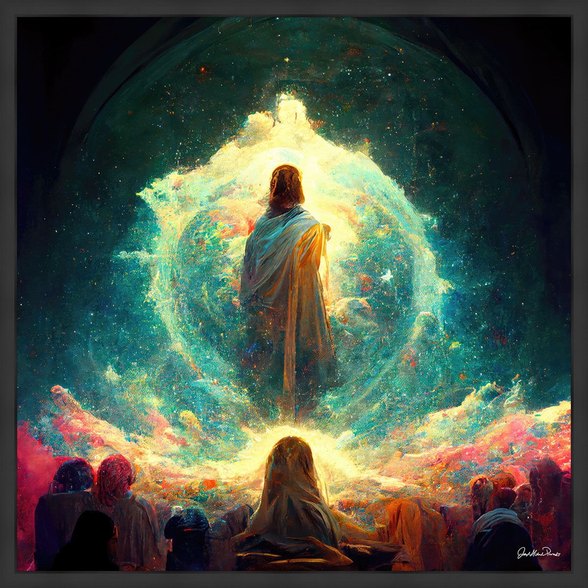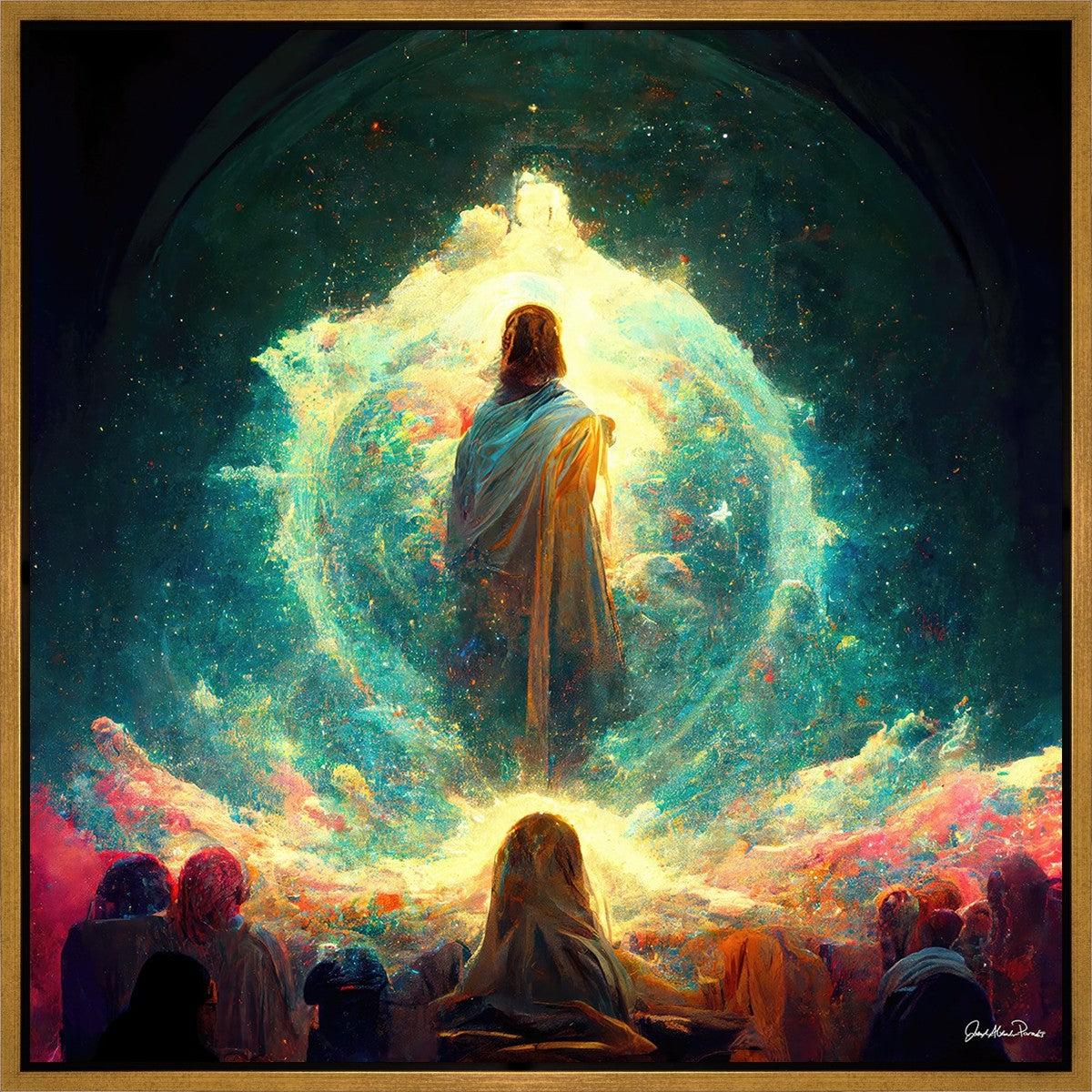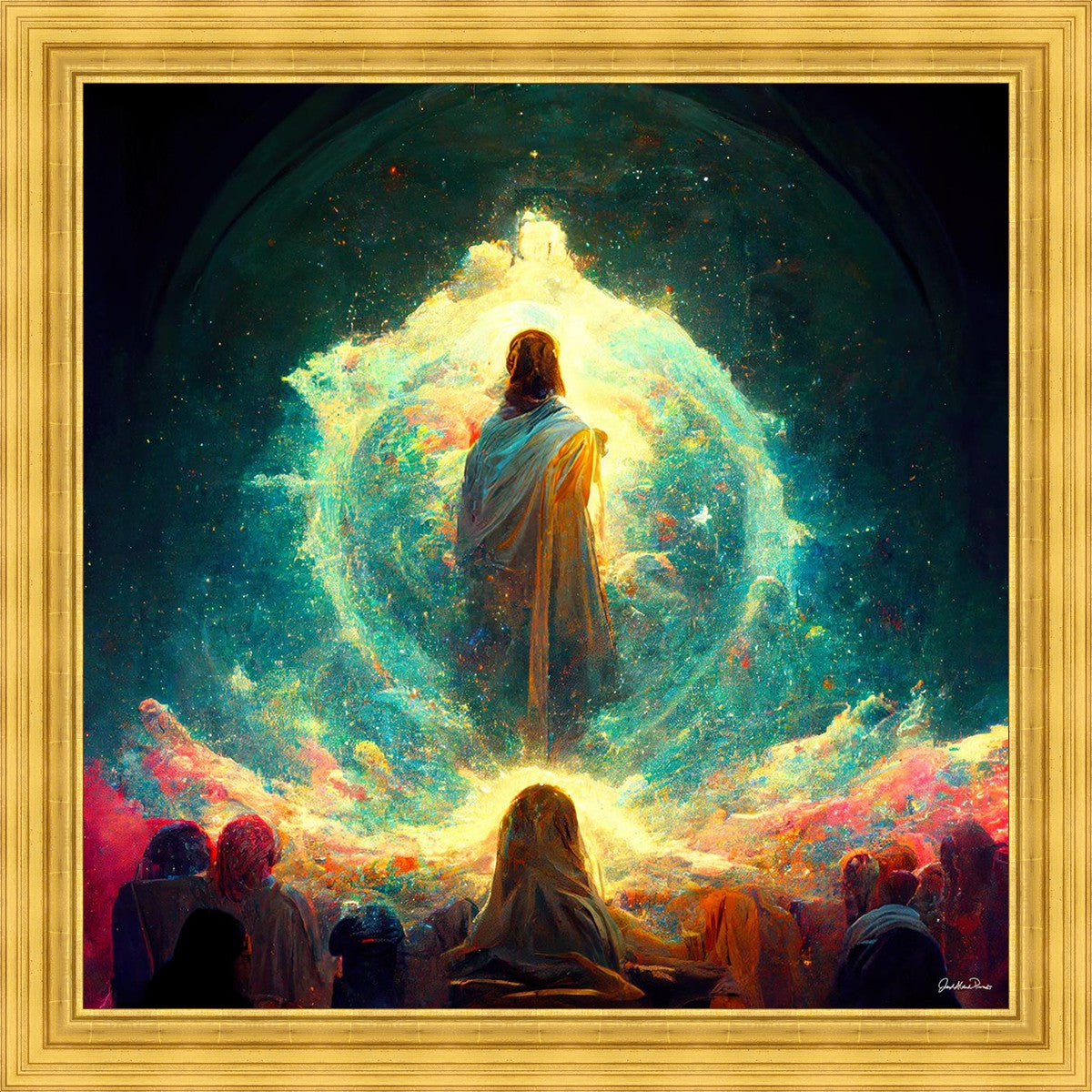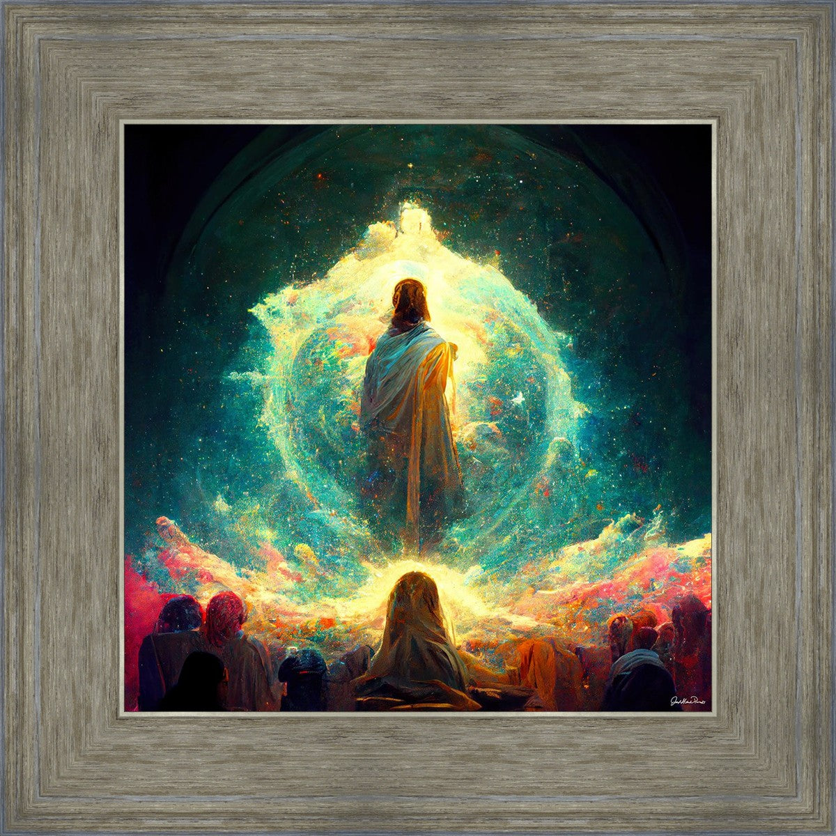 This piece depicts all of God’s children in the beginning witnessing the Savior create the universe and Earth, upon which we would live out our mortal lives.