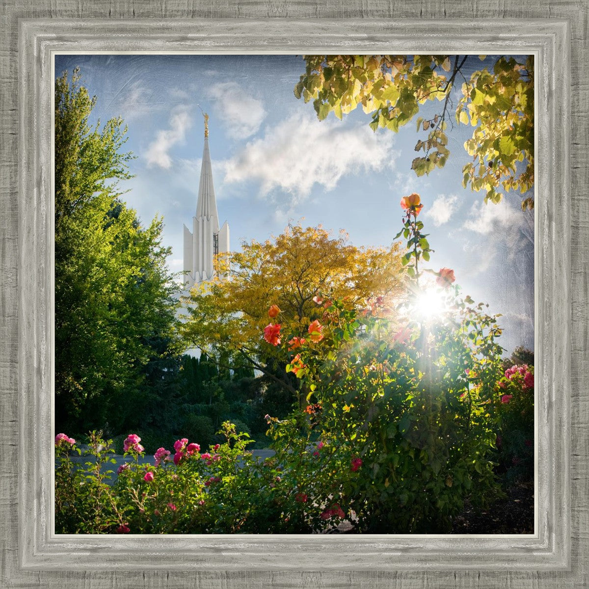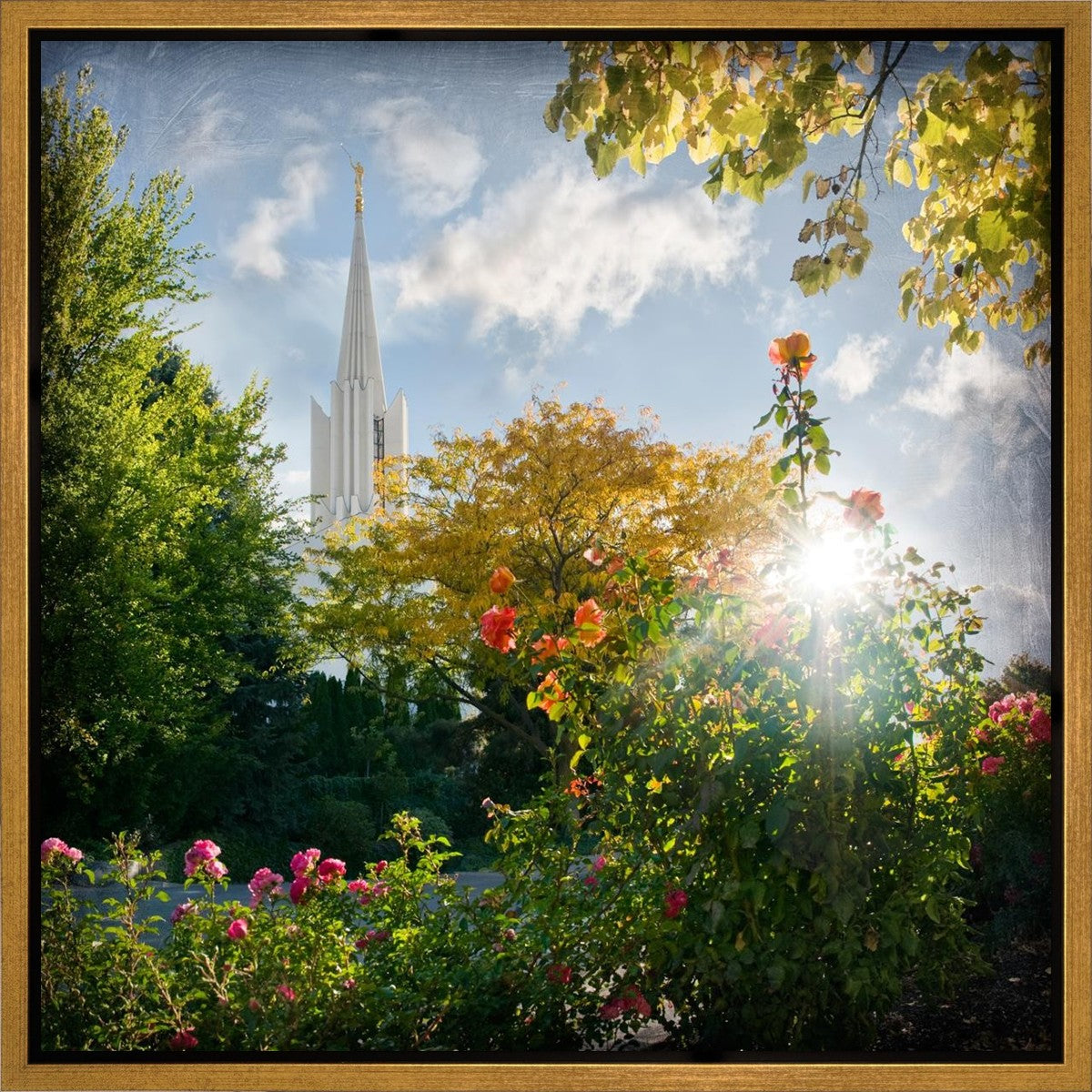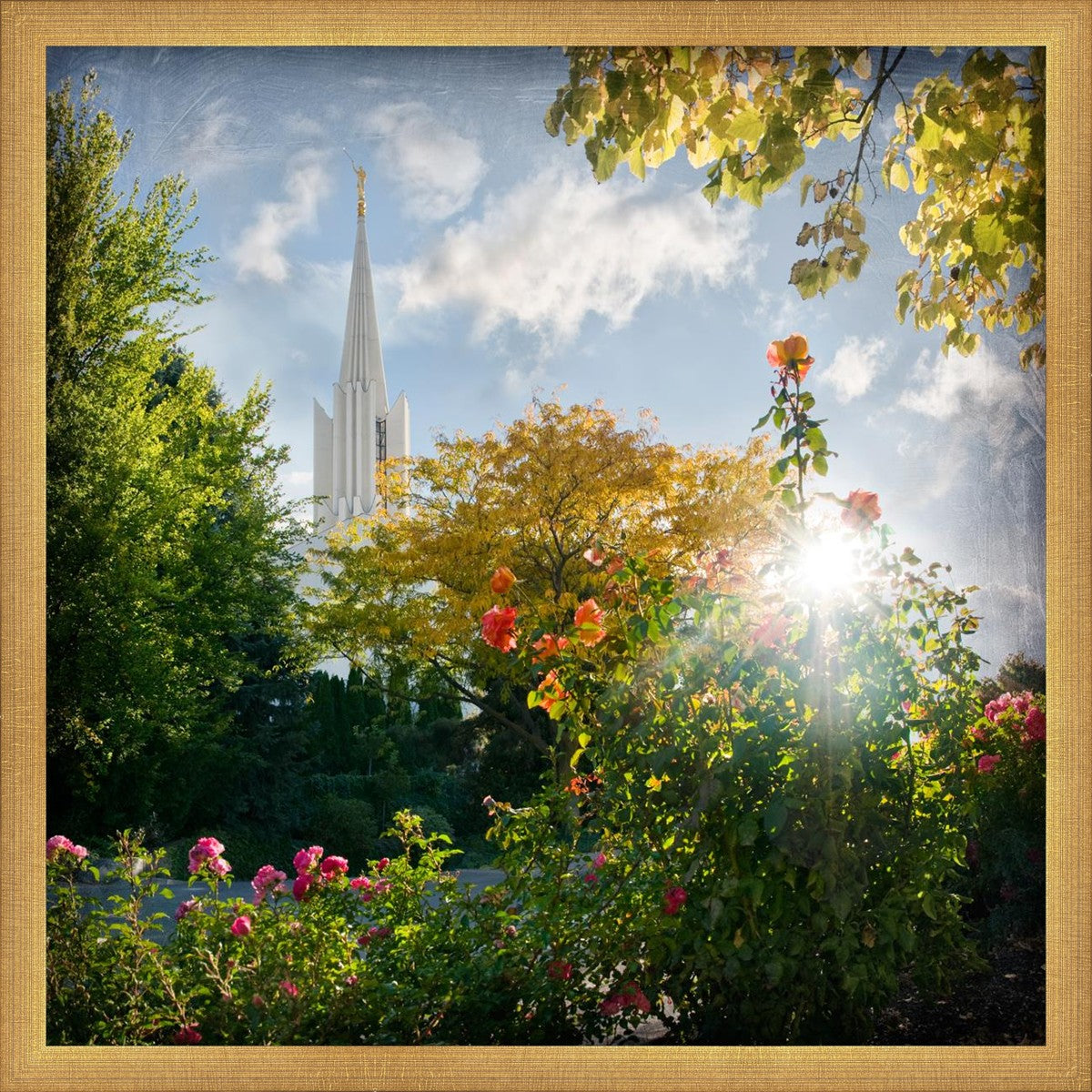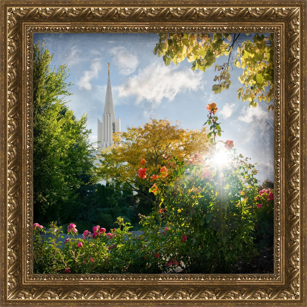 Since 1999 Landon has worked as an artisan in nearly 40 temples doing the decorative paint and gold leaf. He continues to do so as well as wood repair and graining. He was married in 2001 to Jacey Thomas in the Manti Utah temple. When she couldn’t find an image of the temple that she liked enough to purchase for their home, he decided to take one himself. That desire to create something original and different inspired his current series of temple art. They are taken from a panoramic viewpoint and stylized with an artistic border that reflect his paintings. All modern structures apart from the temple have been omitted.