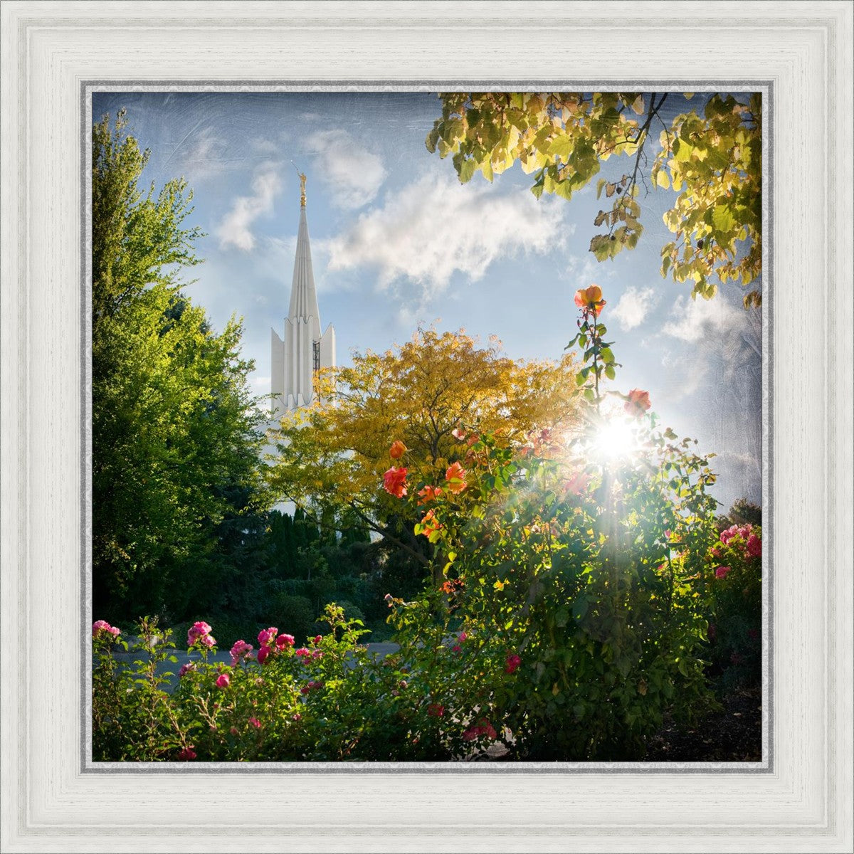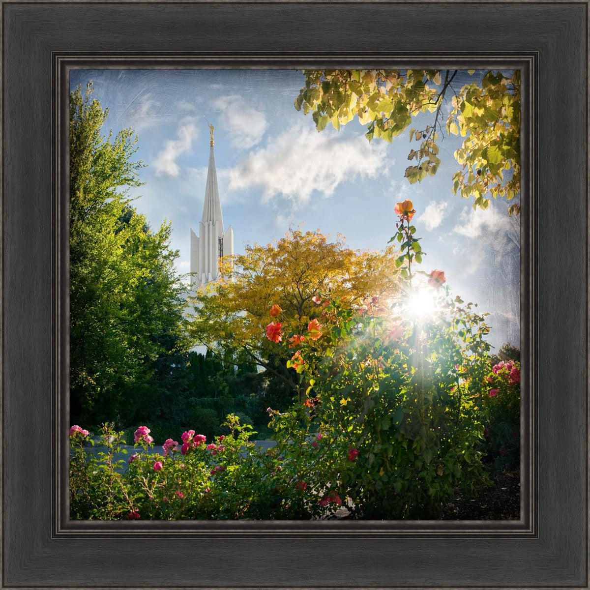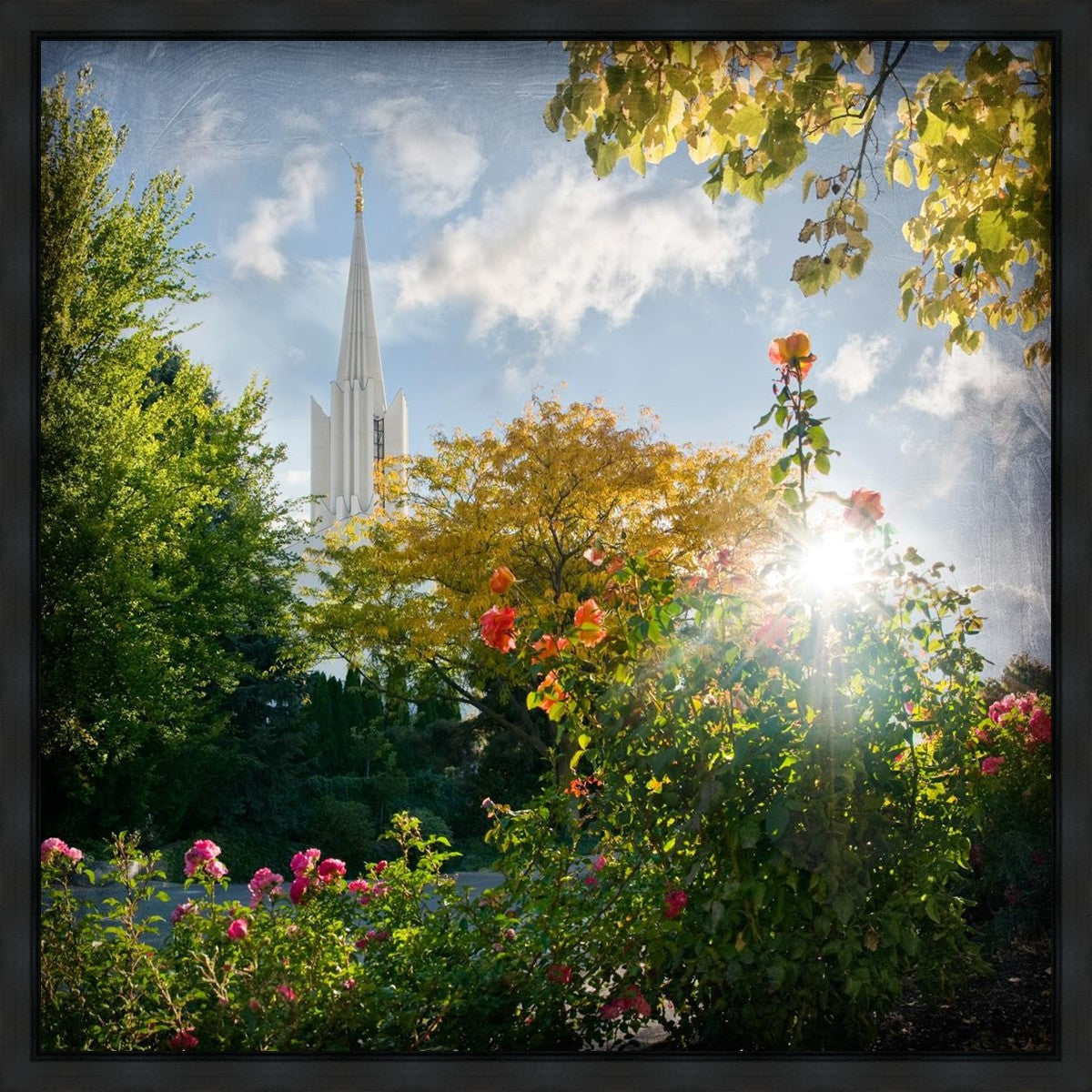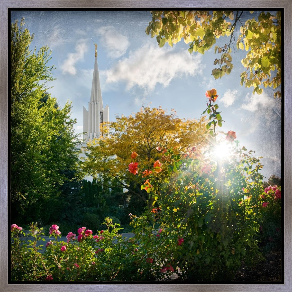 Since 1999 Landon has worked as an artisan in nearly 40 temples doing the decorative paint and gold leaf. He continues to do so as well as wood repair and graining. He was married in 2001 to Jacey Thomas in the Manti Utah temple. When she couldn’t find an image of the temple that she liked enough to purchase for their home, he decided to take one himself. That desire to create something original and different inspired his current series of temple art. They are taken from a panoramic viewpoint and stylized with an artistic border that reflect his paintings. All modern structures apart from the temple have been omitted.