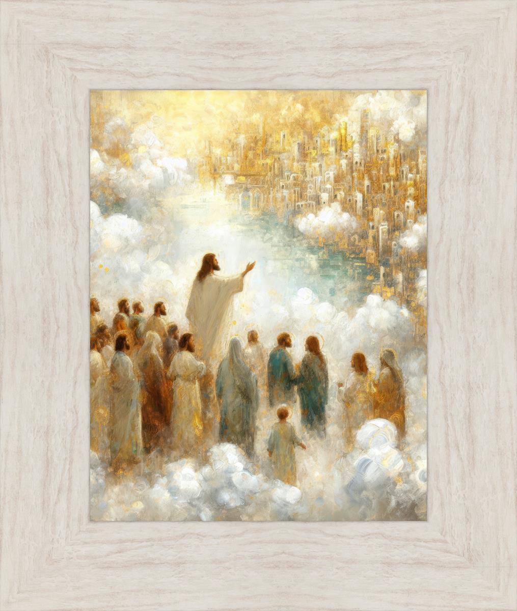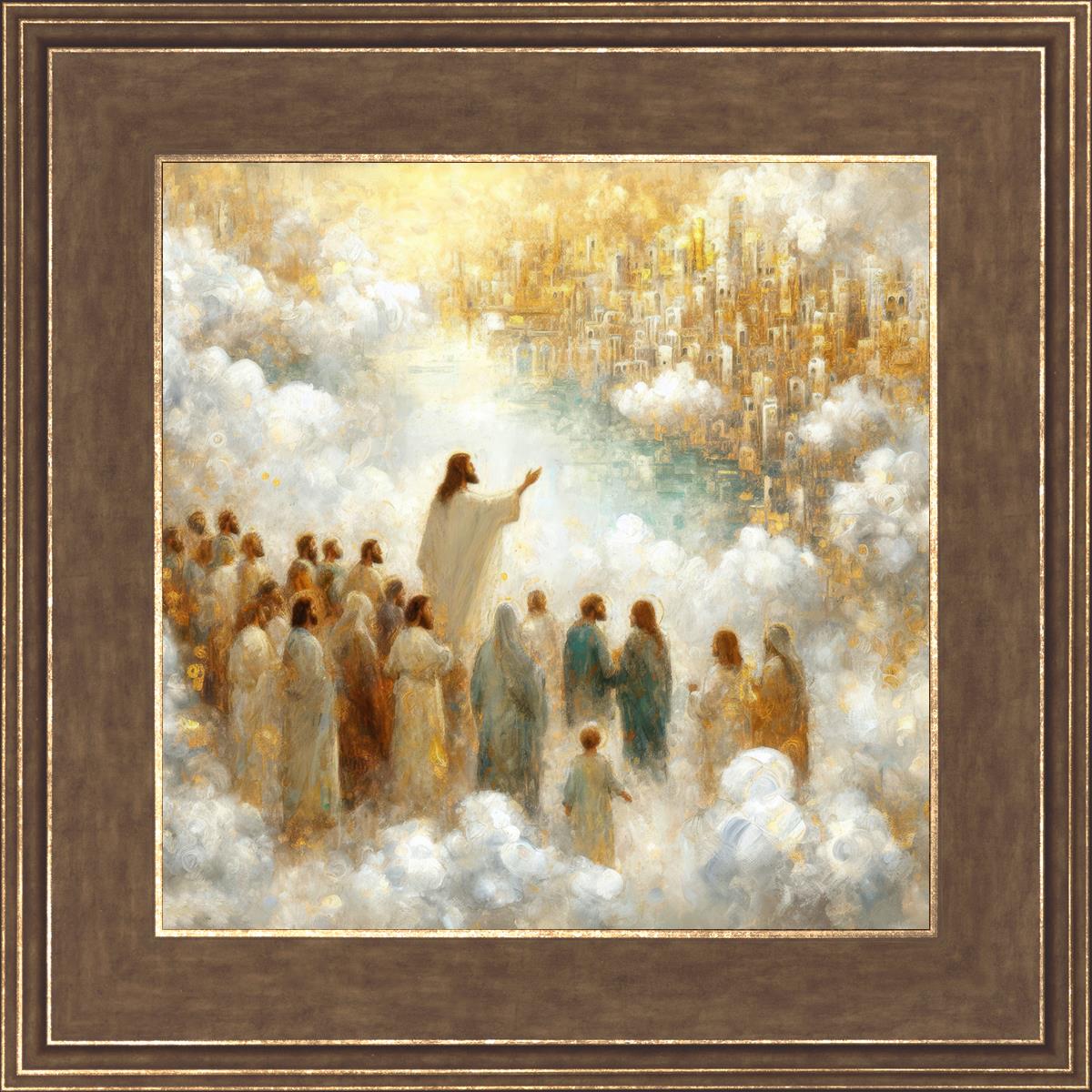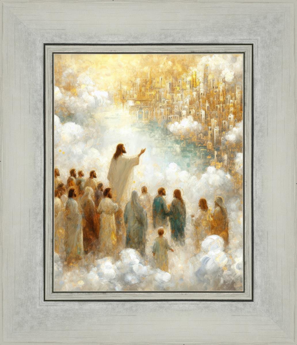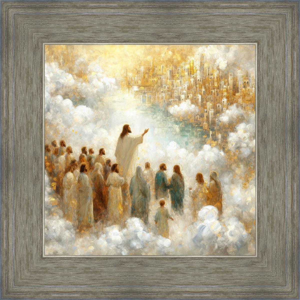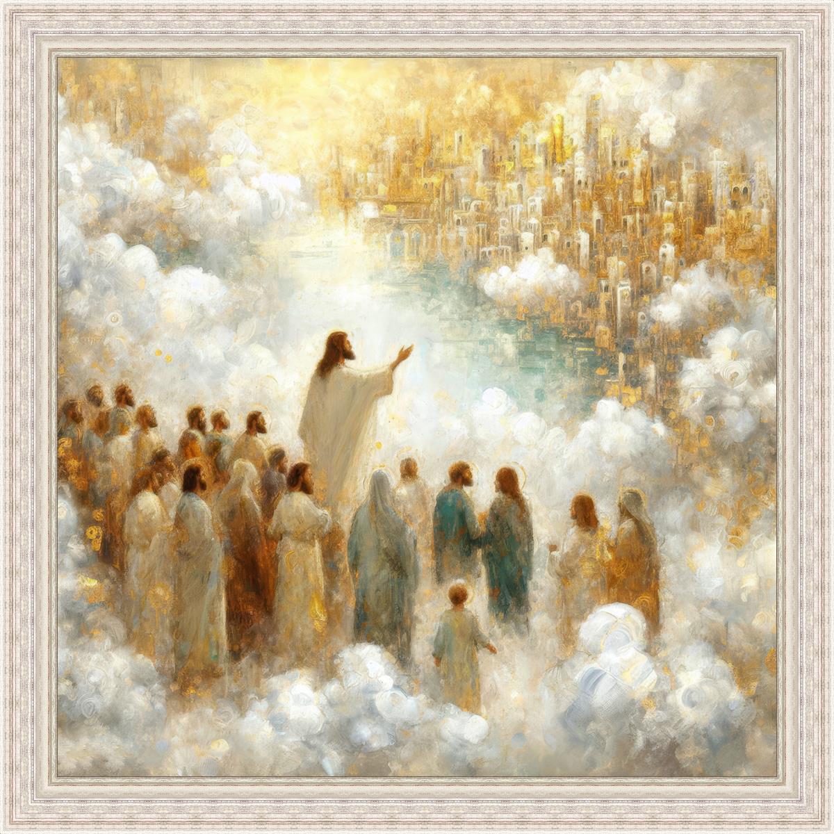 In creating “Kingdom Come”, we wanted to capture the deep longing in Jesus' prayer from the book of Matthew, "Your kingdom come, your will be done, on earth as it is in heaven." This scene shows Jesus surrounded by a crowd, all looking toward a radiant city in the distance - a vision of heaven breaking through to our world. For us, this piece reflects a hope for transformation: that our lives and communities could mirror the peace, love, and justice of God’s kingdom.