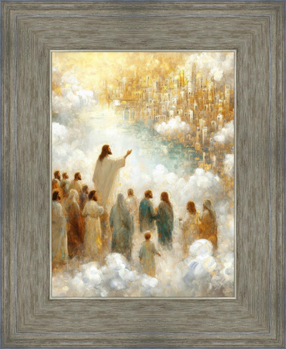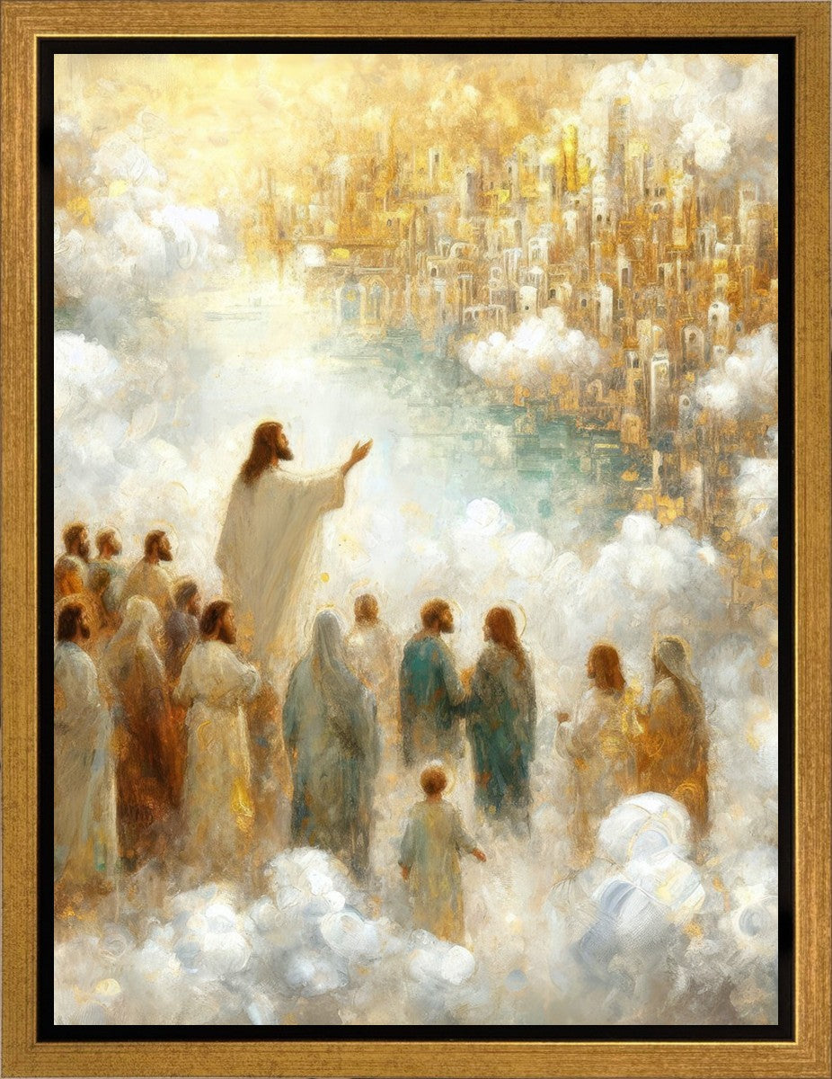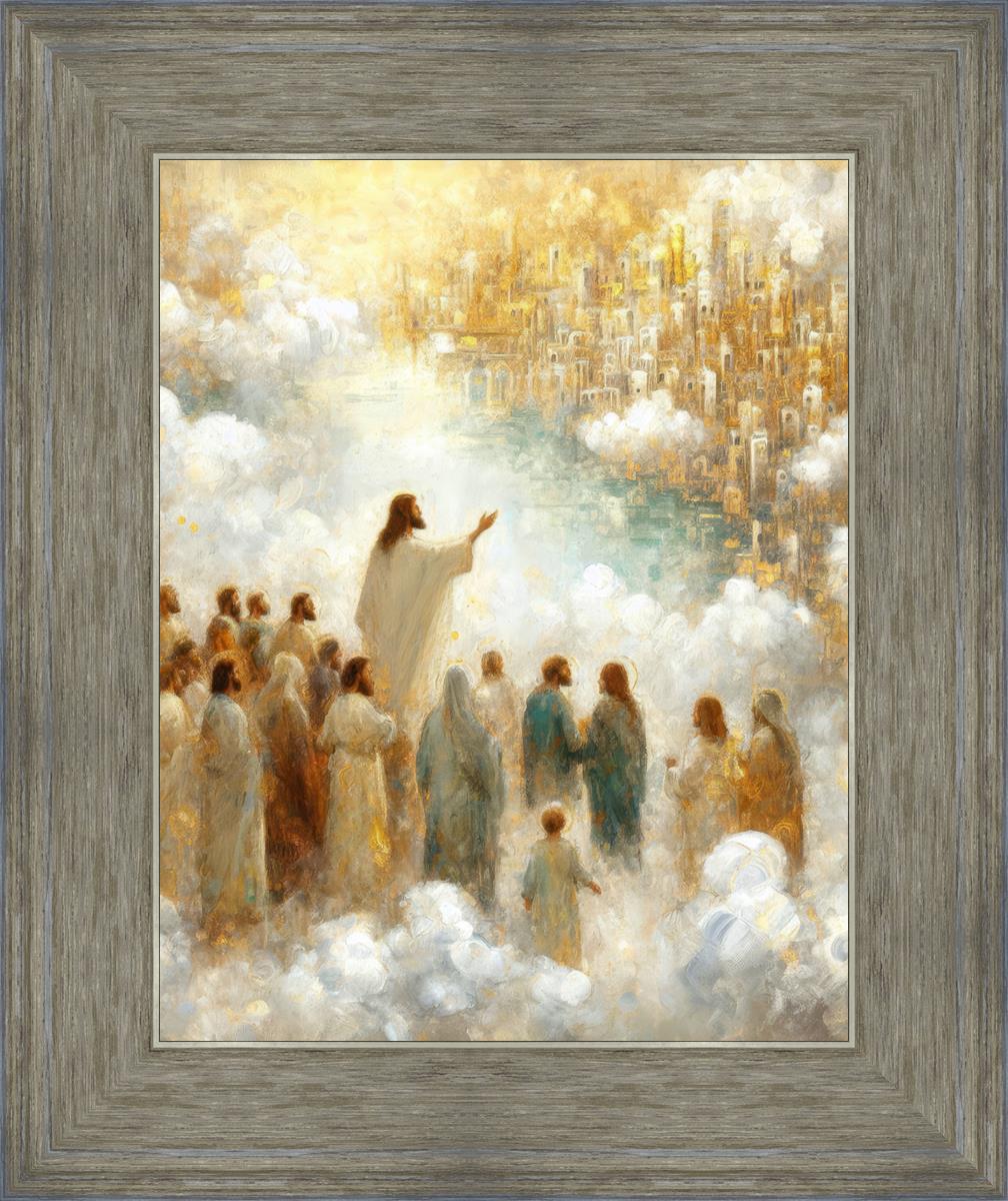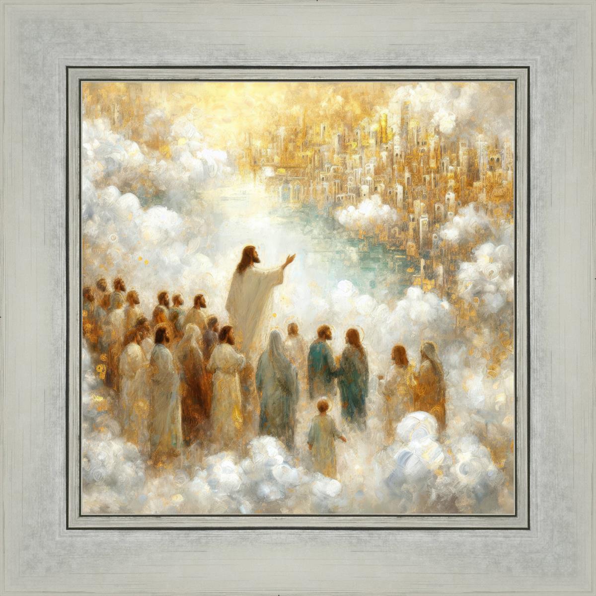 In creating “Kingdom Come”, we wanted to capture the deep longing in Jesus' prayer from the book of Matthew, "Your kingdom come, your will be done, on earth as it is in heaven." This scene shows Jesus surrounded by a crowd, all looking toward a radiant city in the distance - a vision of heaven breaking through to our world. For us, this piece reflects a hope for transformation: that our lives and communities could mirror the peace, love, and justice of God’s kingdom.