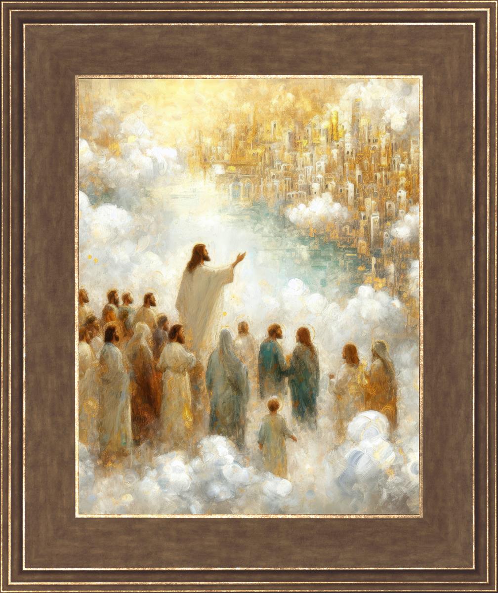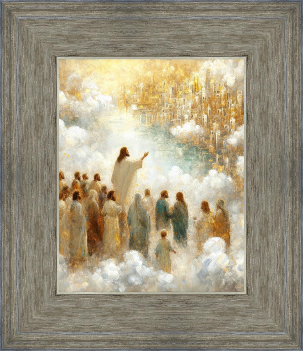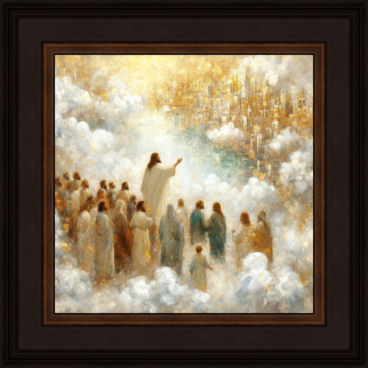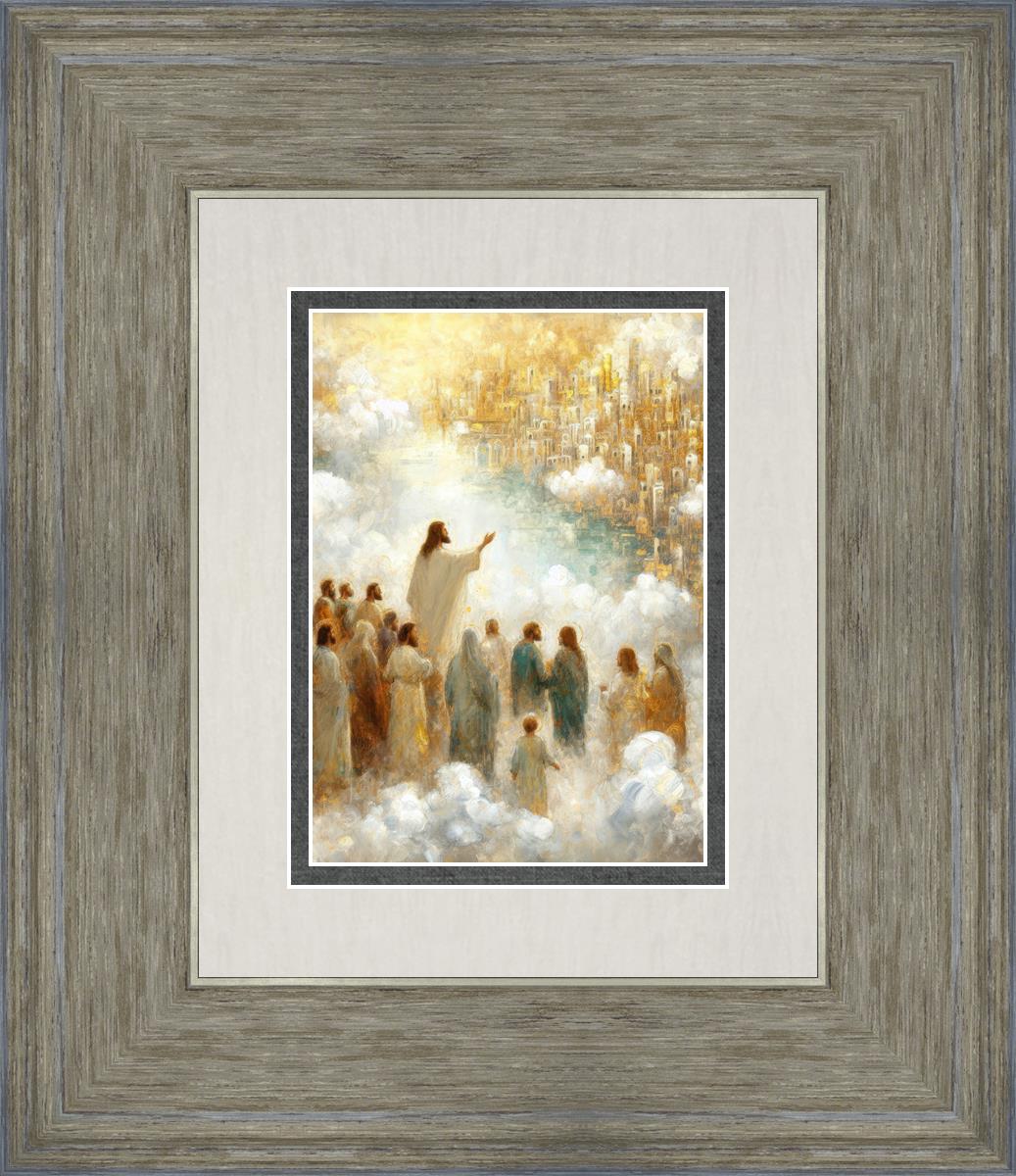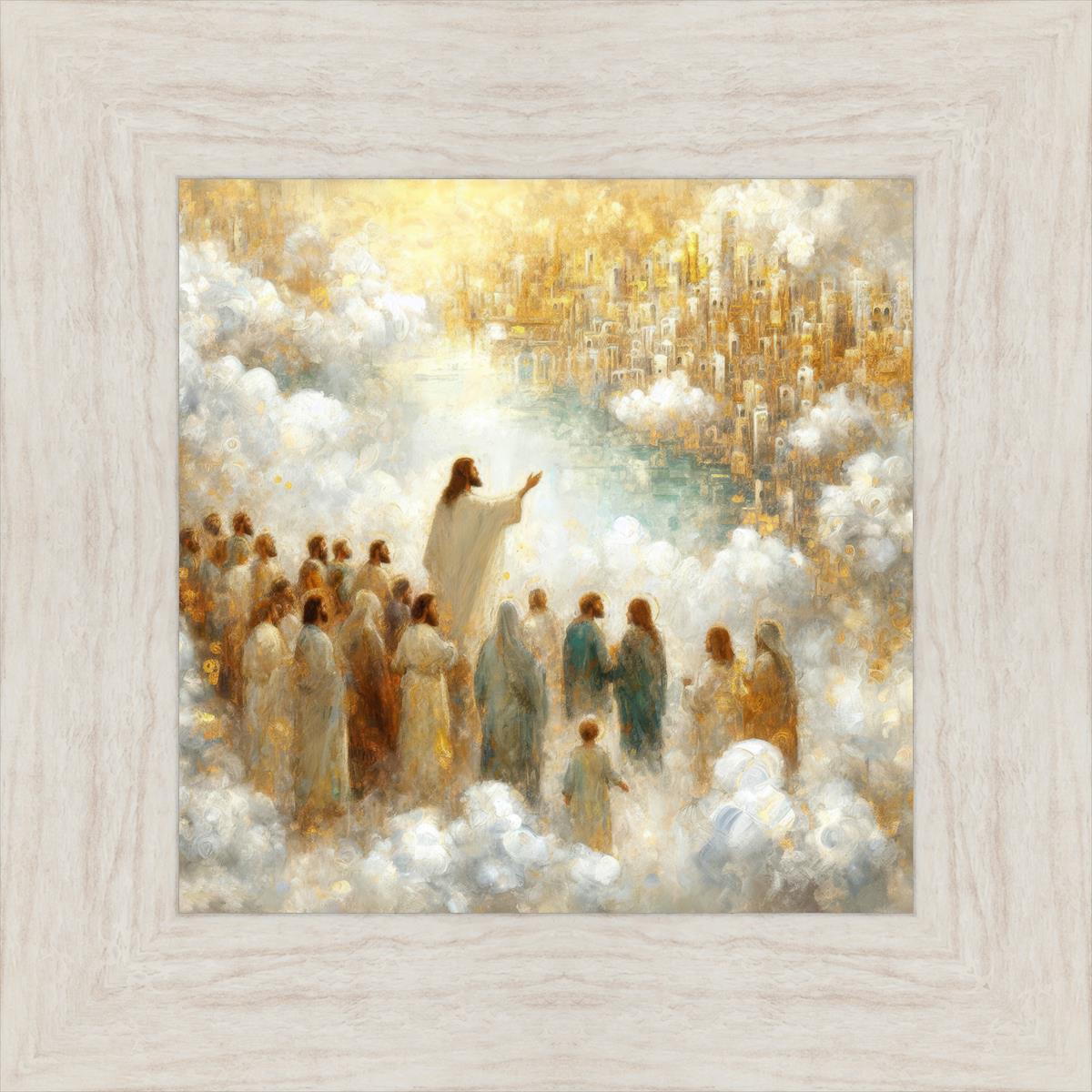In creating “Kingdom Come”, we wanted to capture the deep longing in Jesus' prayer from the book of Matthew, "Your kingdom come, your will be done, on earth as it is in heaven." This scene shows Jesus surrounded by a crowd, all looking toward a radiant city in the distance - a vision of heaven breaking through to our world. For us, this piece reflects a hope for transformation: that our lives and communities could mirror the peace, love, and justice of God’s kingdom.