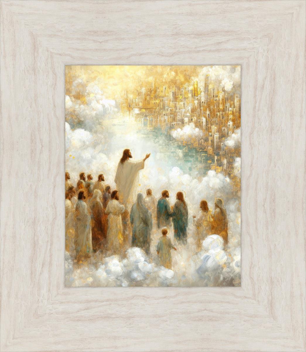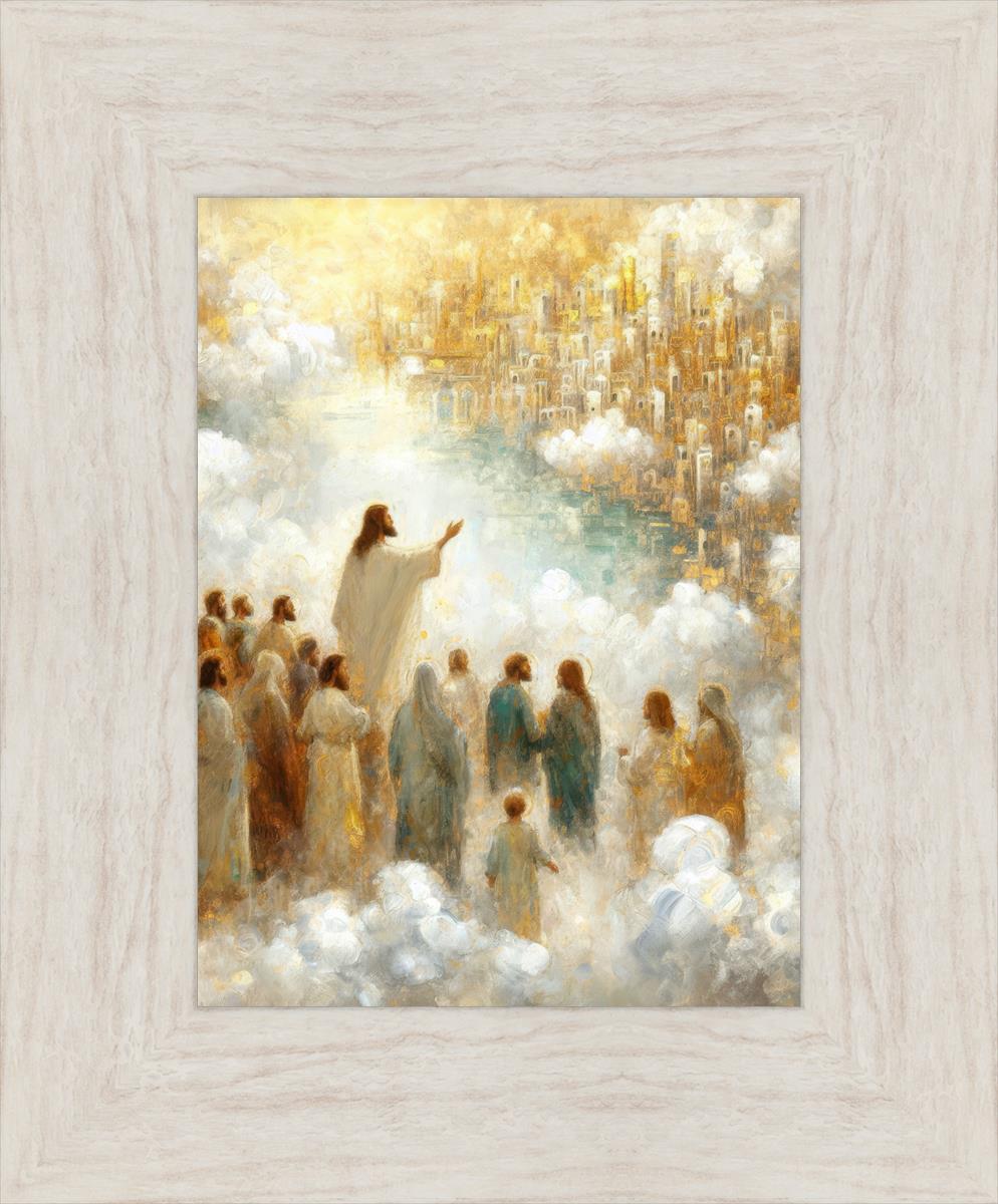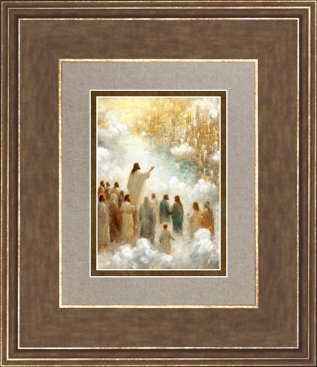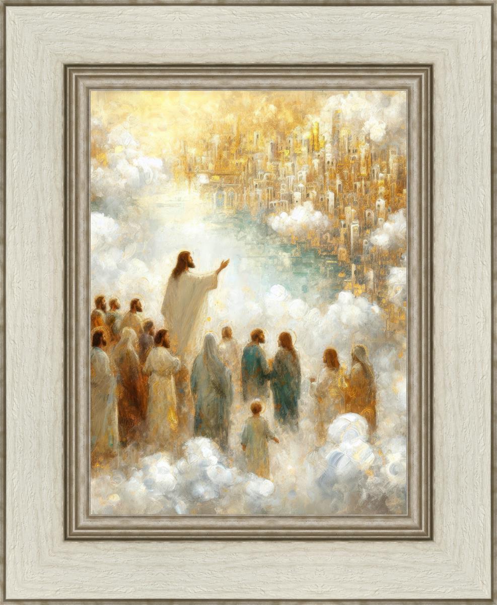 In creating “Kingdom Come”, we wanted to capture the deep longing in Jesus' prayer from the book of Matthew, "Your kingdom come, your will be done, on earth as it is in heaven." This scene shows Jesus surrounded by a crowd, all looking toward a radiant city in the distance - a vision of heaven breaking through to our world. For us, this piece reflects a hope for transformation: that our lives and communities could mirror the peace, love, and justice of God’s kingdom.