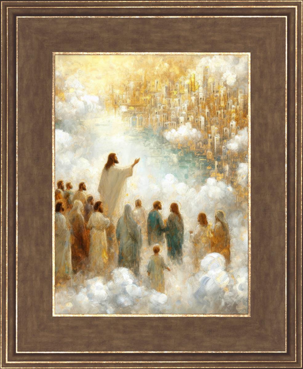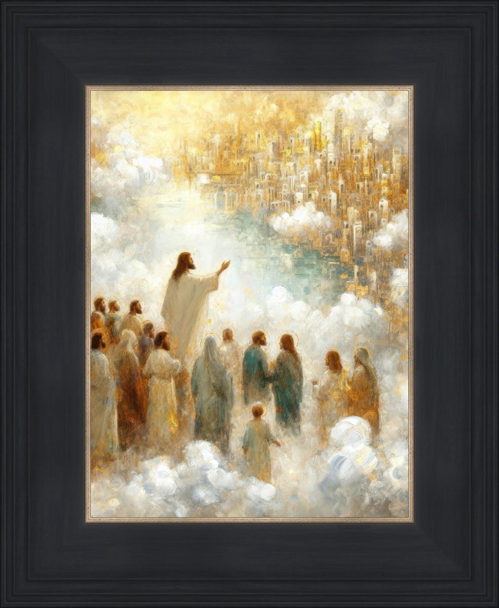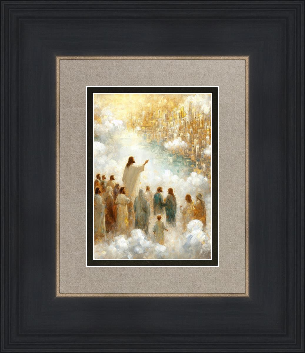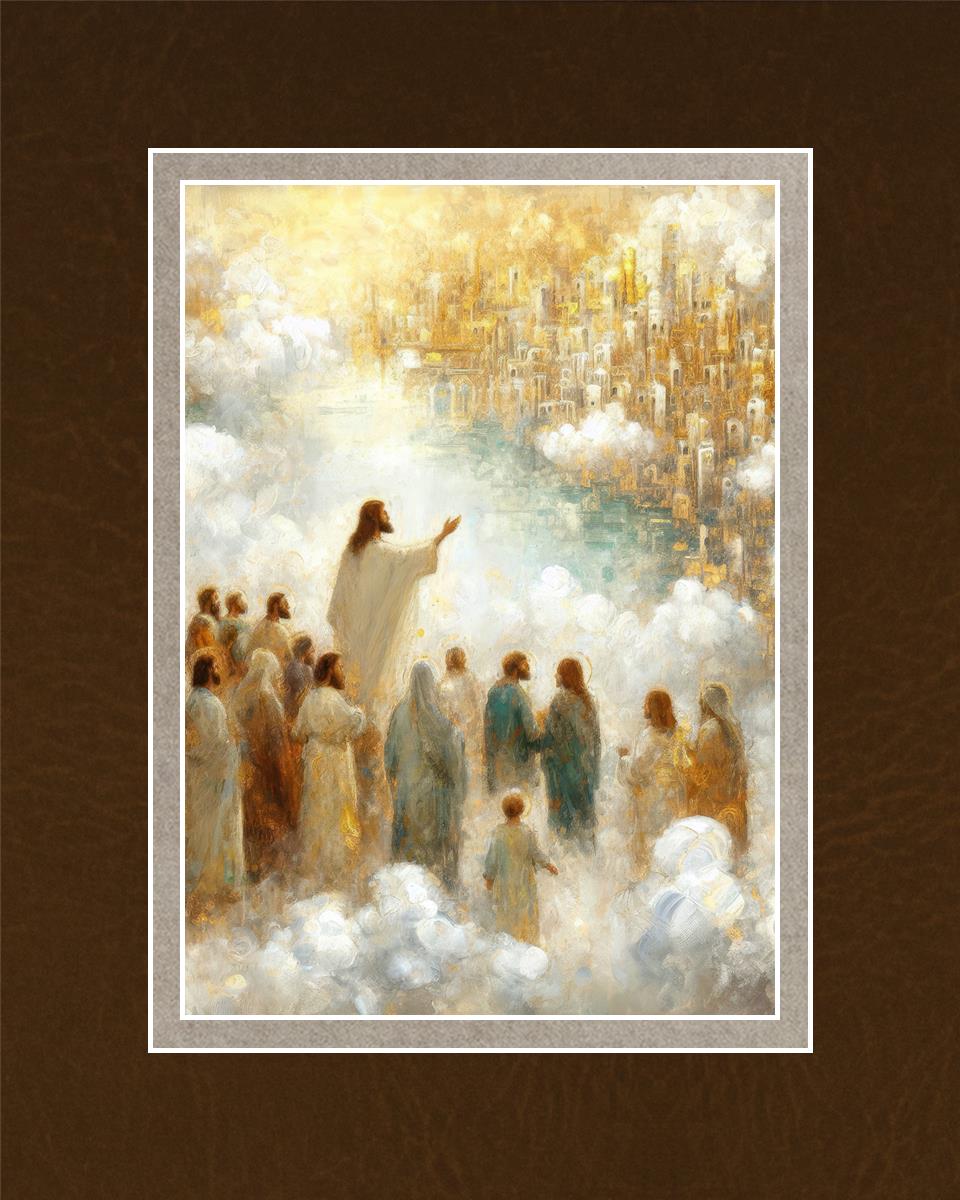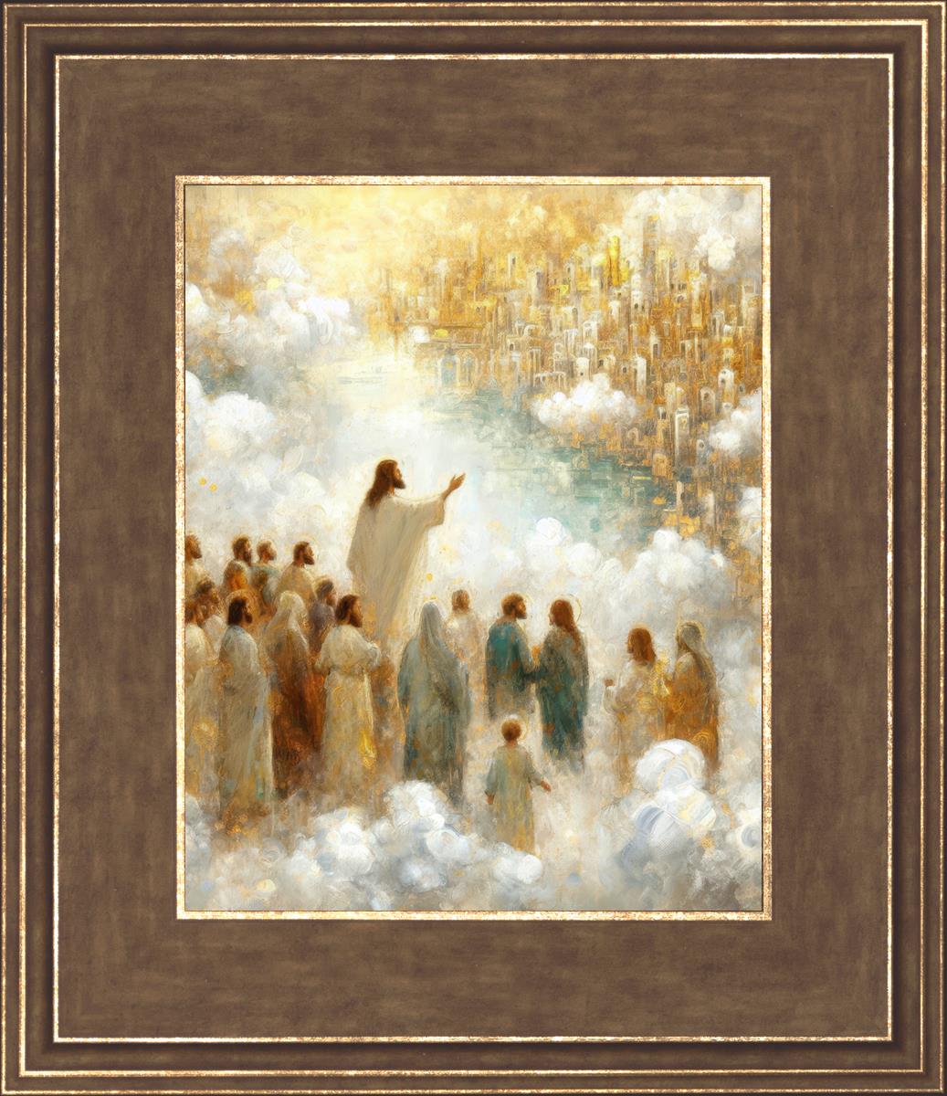 In creating “Kingdom Come”, we wanted to capture the deep longing in Jesus' prayer from the book of Matthew, "Your kingdom come, your will be done, on earth as it is in heaven." This scene shows Jesus surrounded by a crowd, all looking toward a radiant city in the distance - a vision of heaven breaking through to our world. For us, this piece reflects a hope for transformation: that our lives and communities could mirror the peace, love, and justice of God’s kingdom.