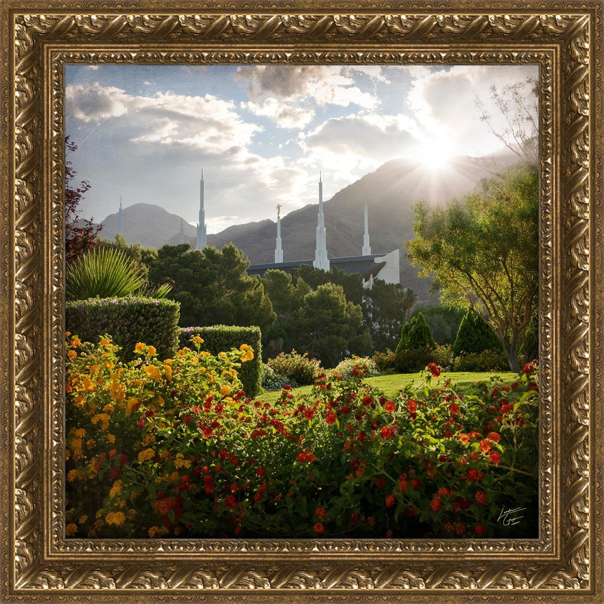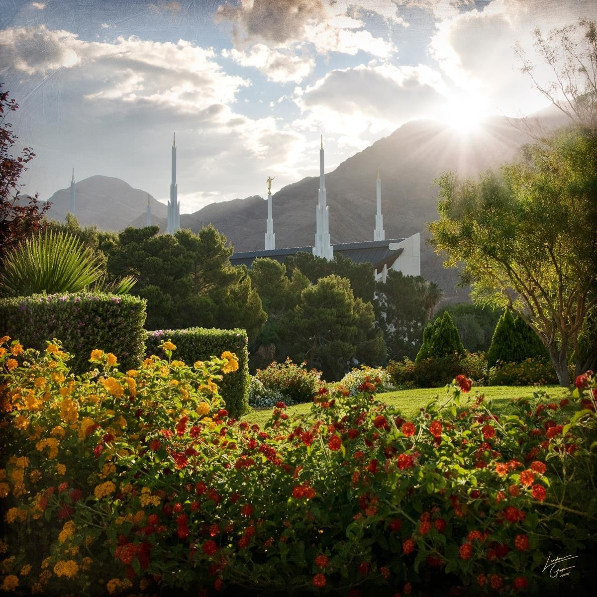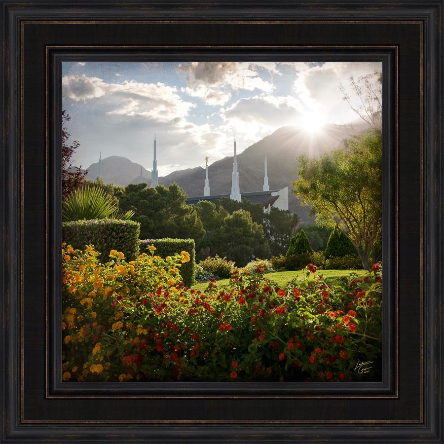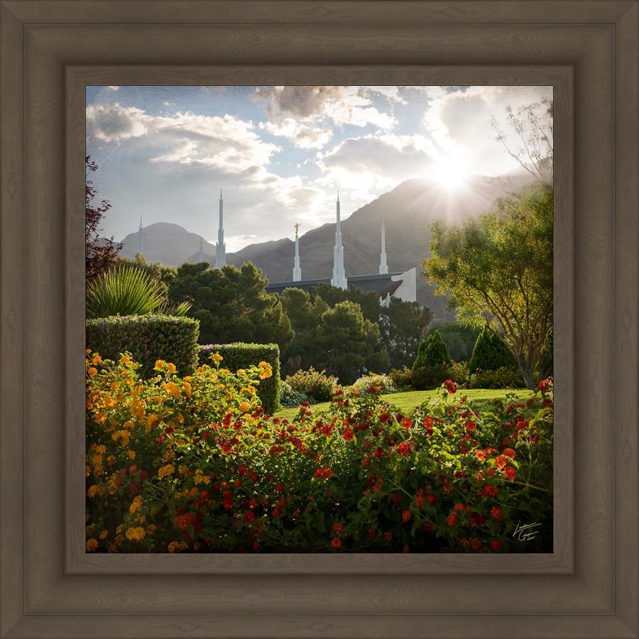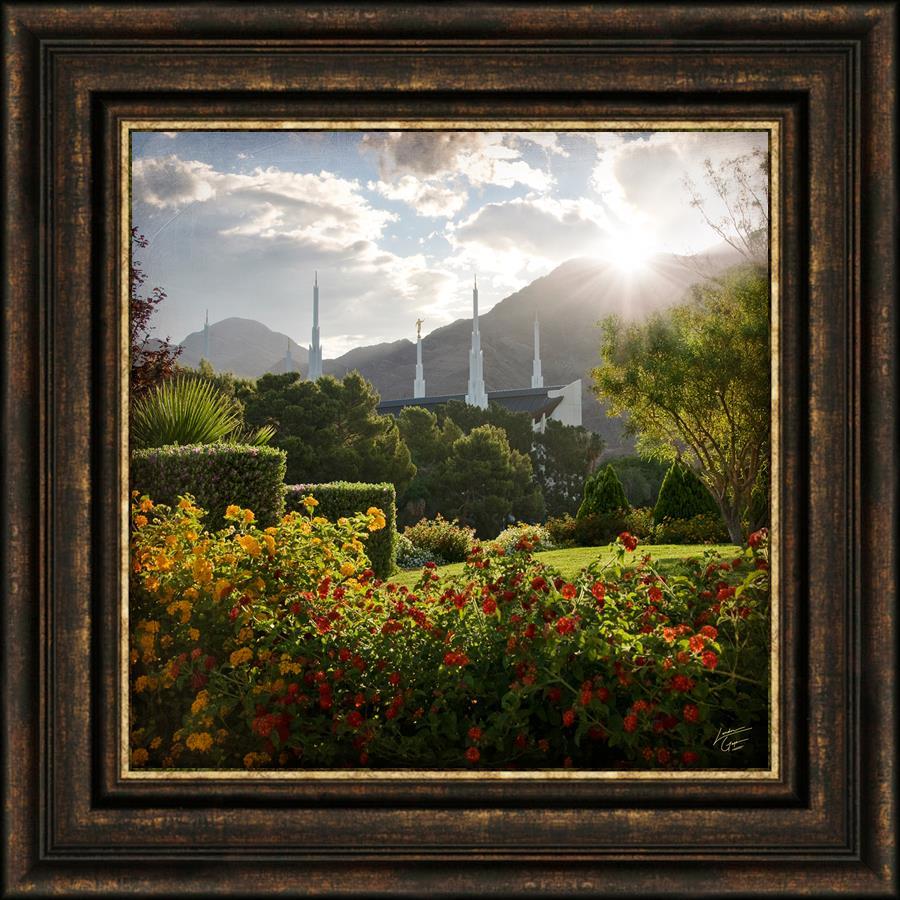 Since 1999 Landon has worked as an artisan in nearly 40 temples doing the decorative paint and gold leaf. He continues to do so as well as wood repair and graining. He was married in 2001 to Jacey Thomas in the Manti Utah temple. When she couldn’t find an image of the temple that she liked enough to purchase for their home, he decided to take one himself. That desire to create something original and different inspired his current series of temple art. They are taken from a panoramic viewpoint and stylized with an artistic border that reflect his paintings. All modern structures apart from the temple have been omitted.