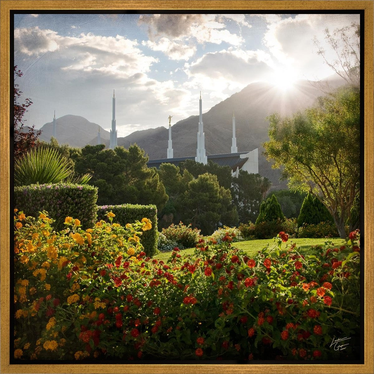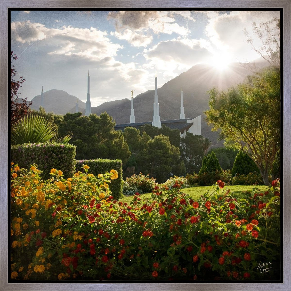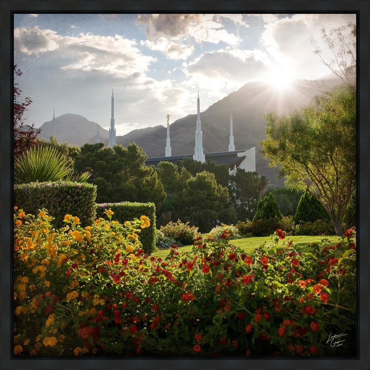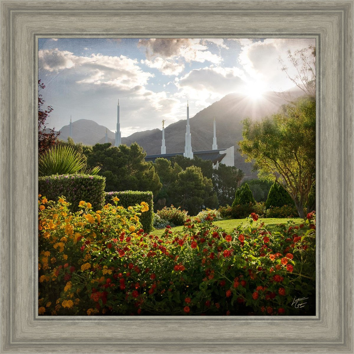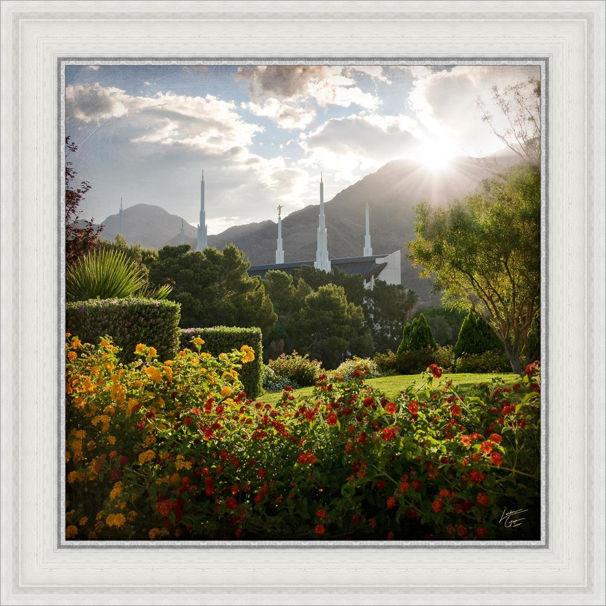Since 1999 Landon has worked as an artisan in nearly 40 temples doing the decorative paint and gold leaf. He continues to do so as well as wood repair and graining. He was married in 2001 to Jacey Thomas in the Manti Utah temple. When she couldn’t find an image of the temple that she liked enough to purchase for their home, he decided to take one himself. That desire to create something original and different inspired his current series of temple art. They are taken from a panoramic viewpoint and stylized with an artistic border that reflect his paintings. All modern structures apart from the temple have been omitted.