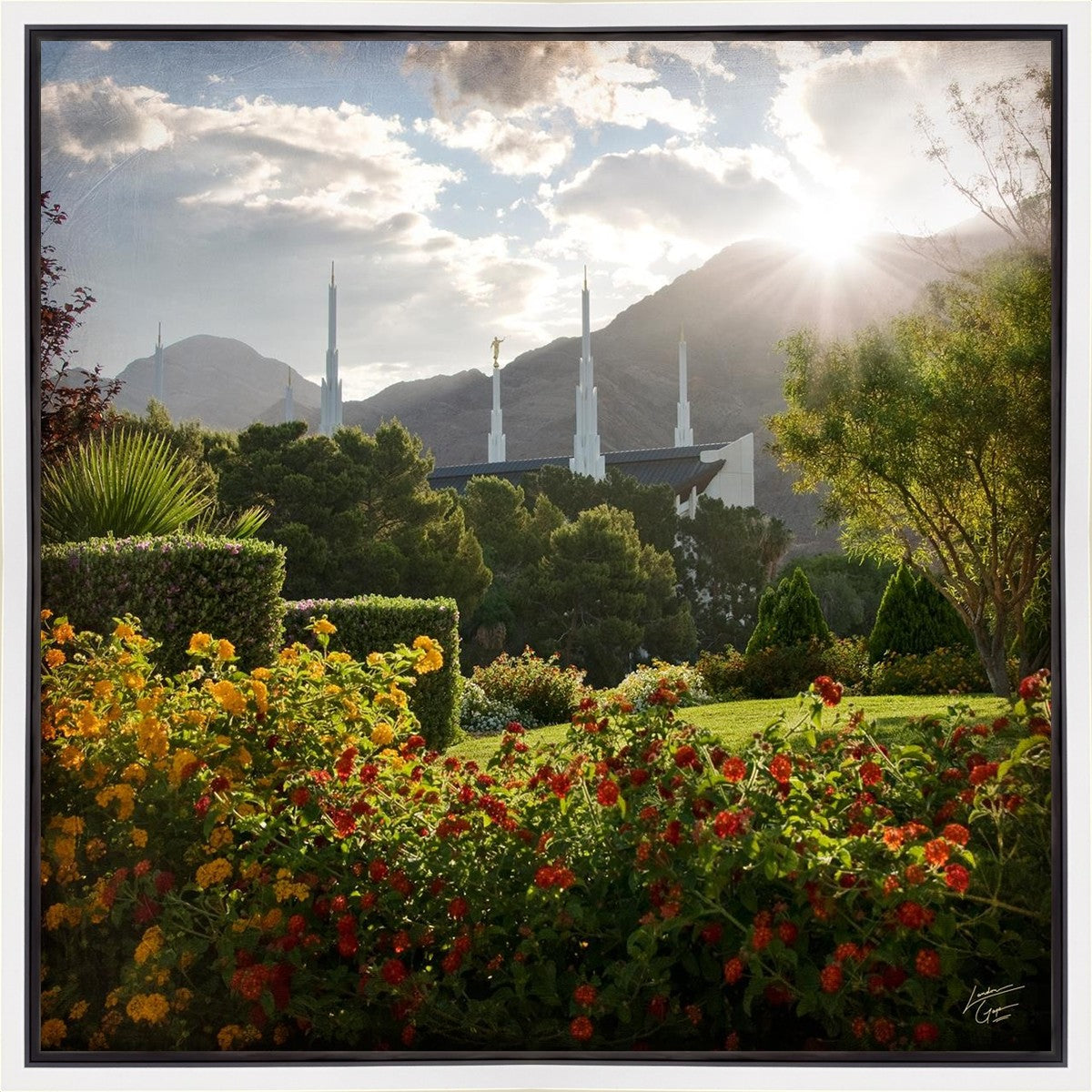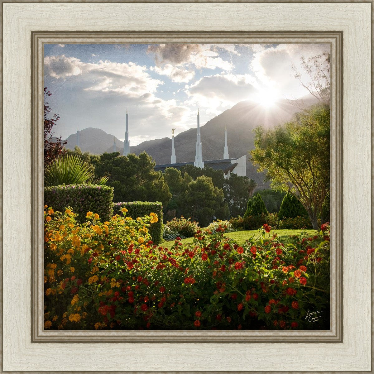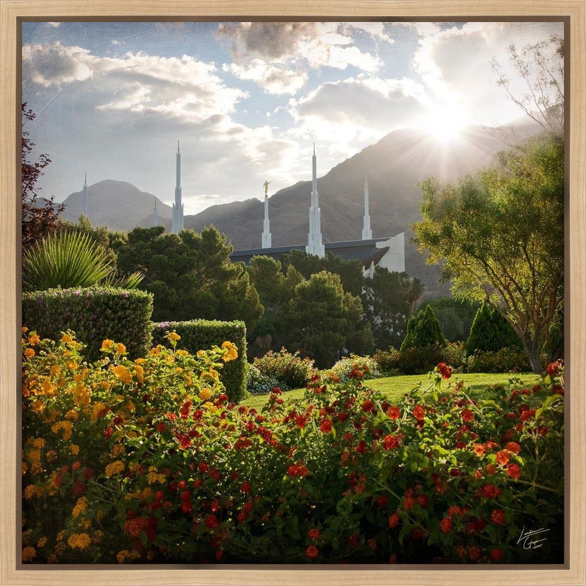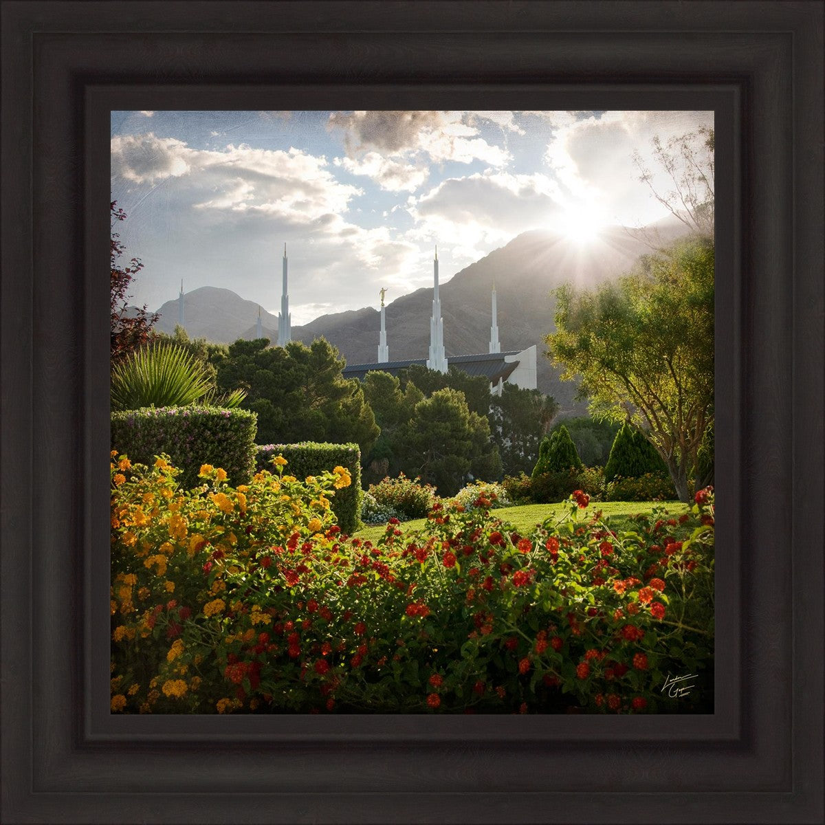 Since 1999 Landon has worked as an artisan in nearly 40 temples doing the decorative paint and gold leaf. He continues to do so as well as wood repair and graining. He was married in 2001 to Jacey Thomas in the Manti Utah temple. When she couldn’t find an image of the temple that she liked enough to purchase for their home, he decided to take one himself. That desire to create something original and different inspired his current series of temple art. They are taken from a panoramic viewpoint and stylized with an artistic border that reflect his paintings. All modern structures apart from the temple have been omitted.