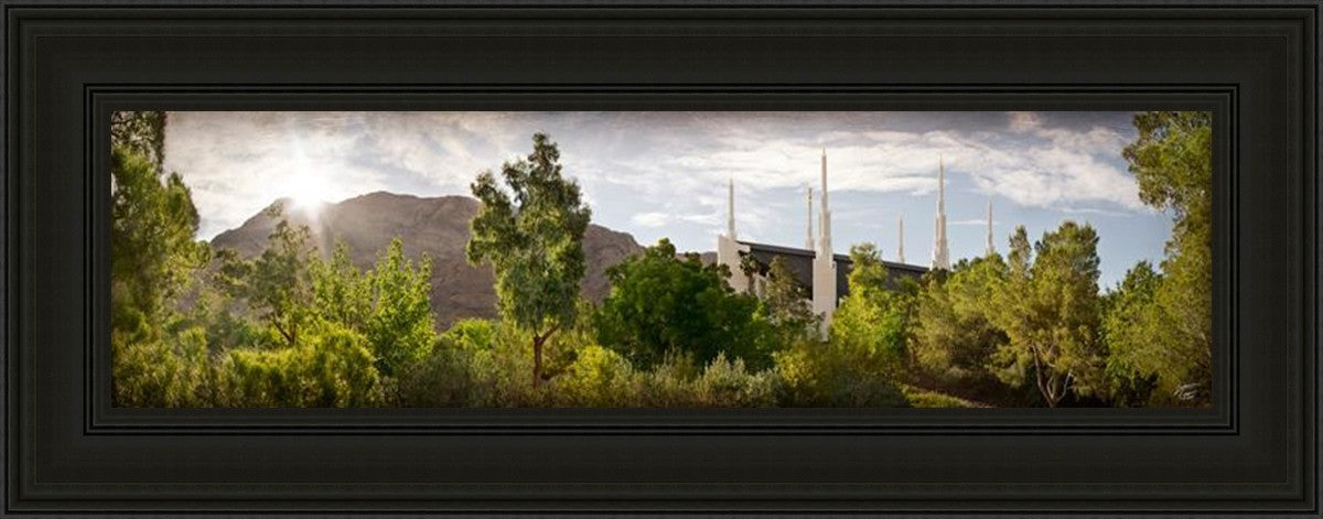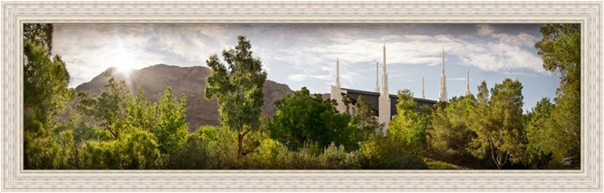 Since 1999 Landon has worked as an artisan in nearly 40 temples doing the decorative paint and gold leaf. He continues to do so as well as wood repair and graining. He was married in 2001 to Jacey Thomas in the Manti Utah temple. When she couldn’t find an image of the temple that she liked enough to purchase for their home, he decided to take one himself. That desire to create something original and different inspired his current series of temple art. They are taken from a panoramic viewpoint and stylized with an artistic border that reflect his paintings. All modern structures apart from the temple have been omitted.