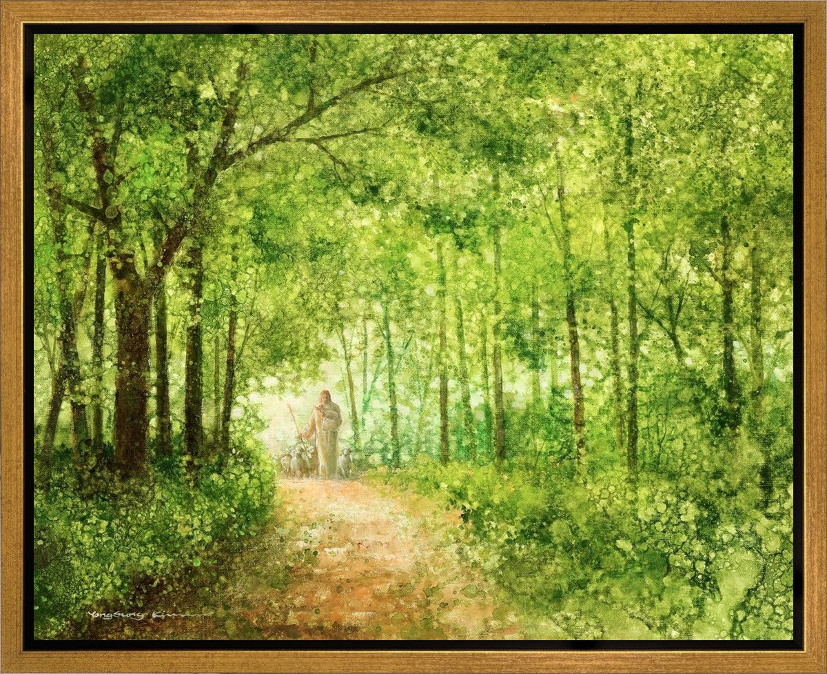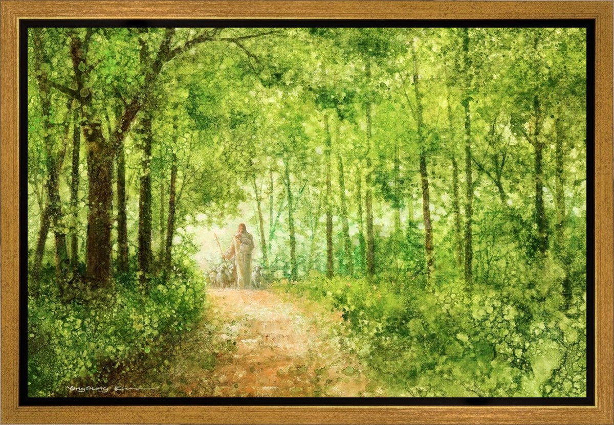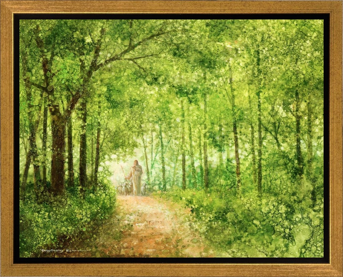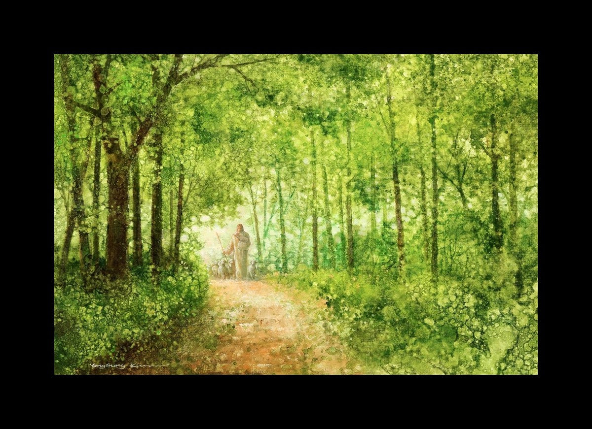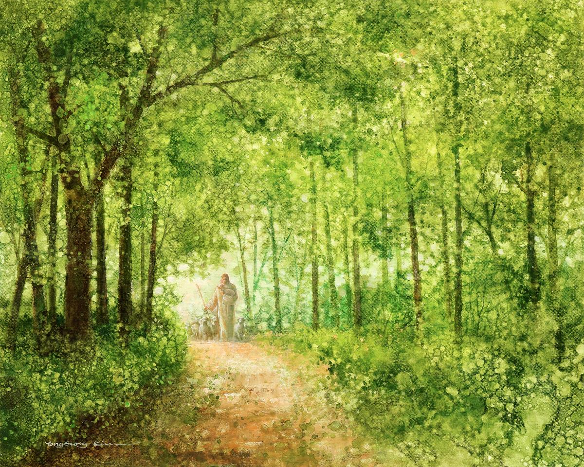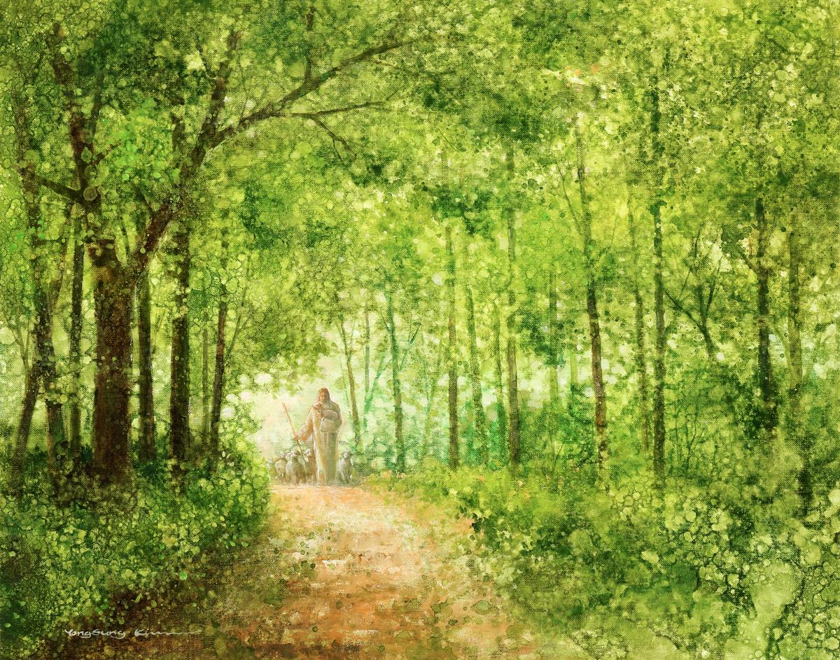 "Lead Thou Me On" by Yongsung Kim depicts Jesus Christ tenderly holding a lamb, leading a flock of sheep along a tree-lined path.