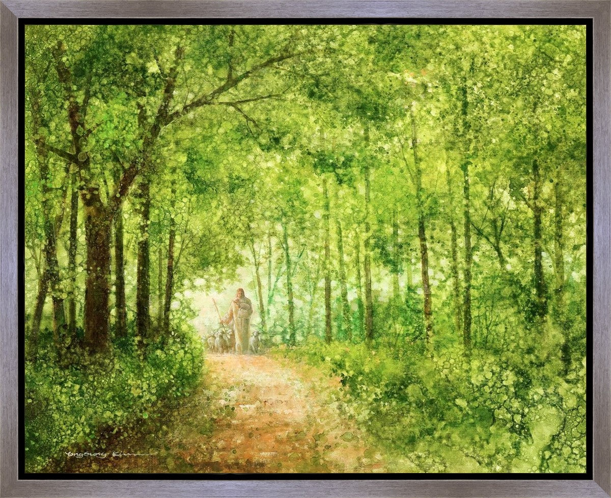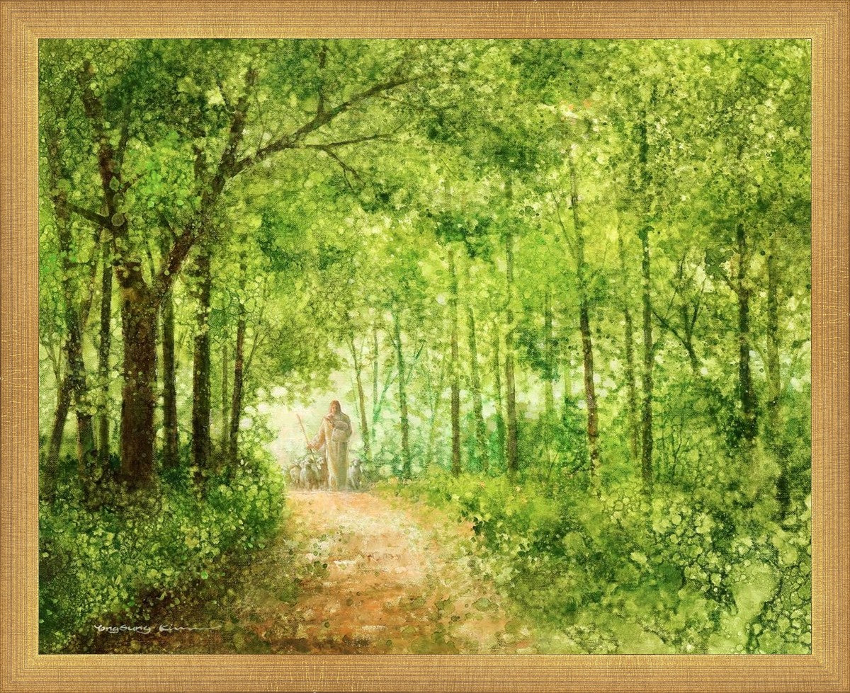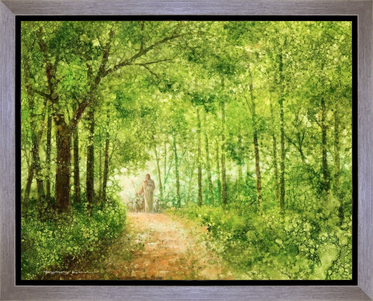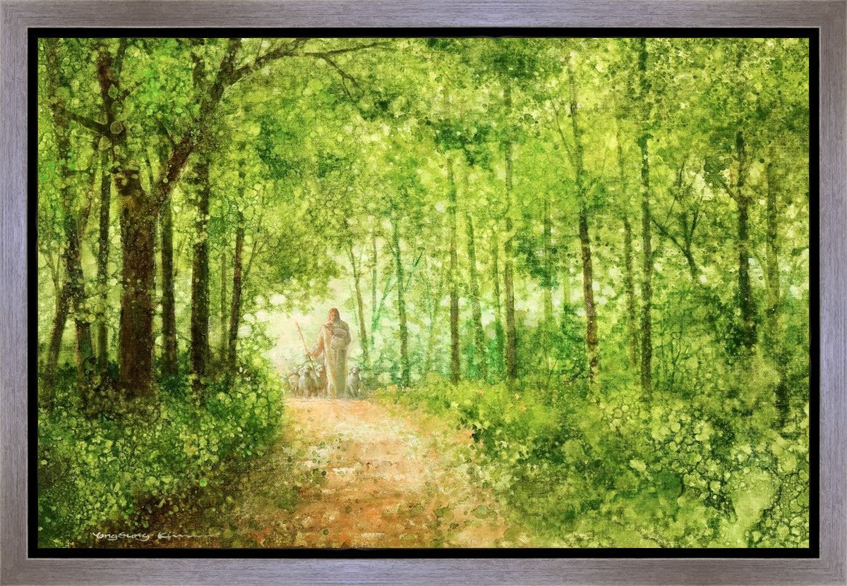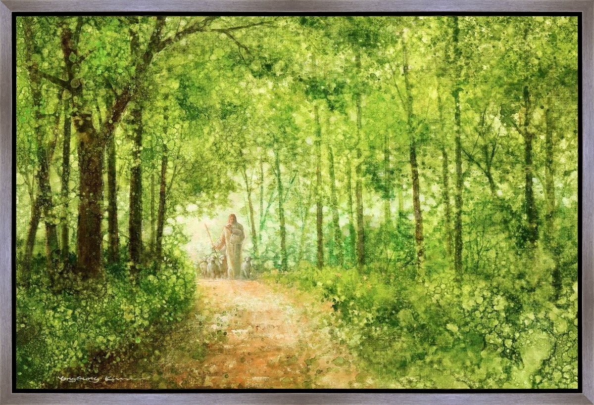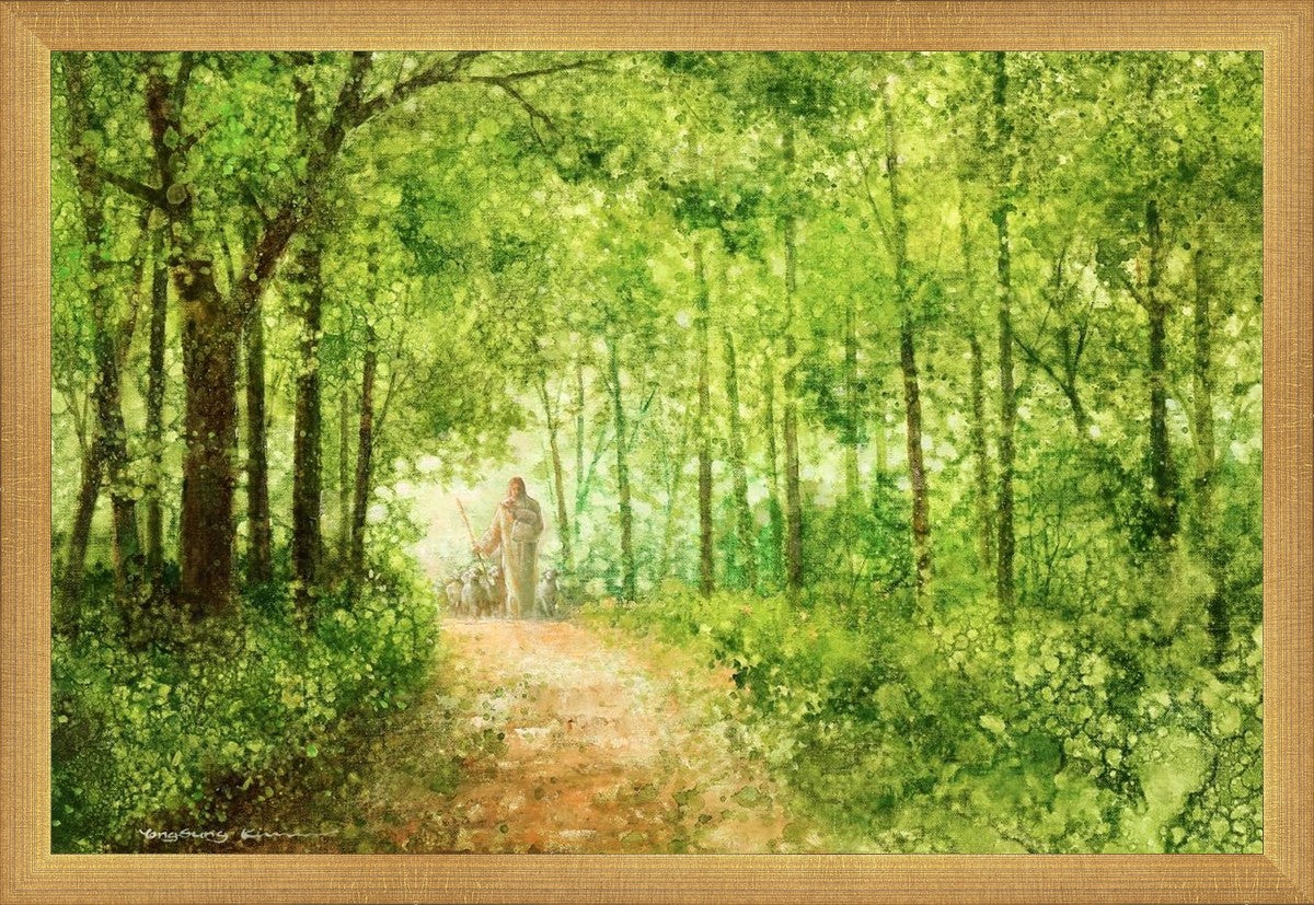 "Lead Thou Me On" by Yongsung Kim depicts Jesus Christ tenderly holding a lamb, leading a flock of sheep along a tree-lined path.