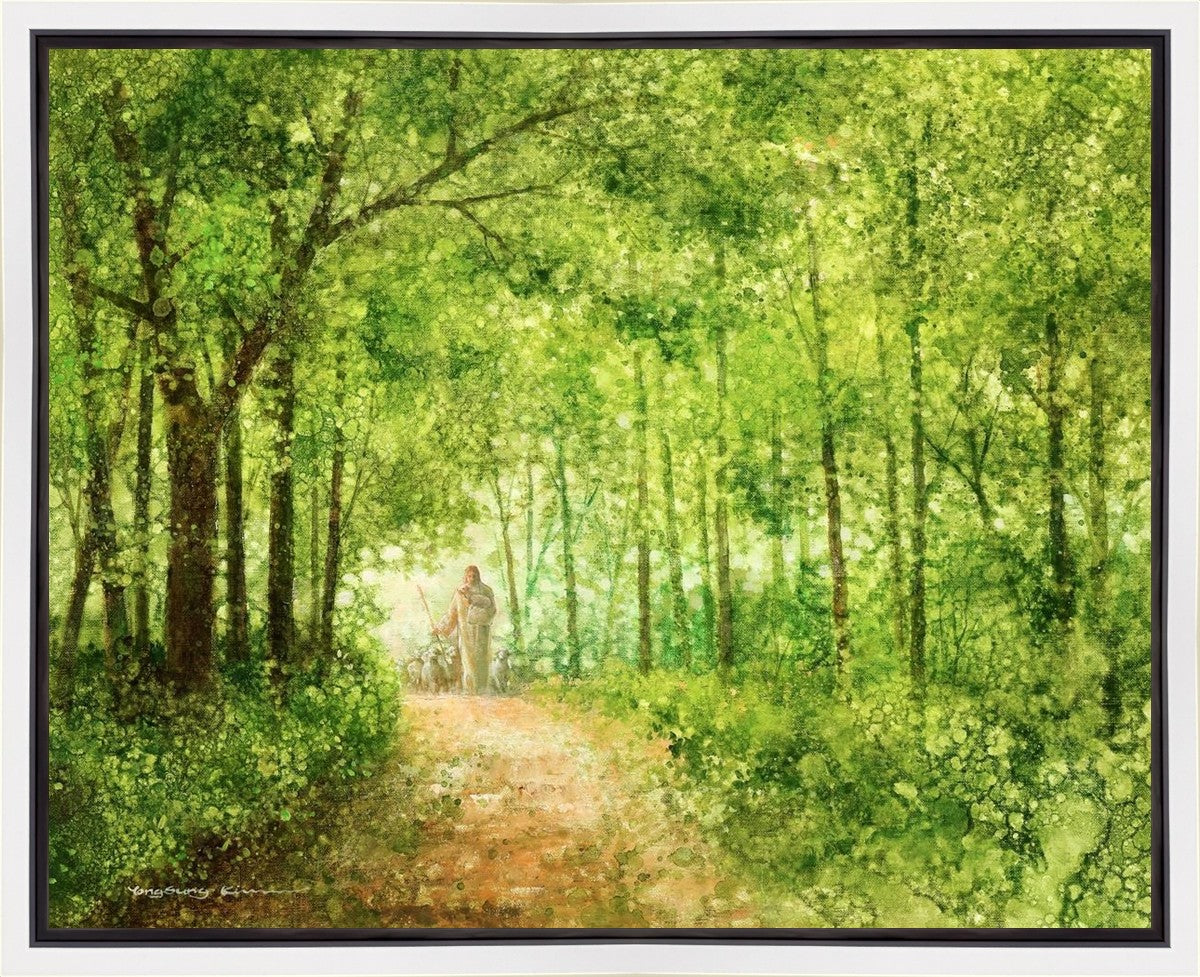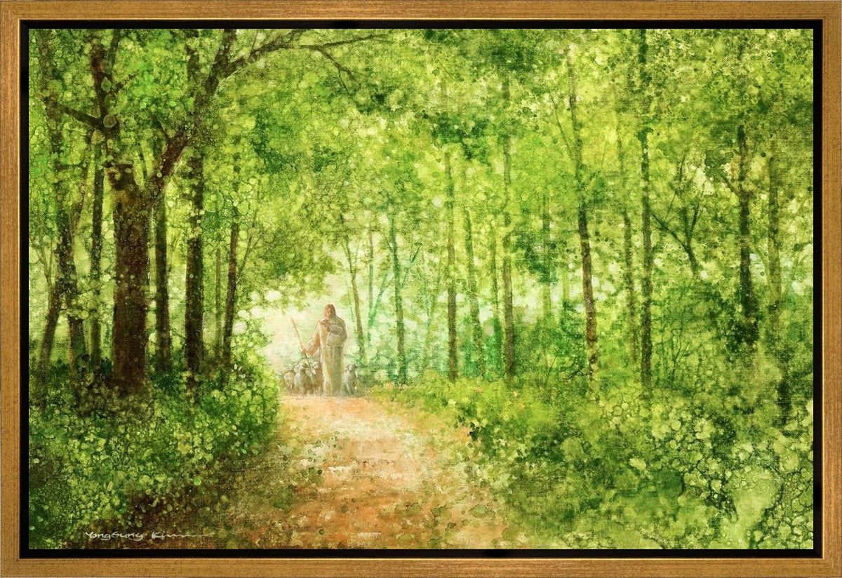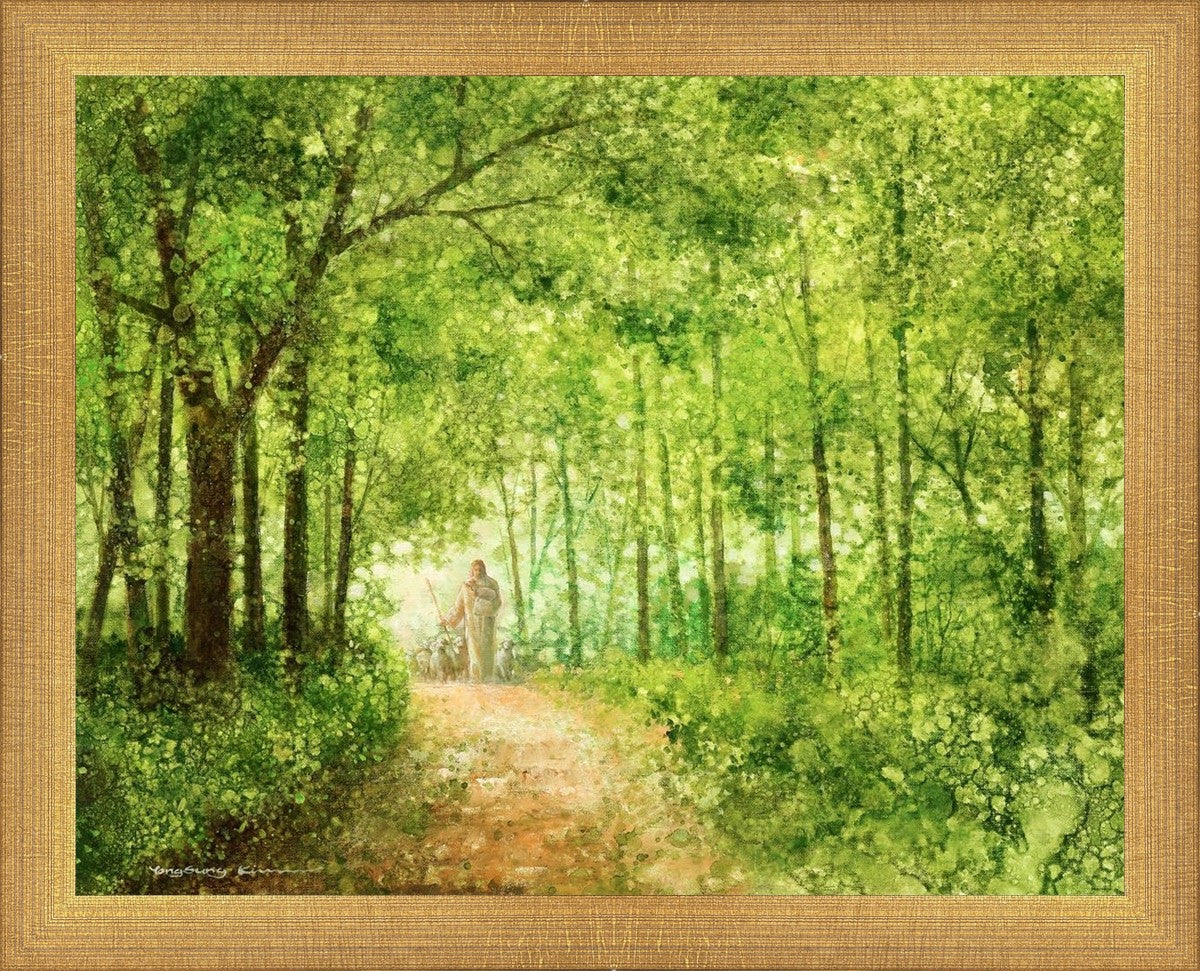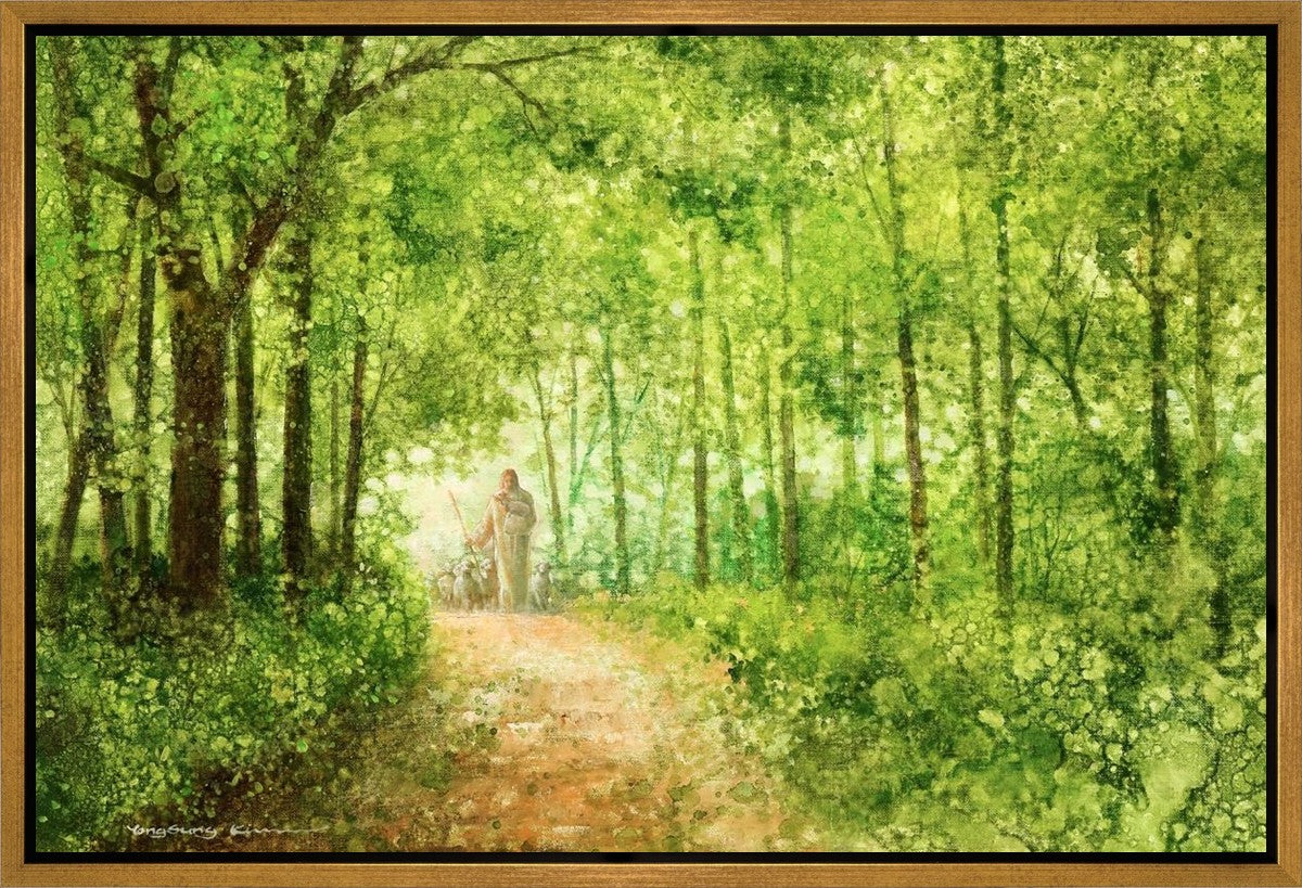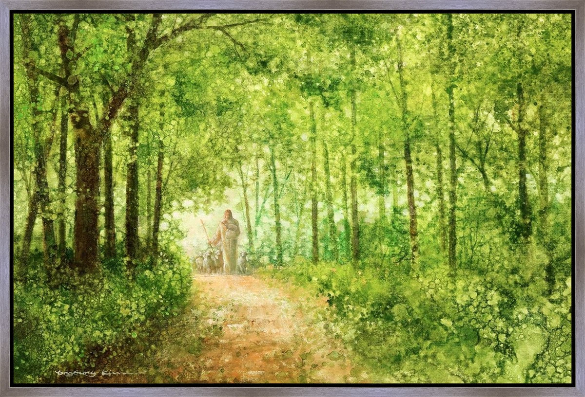 "Lead Thou Me On" by Yongsung Kim depicts Jesus Christ tenderly holding a lamb, leading a flock of sheep along a tree-lined path.