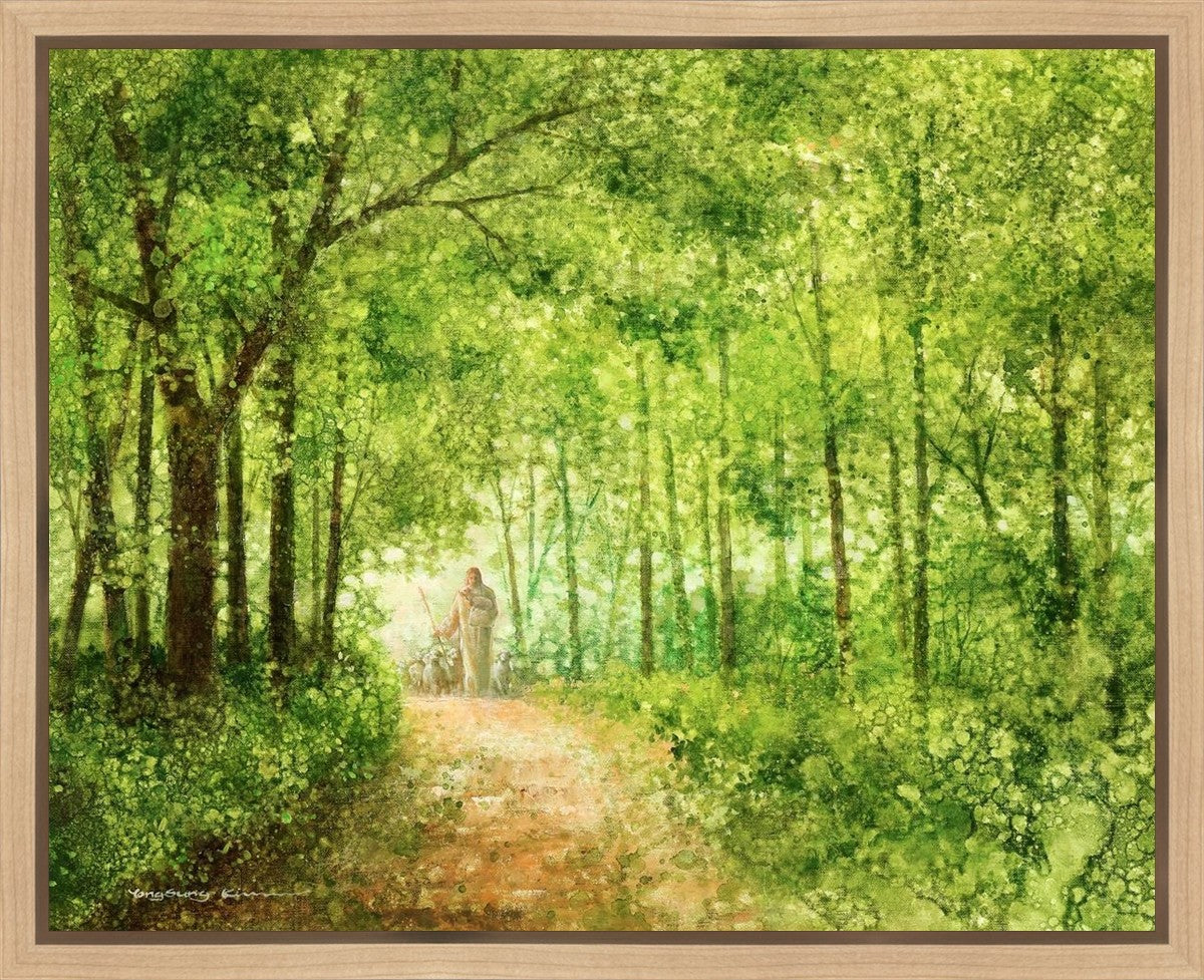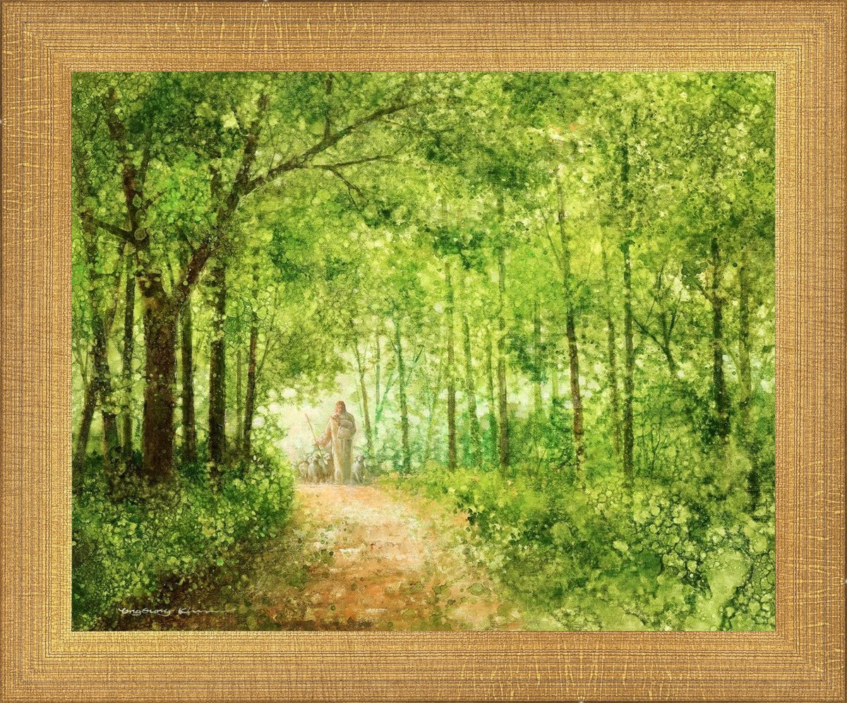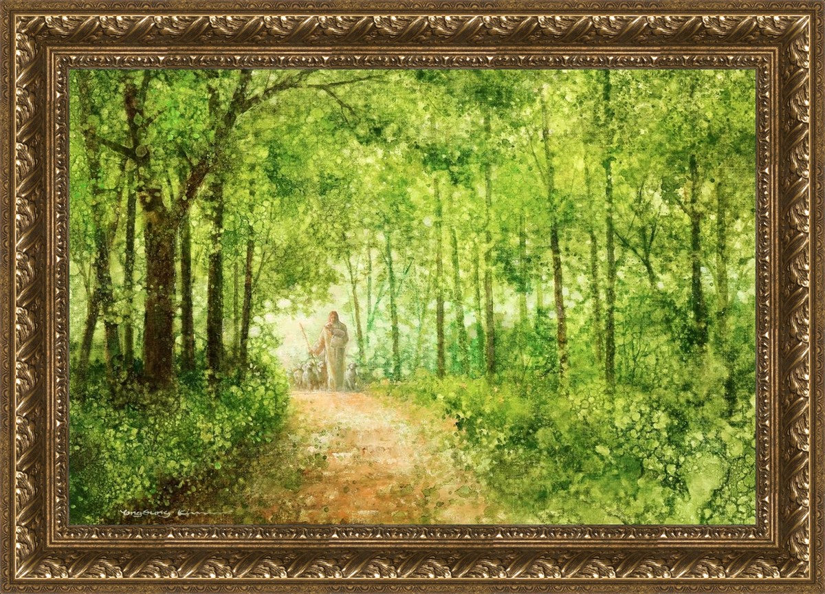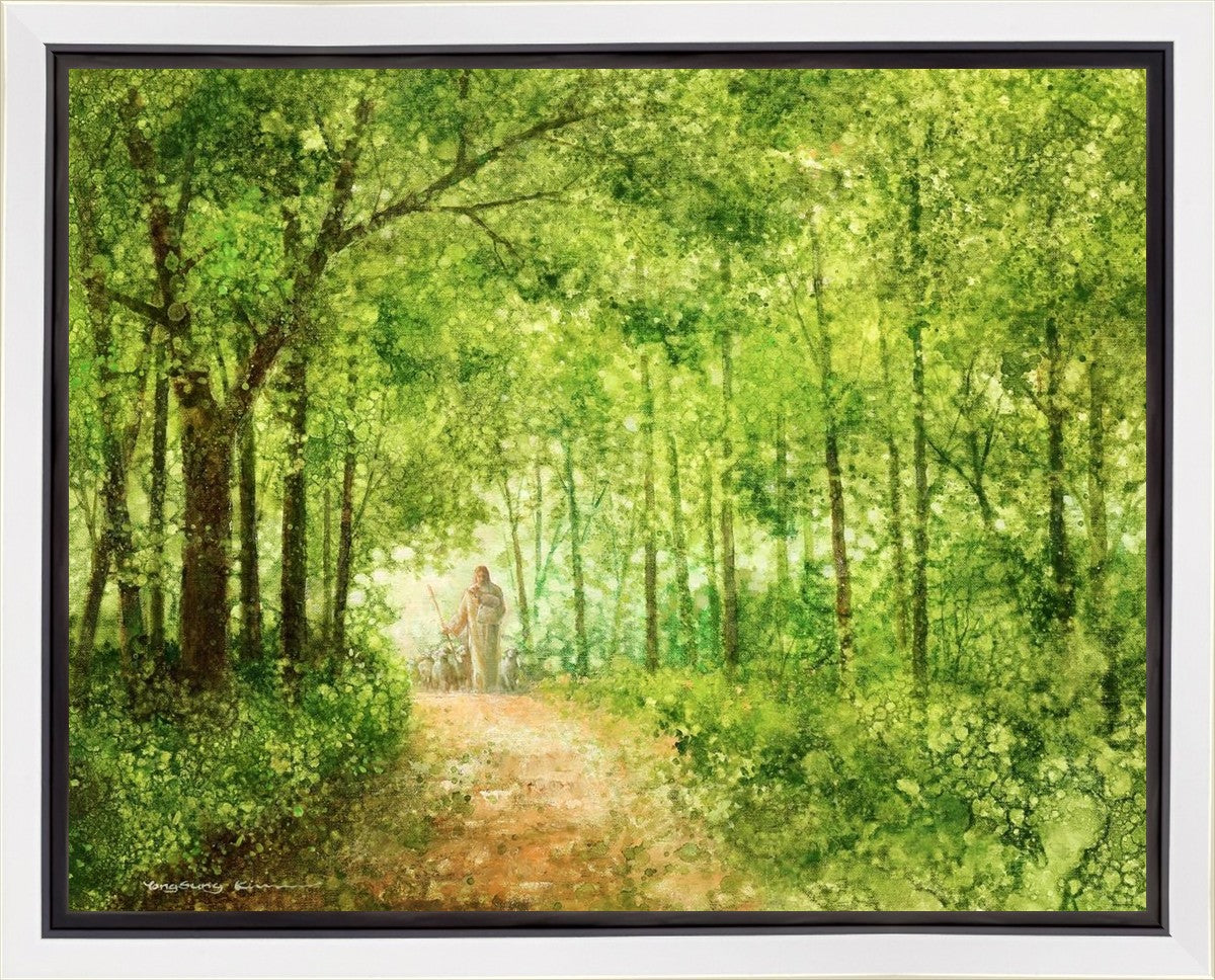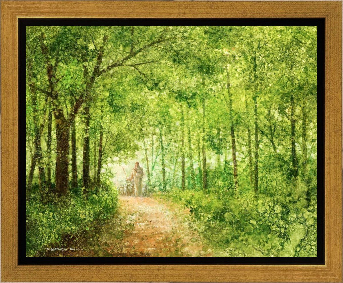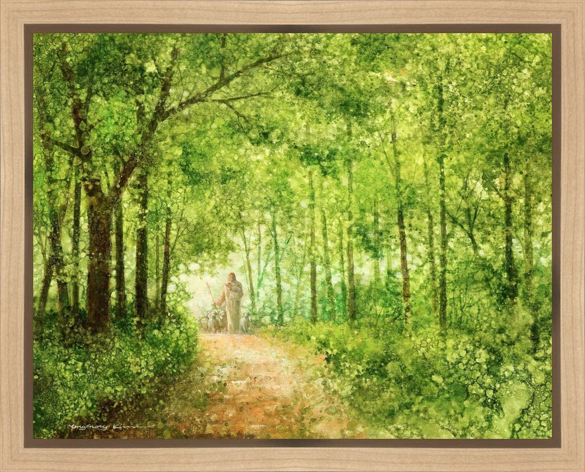 "Lead Thou Me On" by Yongsung Kim depicts Jesus Christ tenderly holding a lamb, leading a flock of sheep along a tree-lined path.