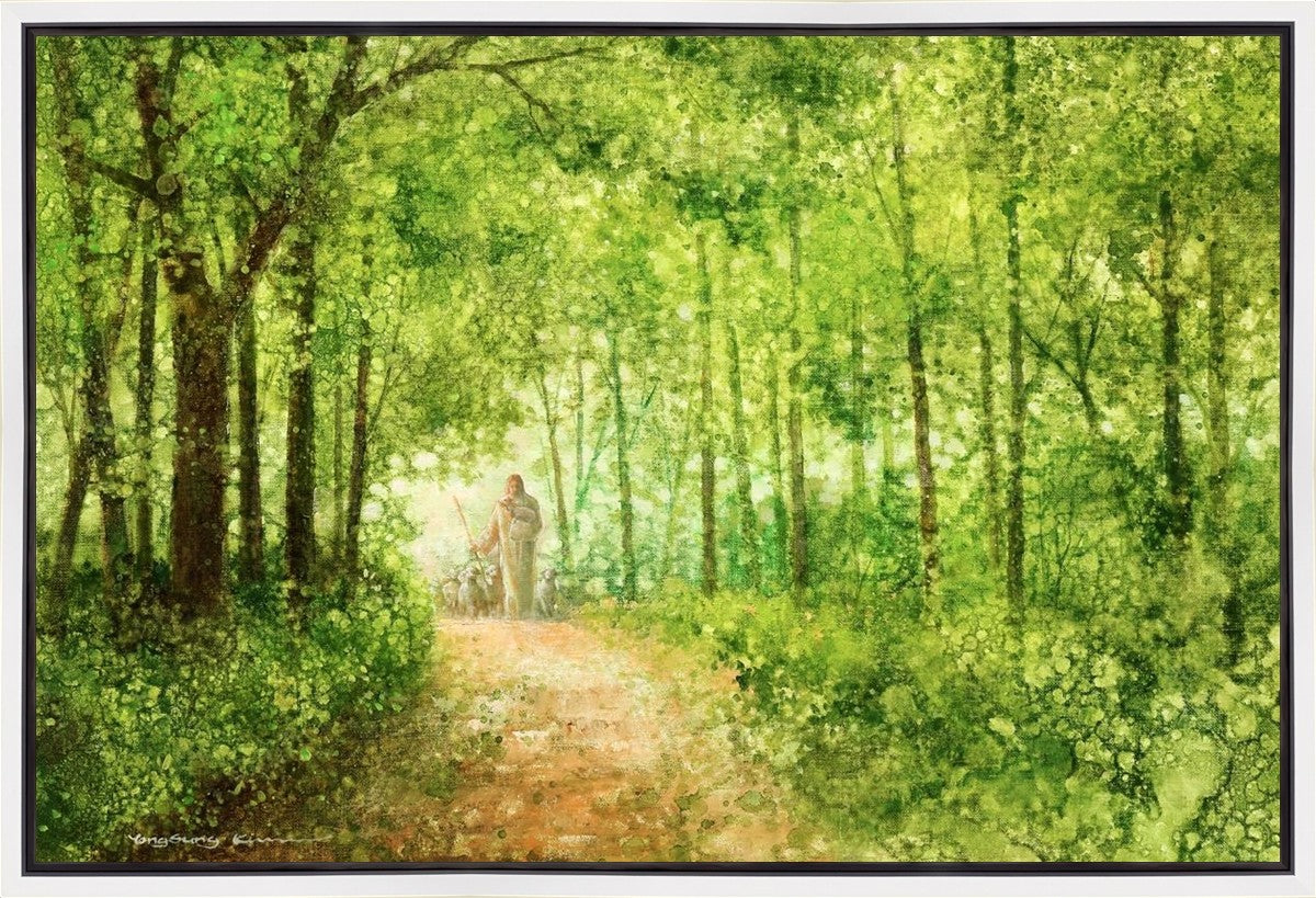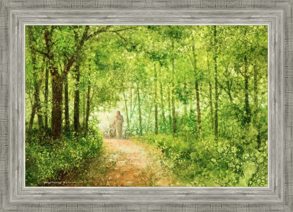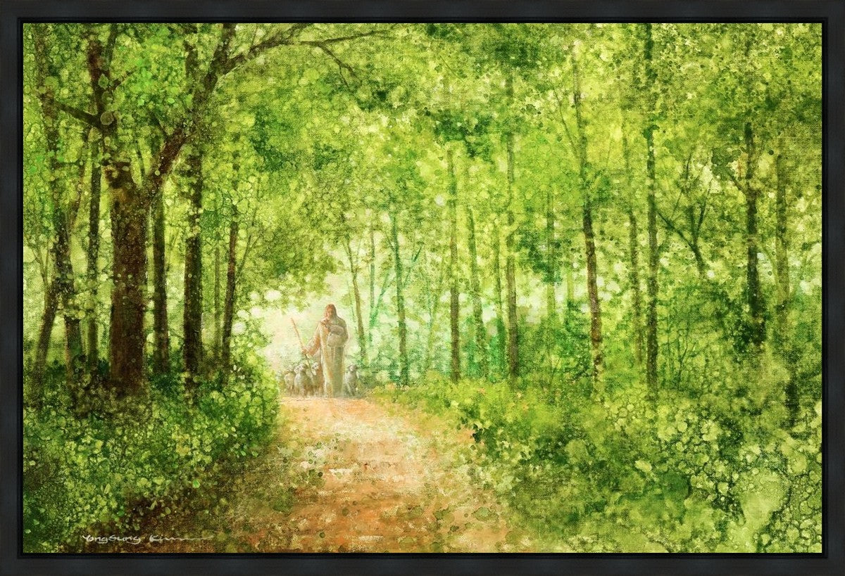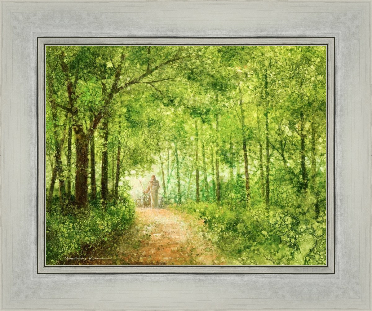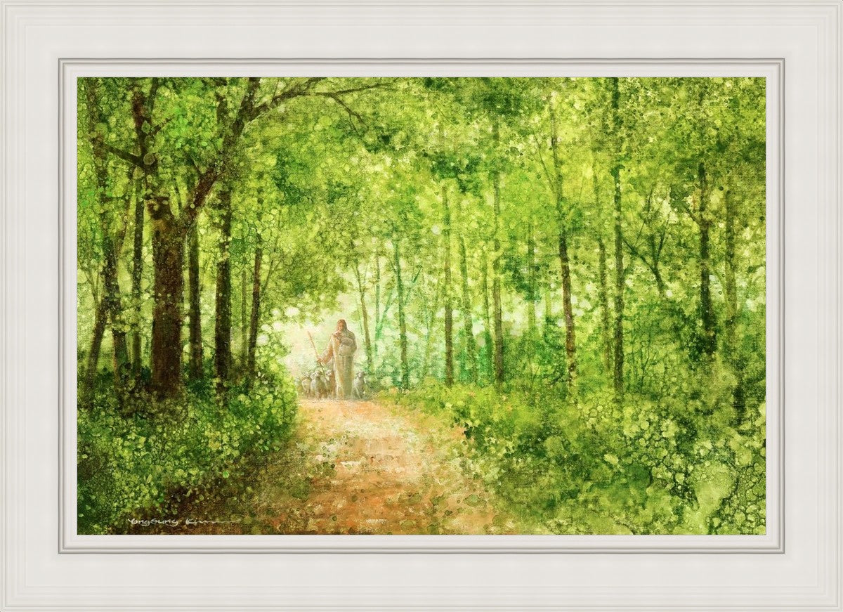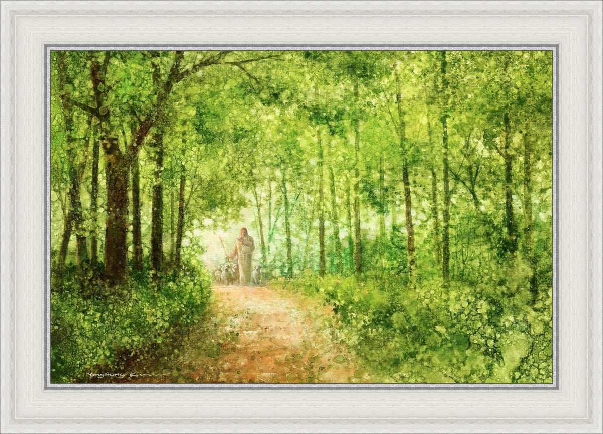 "Lead Thou Me On" by Yongsung Kim depicts Jesus Christ tenderly holding a lamb, leading a flock of sheep along a tree-lined path.