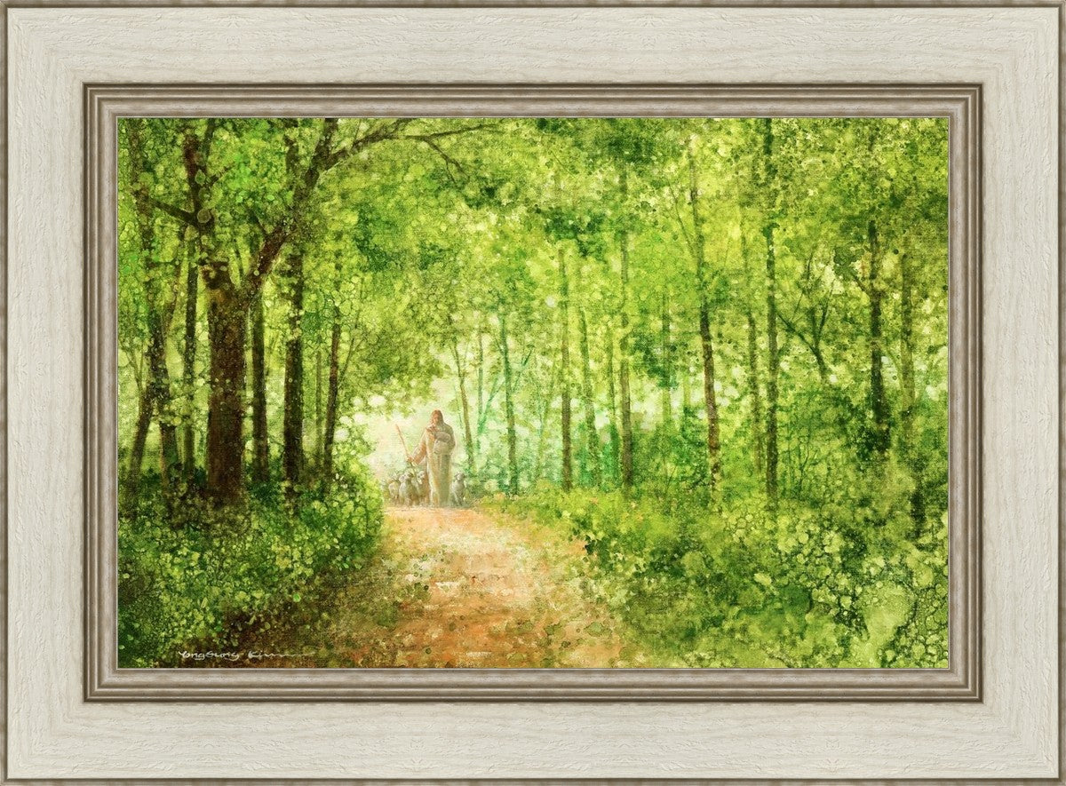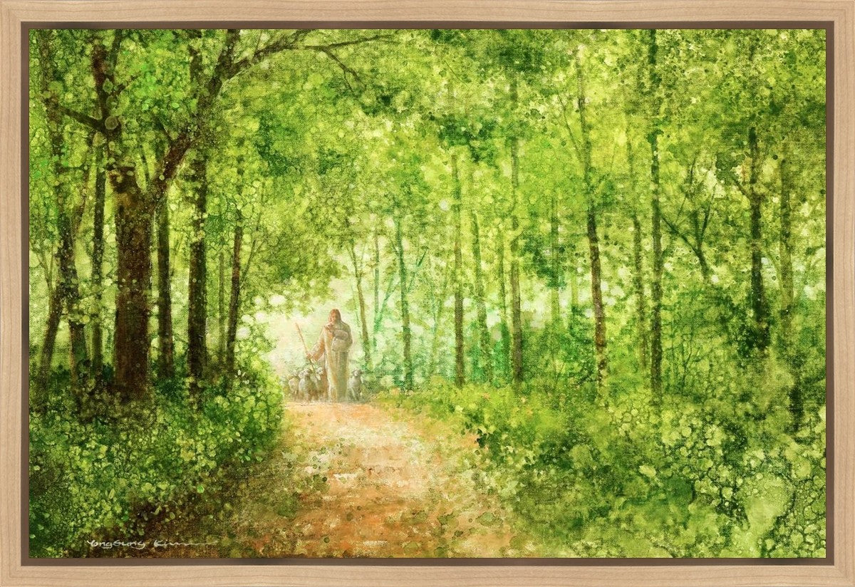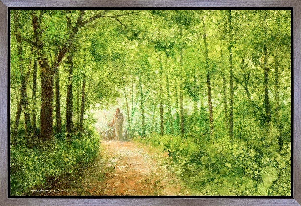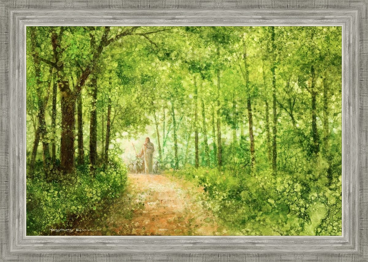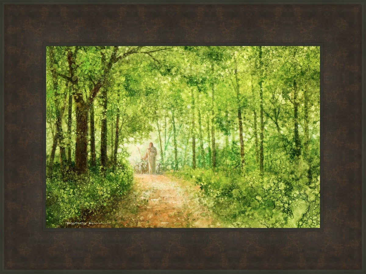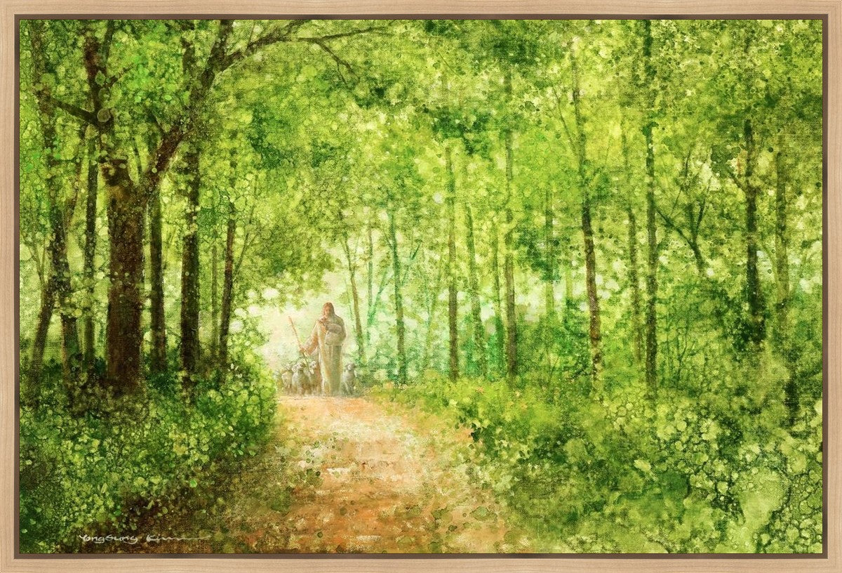 "Lead Thou Me On" by Yongsung Kim depicts Jesus Christ tenderly holding a lamb, leading a flock of sheep along a tree-lined path.