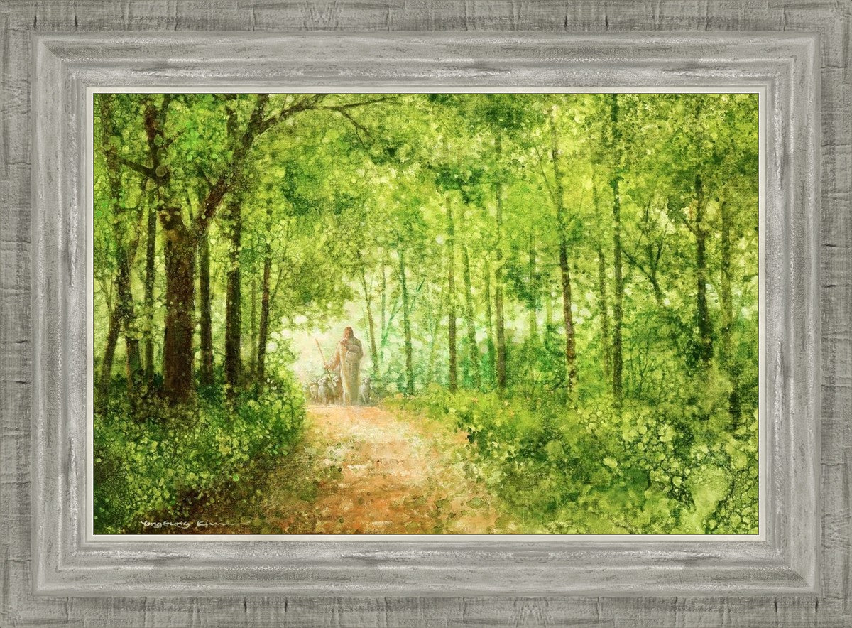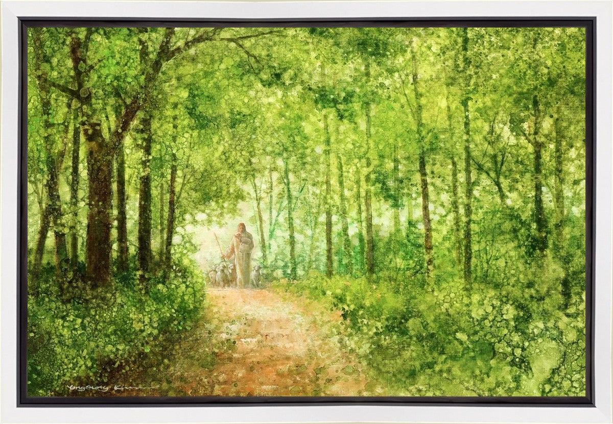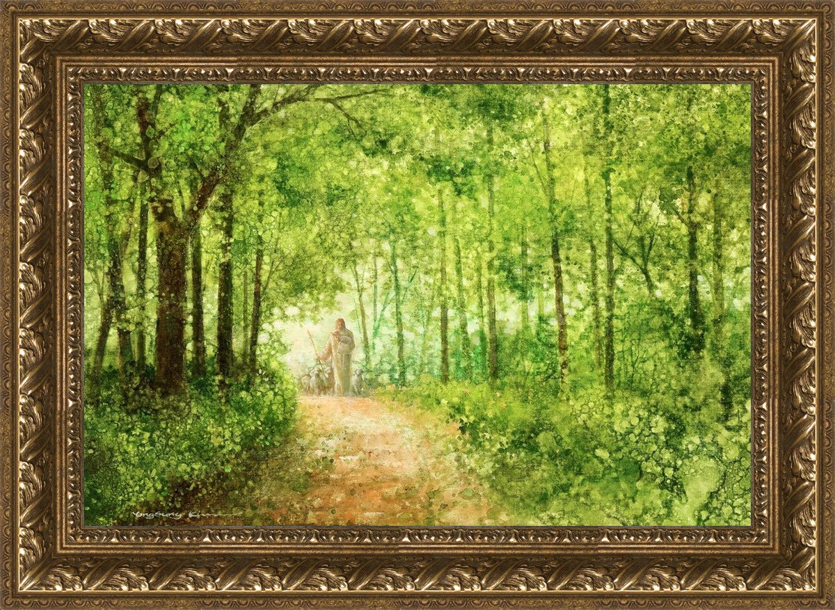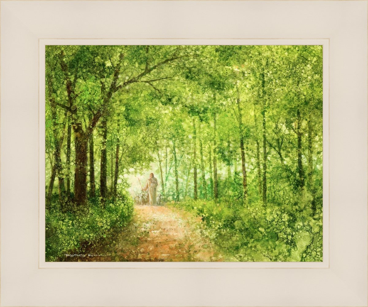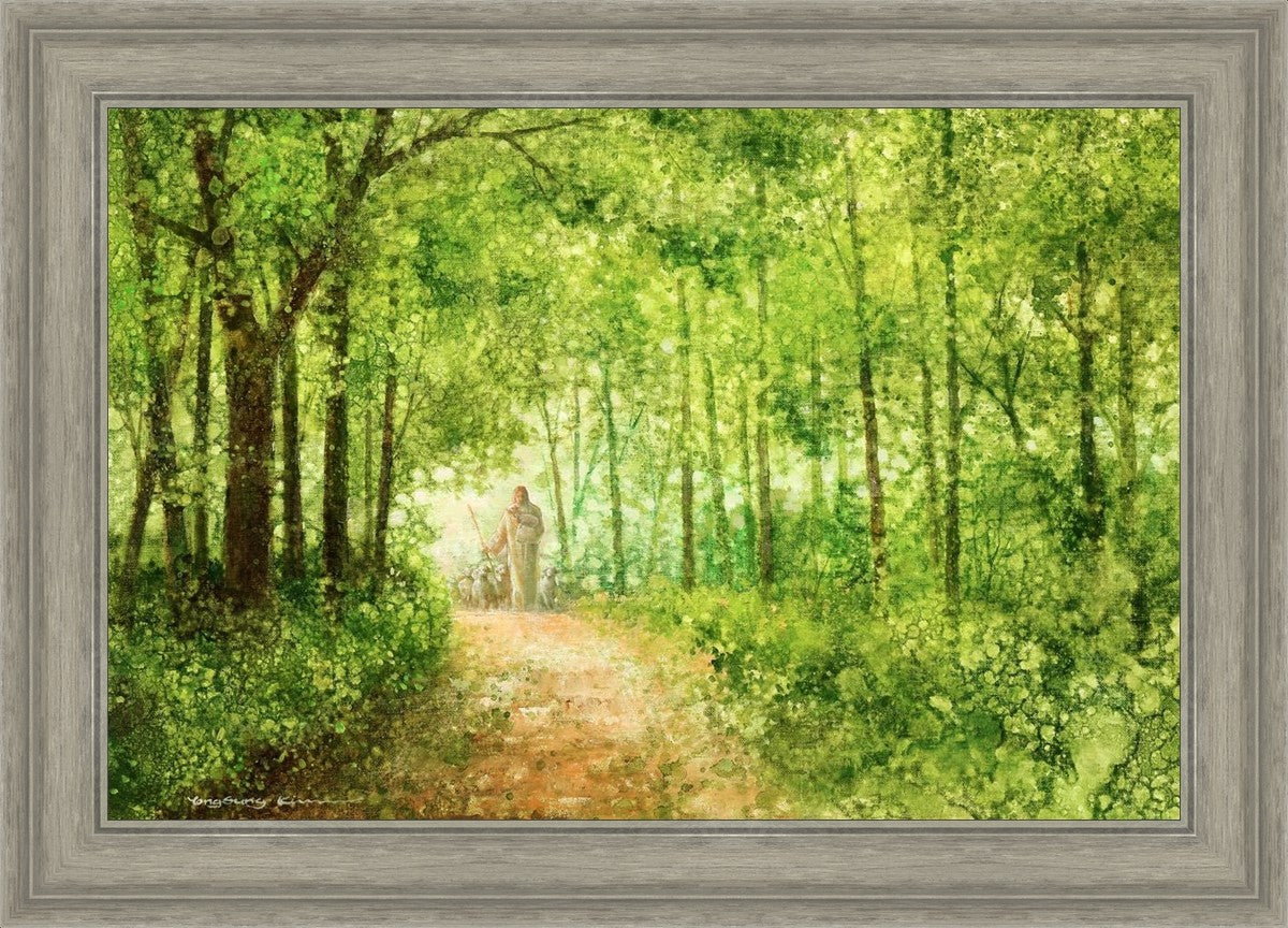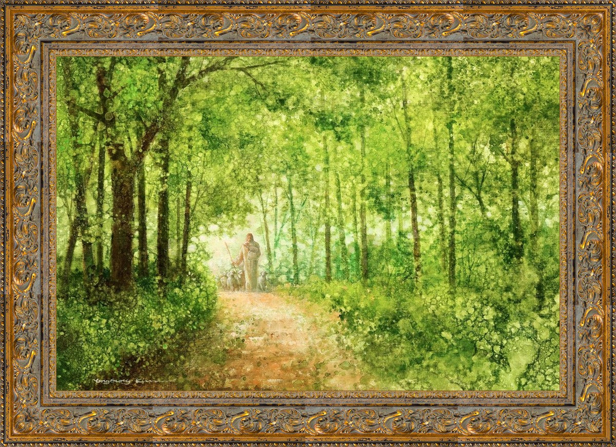 "Lead Thou Me On" by Yongsung Kim depicts Jesus Christ tenderly holding a lamb, leading a flock of sheep along a tree-lined path.