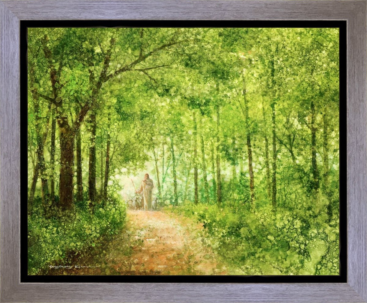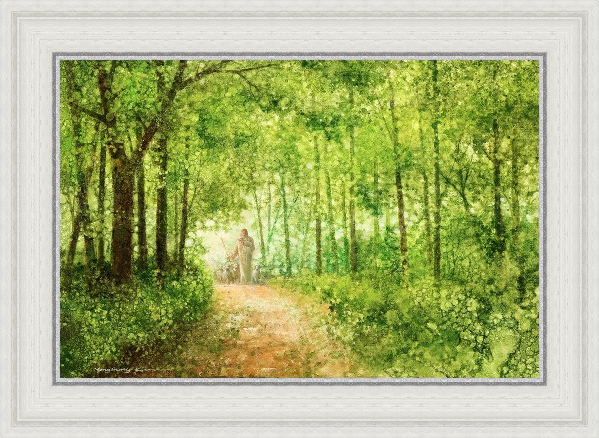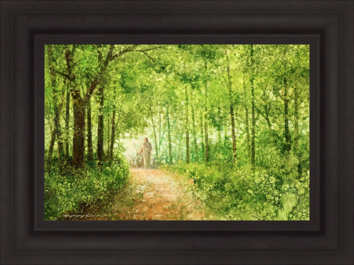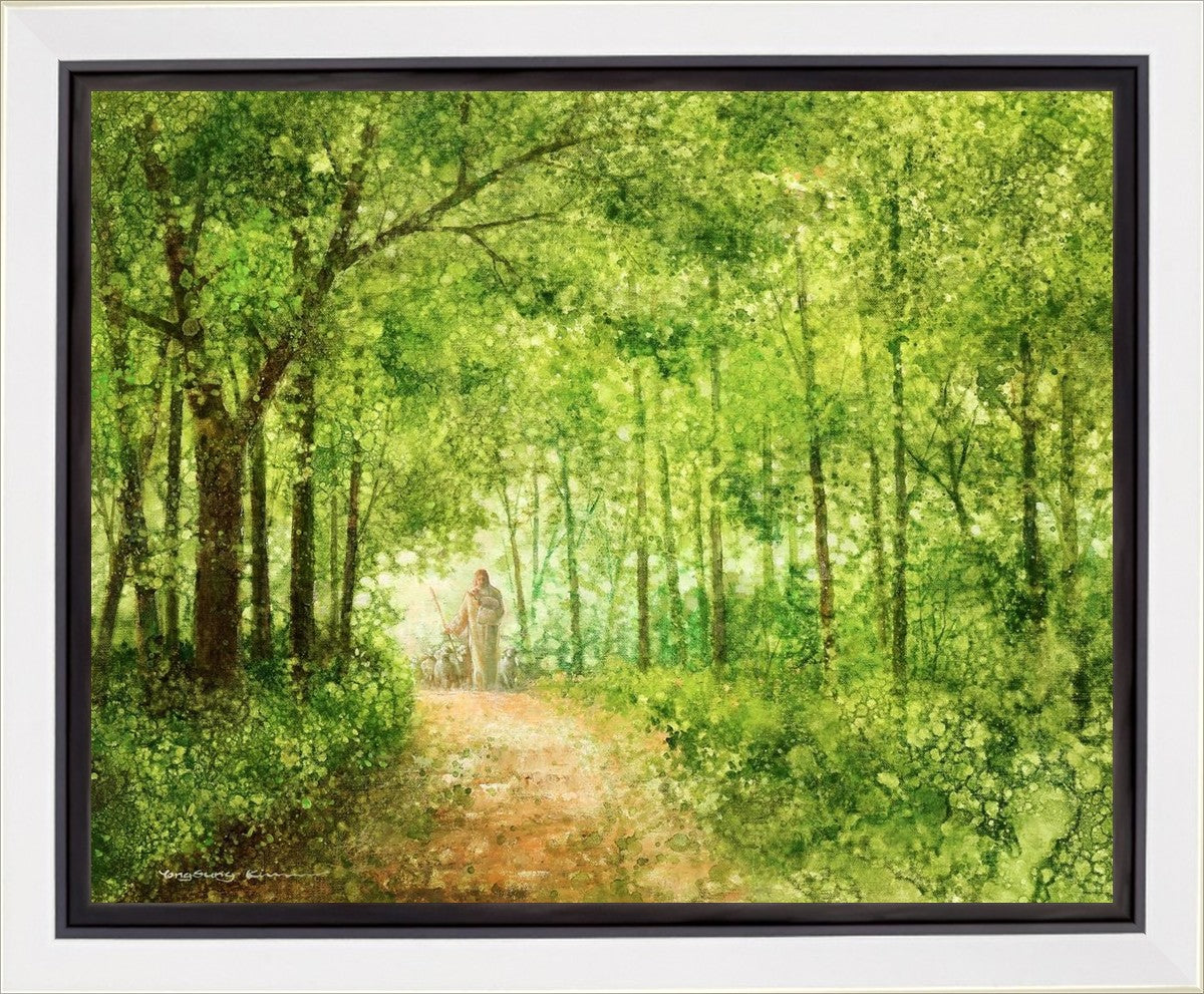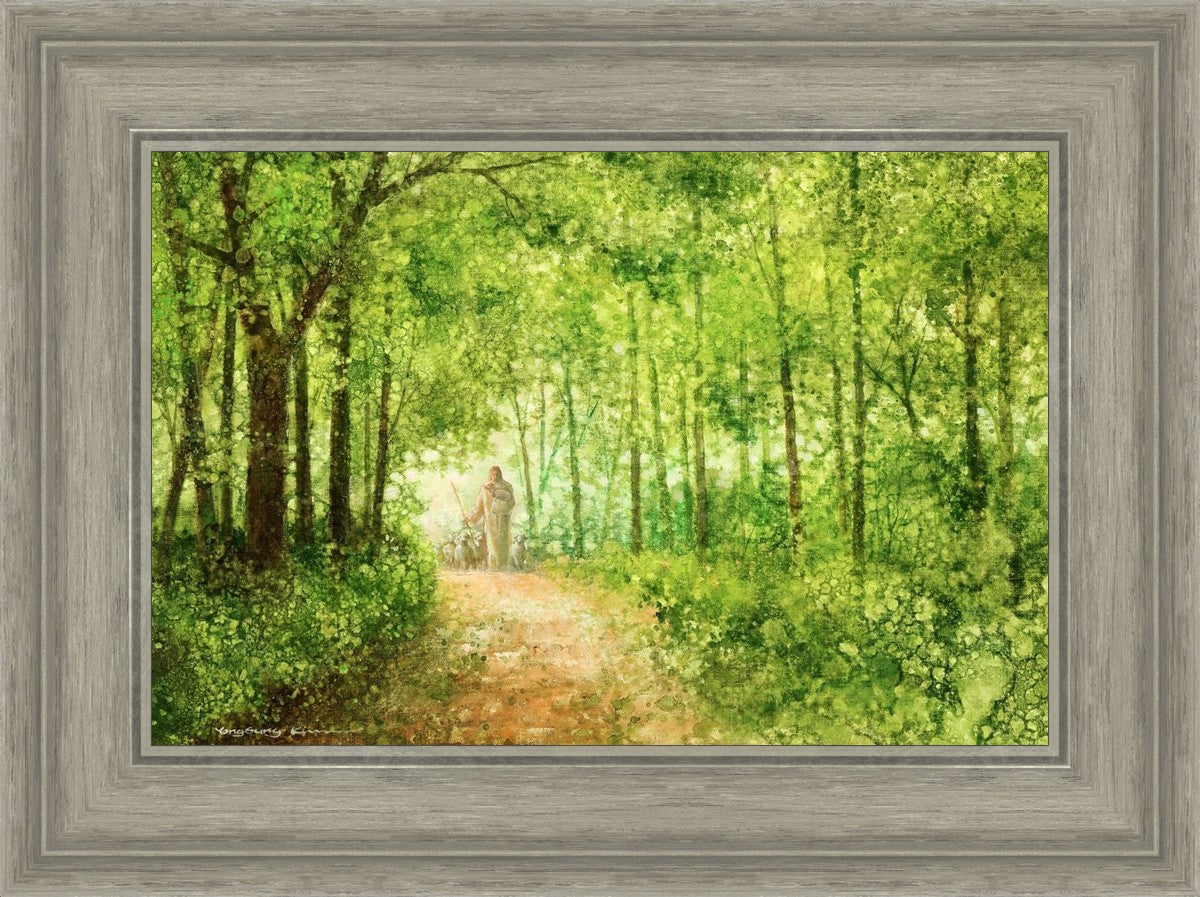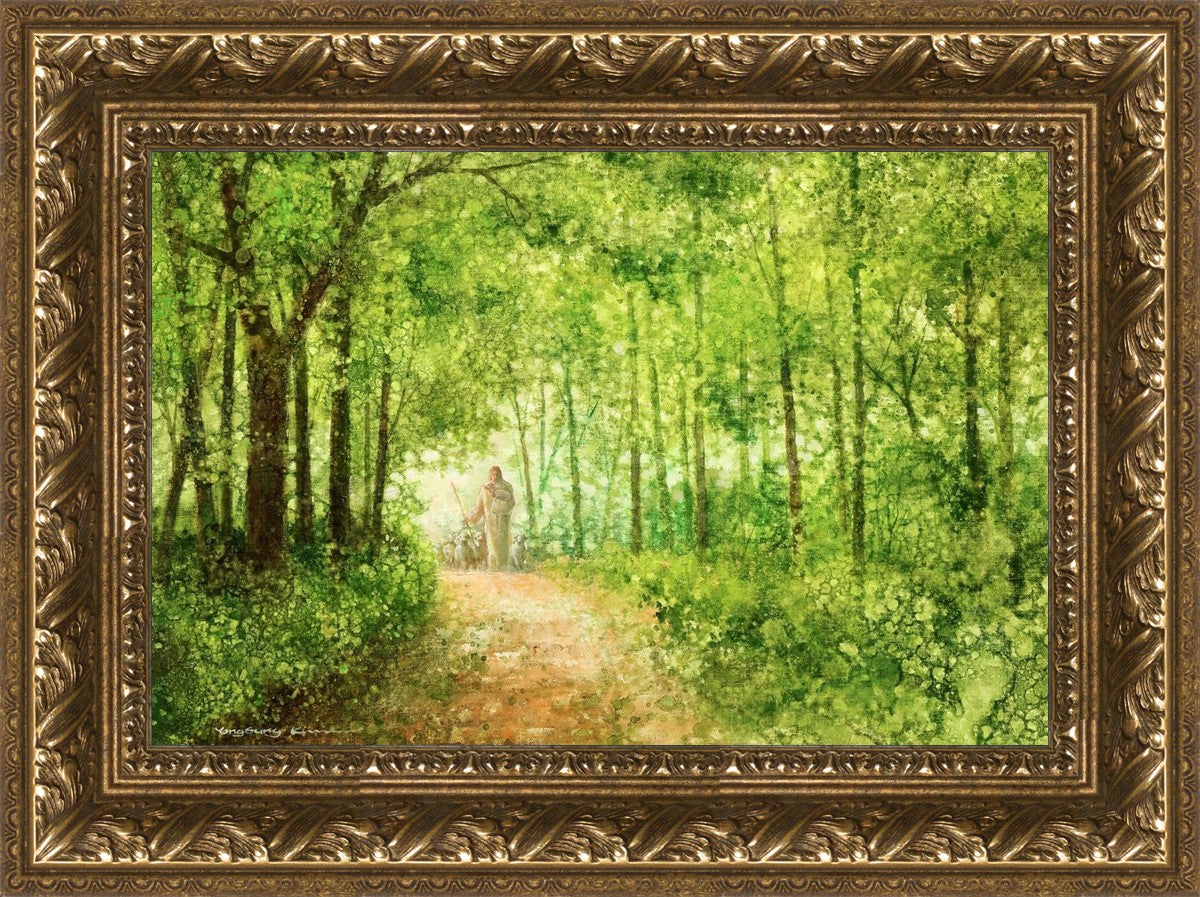 "Lead Thou Me On" by Yongsung Kim depicts Jesus Christ tenderly holding a lamb, leading a flock of sheep along a tree-lined path.